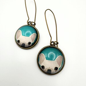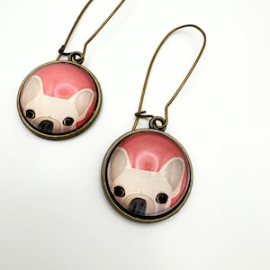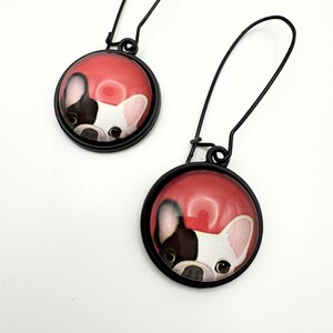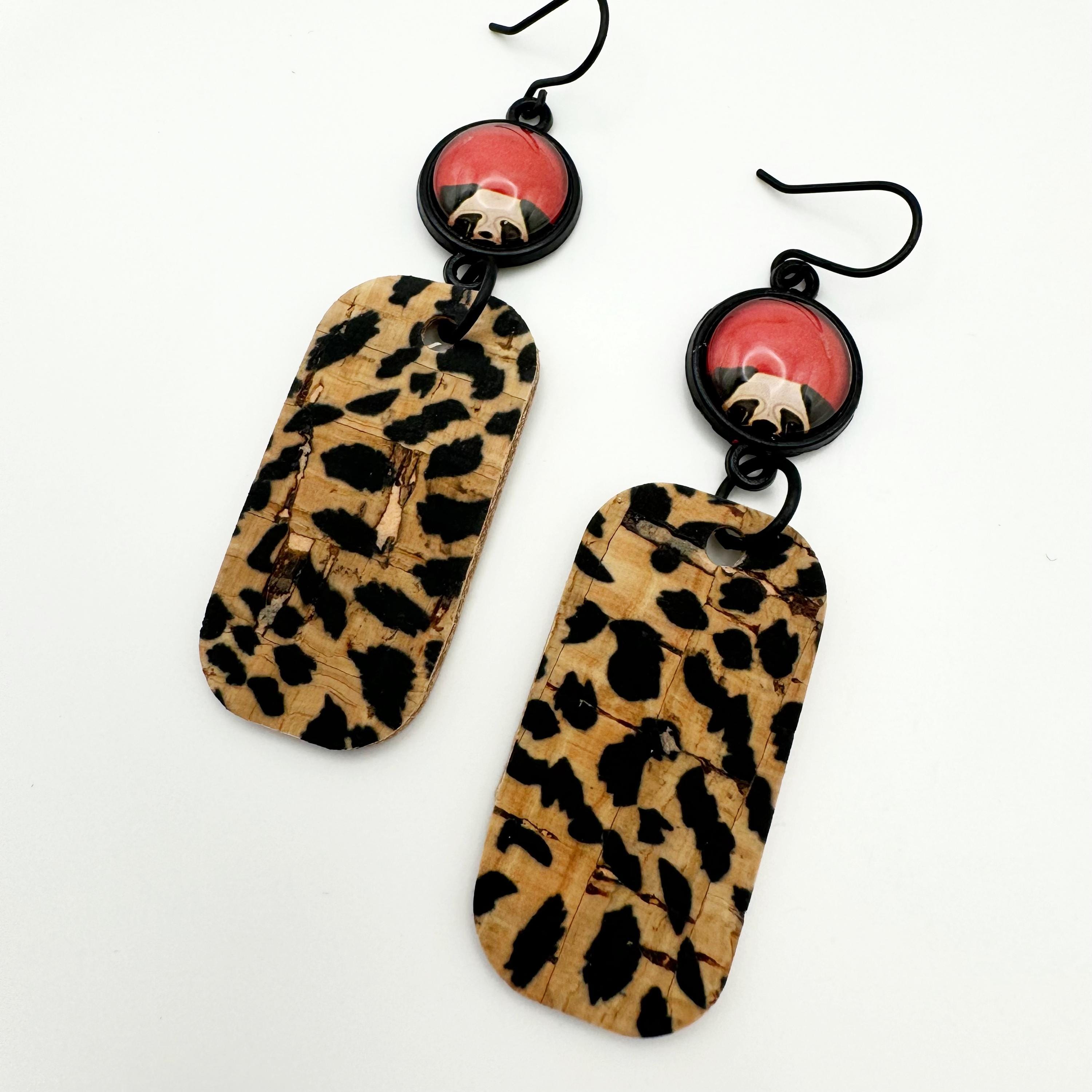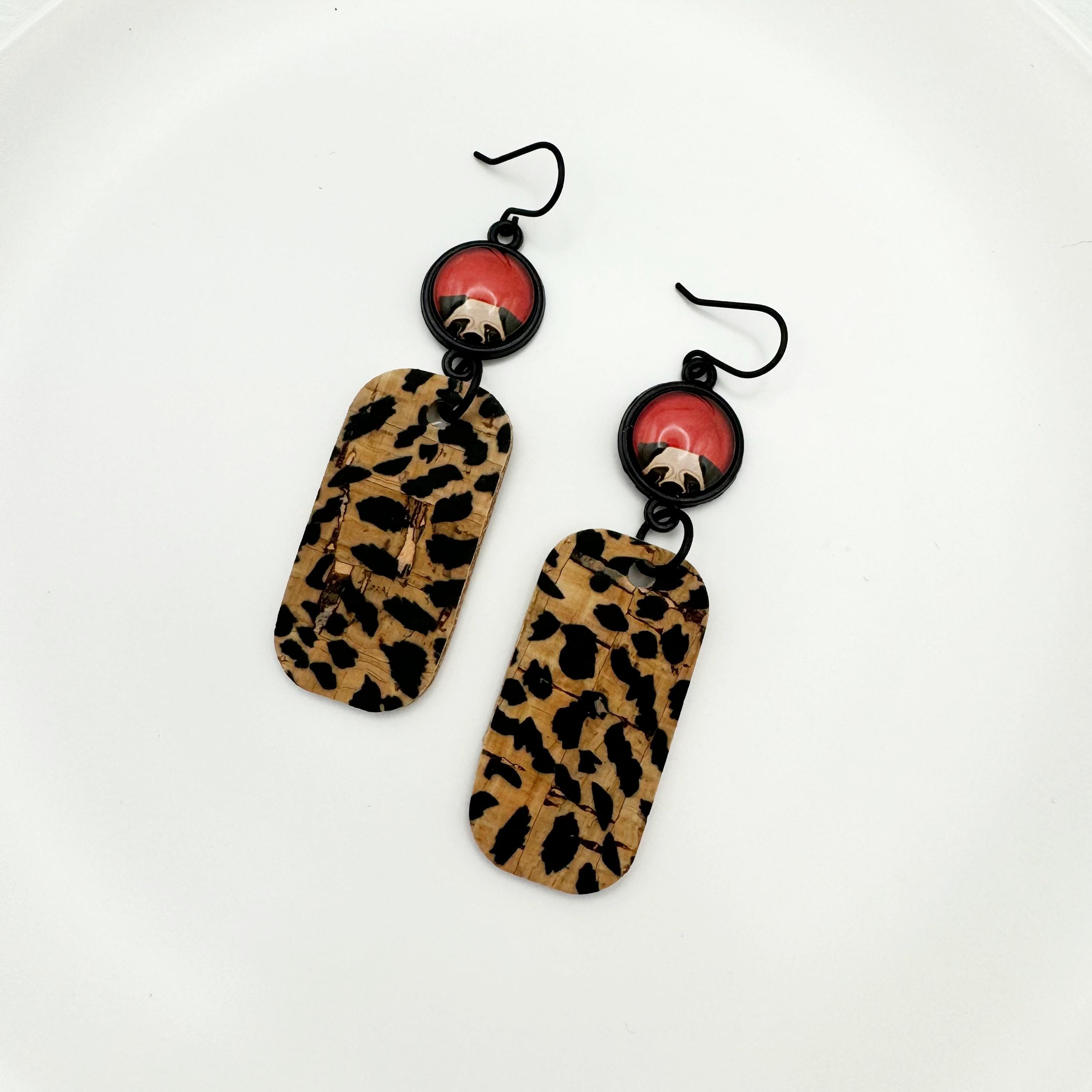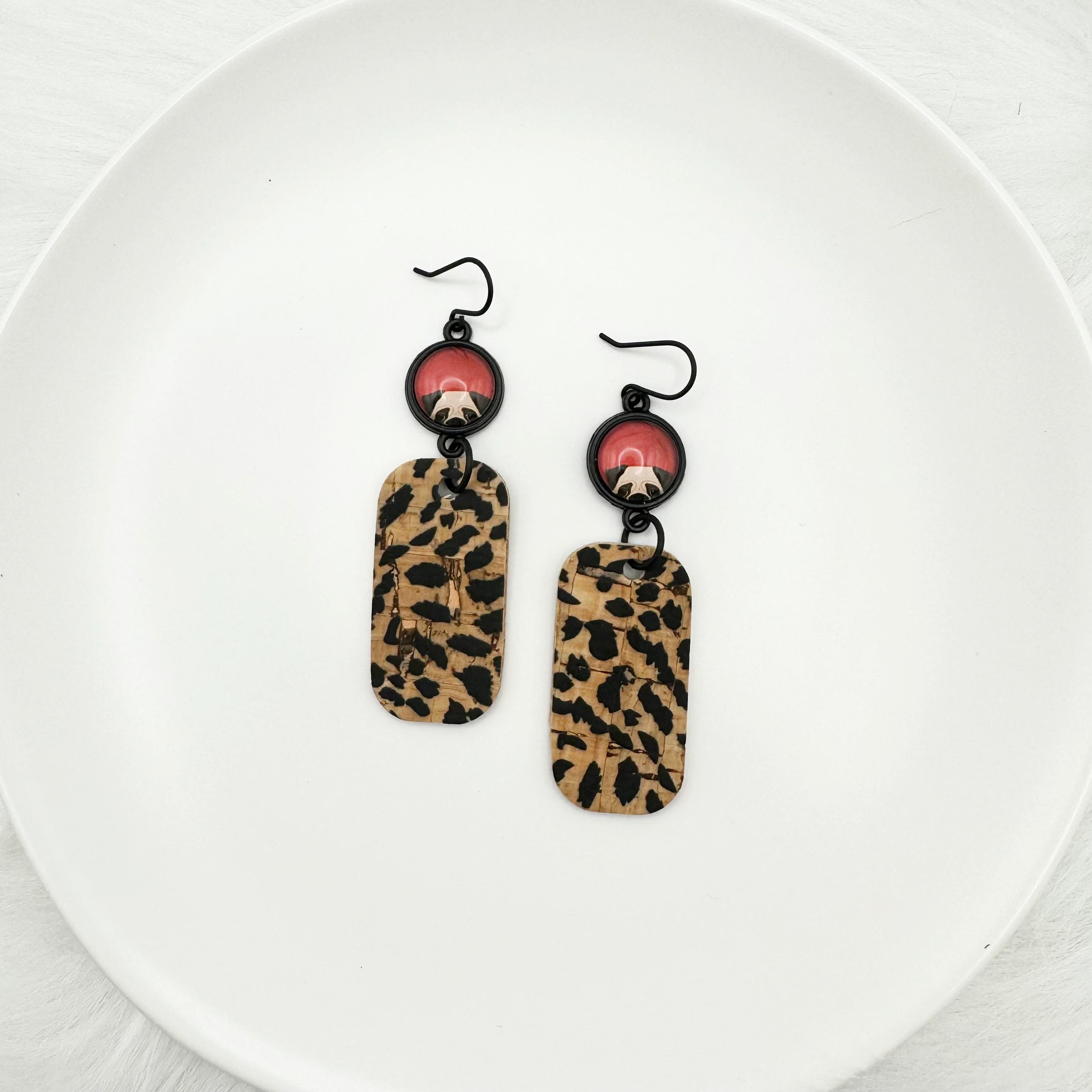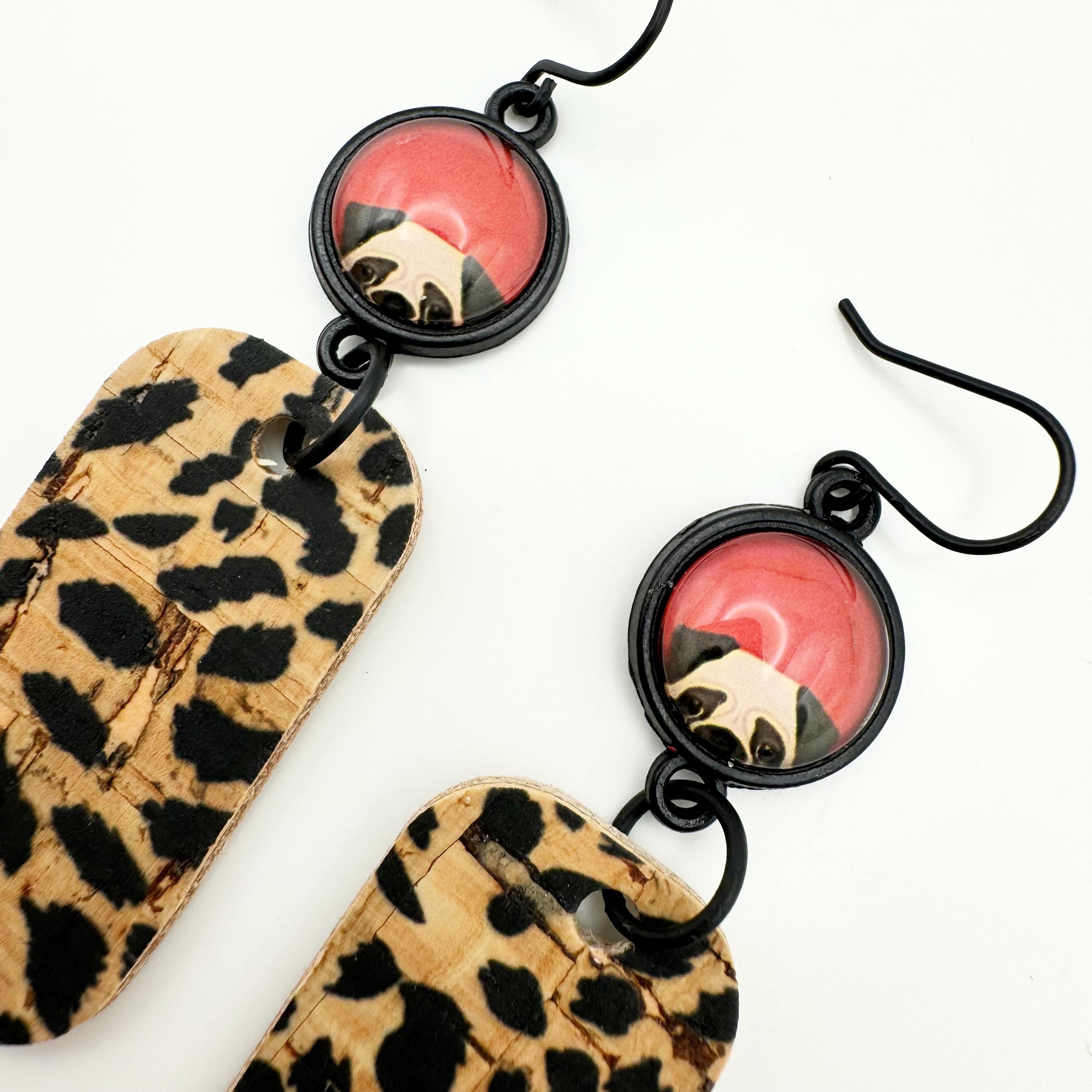 The earrings are made with a matte black hook and an 12mm glass cabochon on a black setting. You've got your adorable black and tan pug dog peeking out with a red background with an attached rounded rectangular cork in a black and natural polka dot leopard print. These are way too cute and hang 2.5 inches!