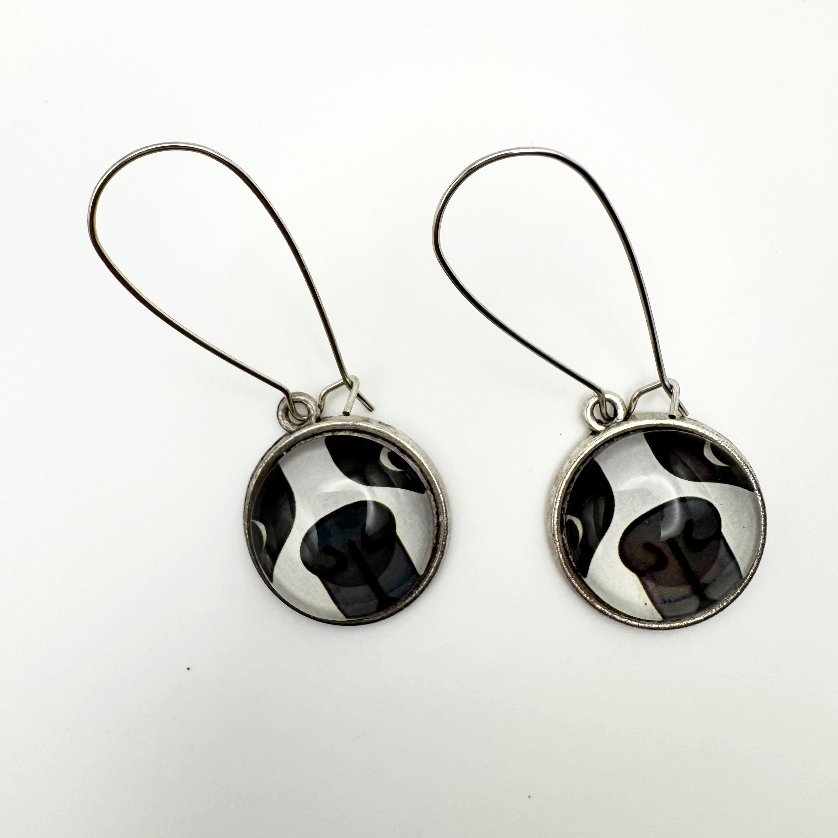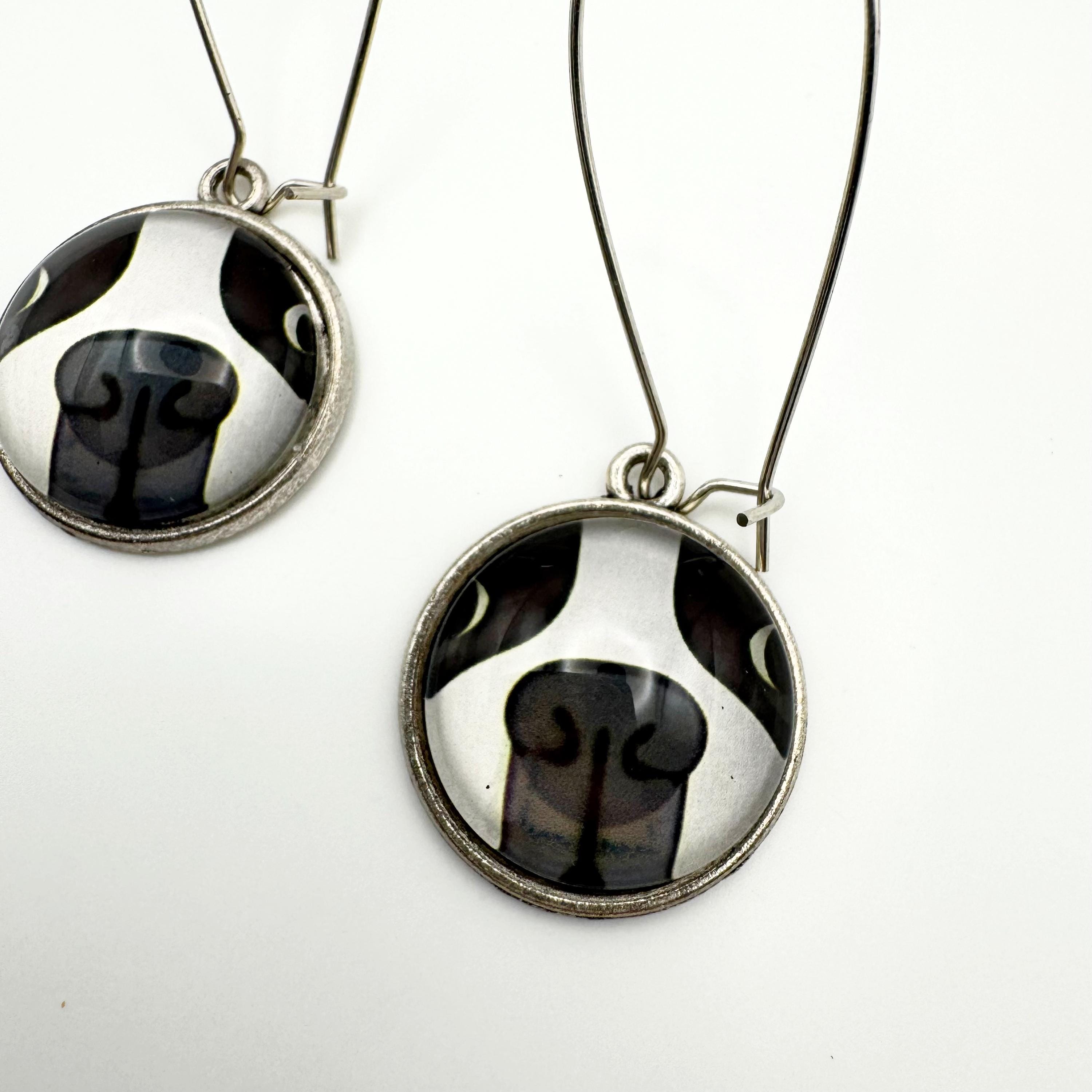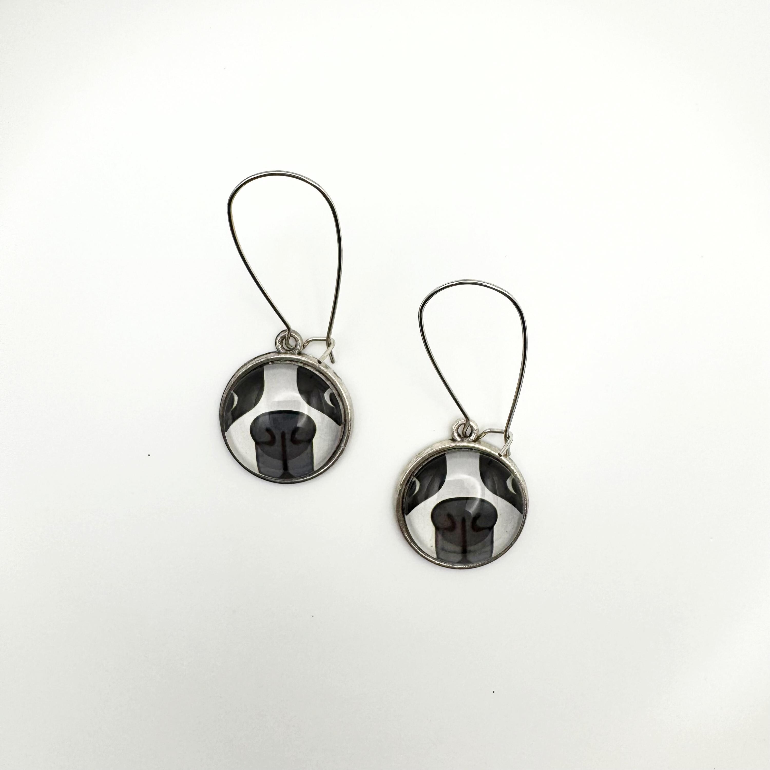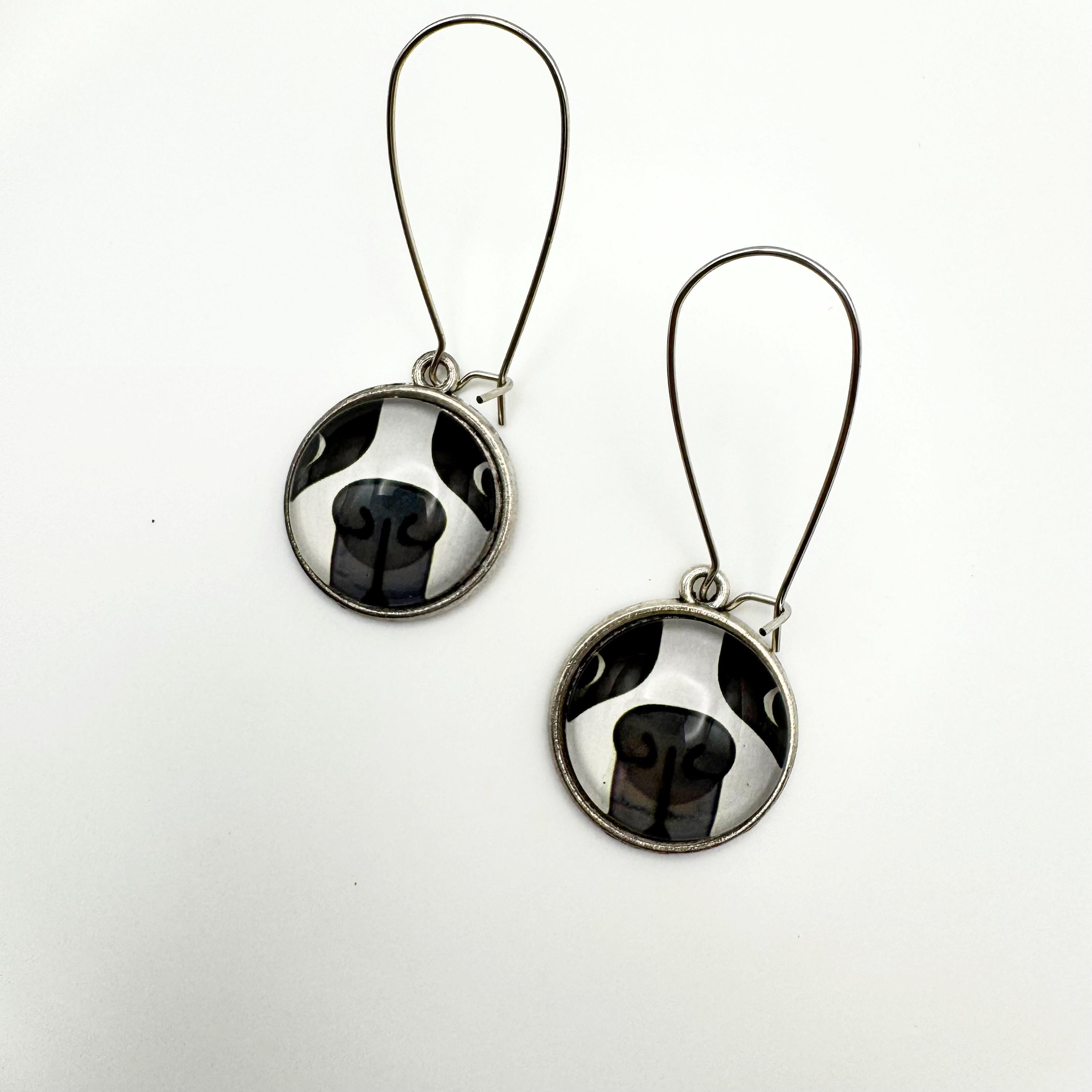 The earrings are made with an antiqued silver 35mm kidney hook and an 18mm glass cabochon on a silver setting. You've got your adorable black and gray, wet nose dog peeking out. These are way too cute and hang 2 inches!