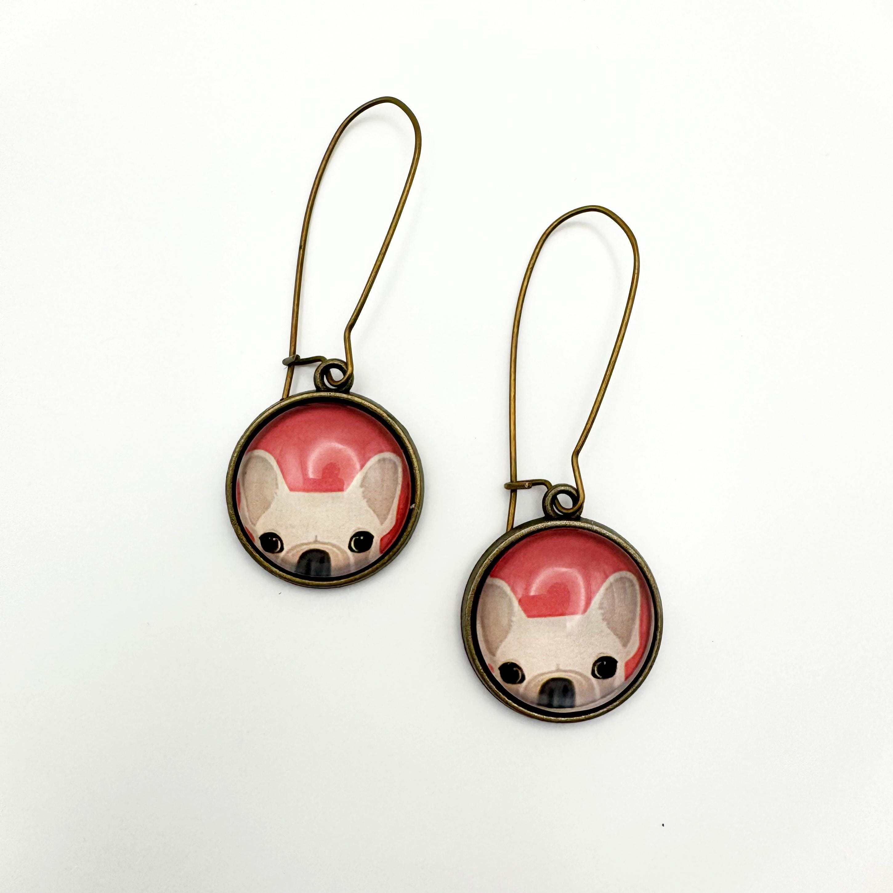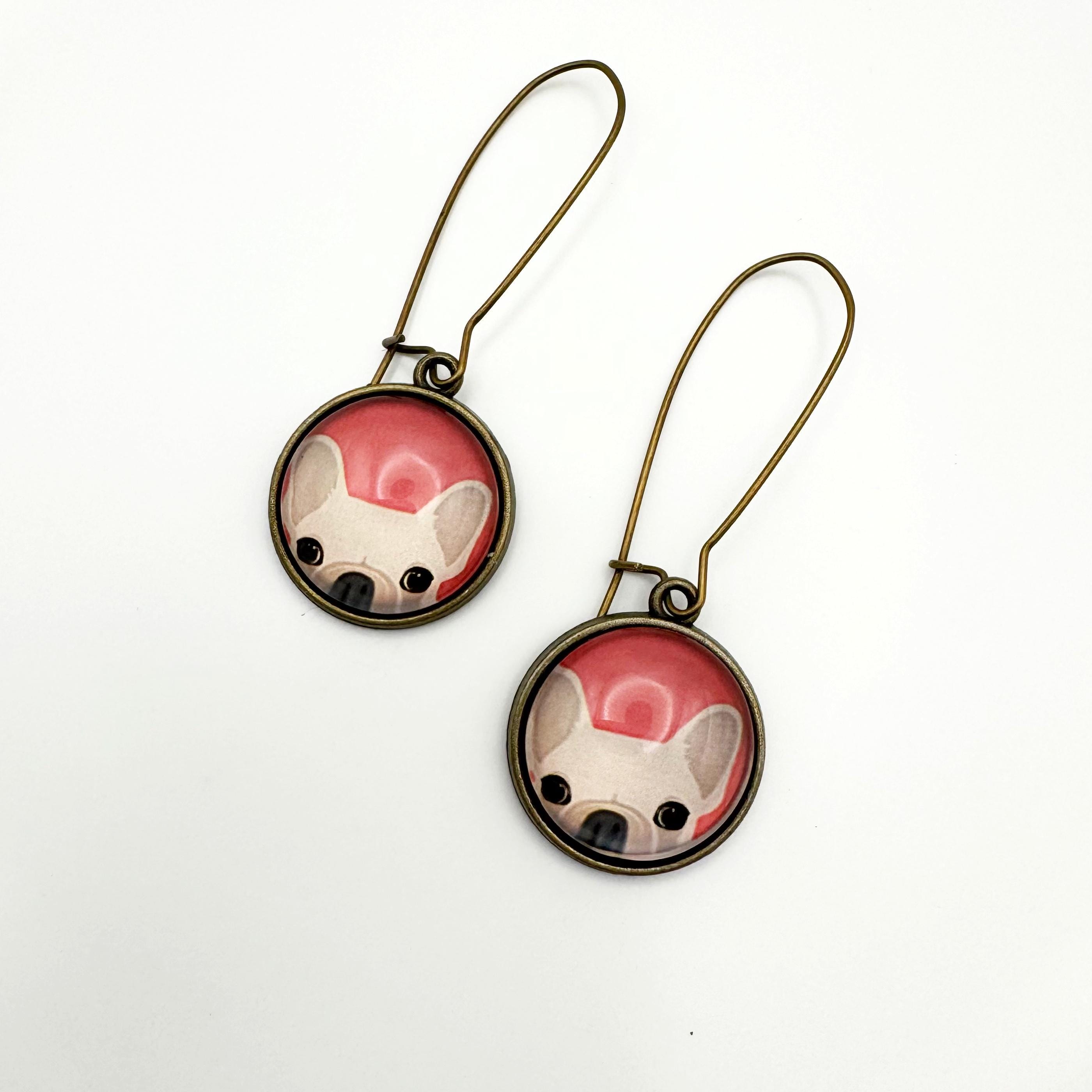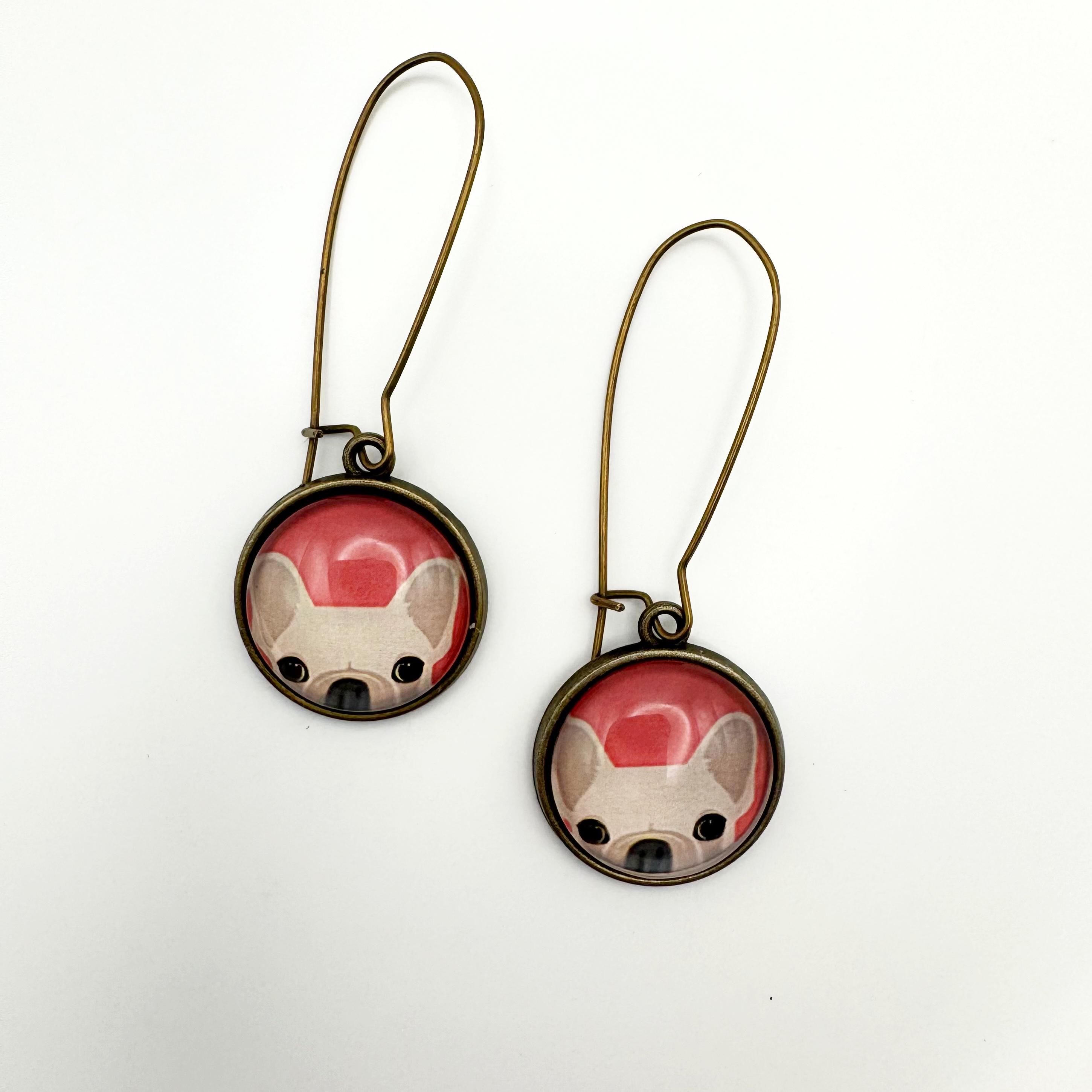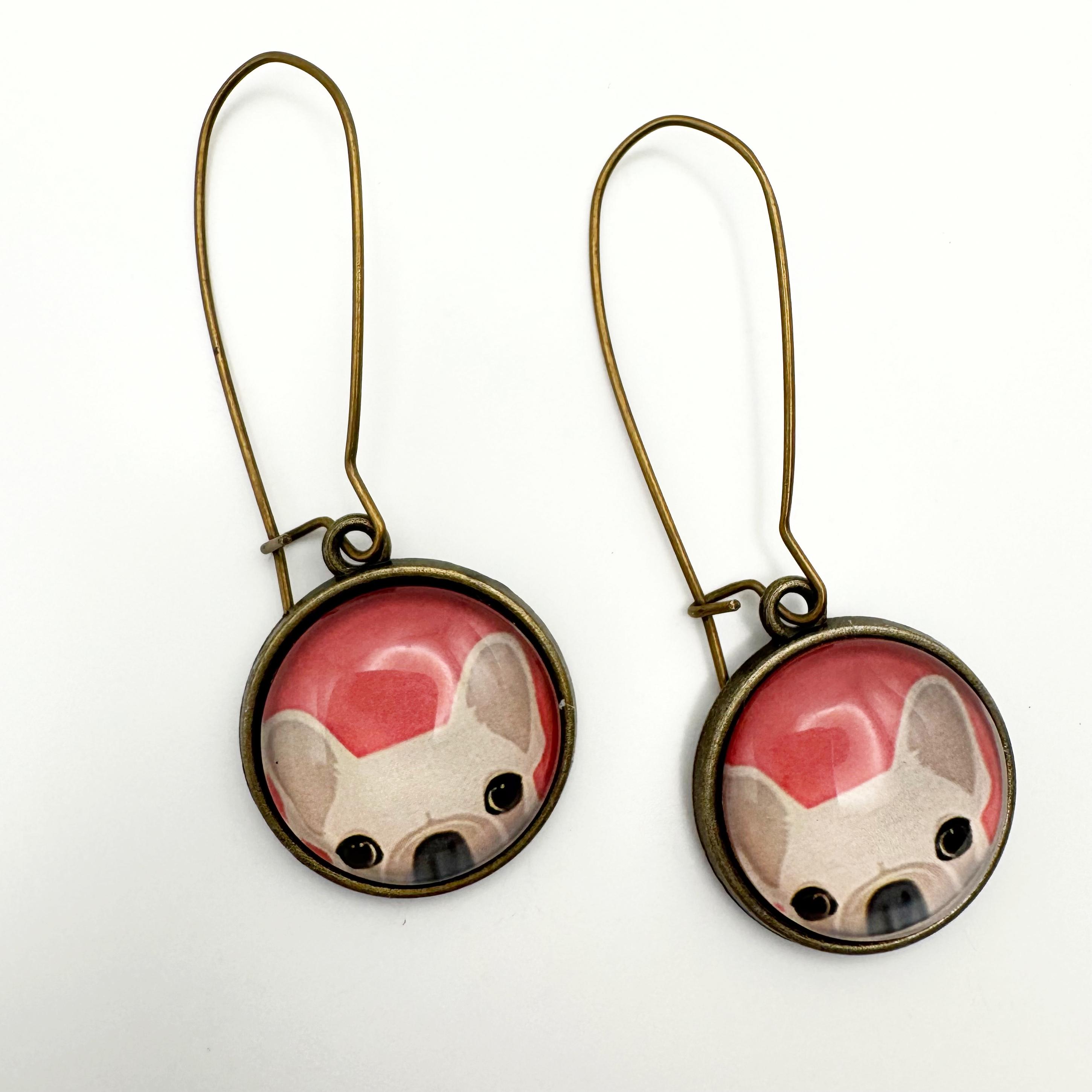 The earrings are made with an antiqued bronze 35mm kidney hook and an 18mm glass cabochon on a bronze setting. You've got your adorable tan French Bulldog peeking out with a red background. These are way too cute and hang 2 inches!