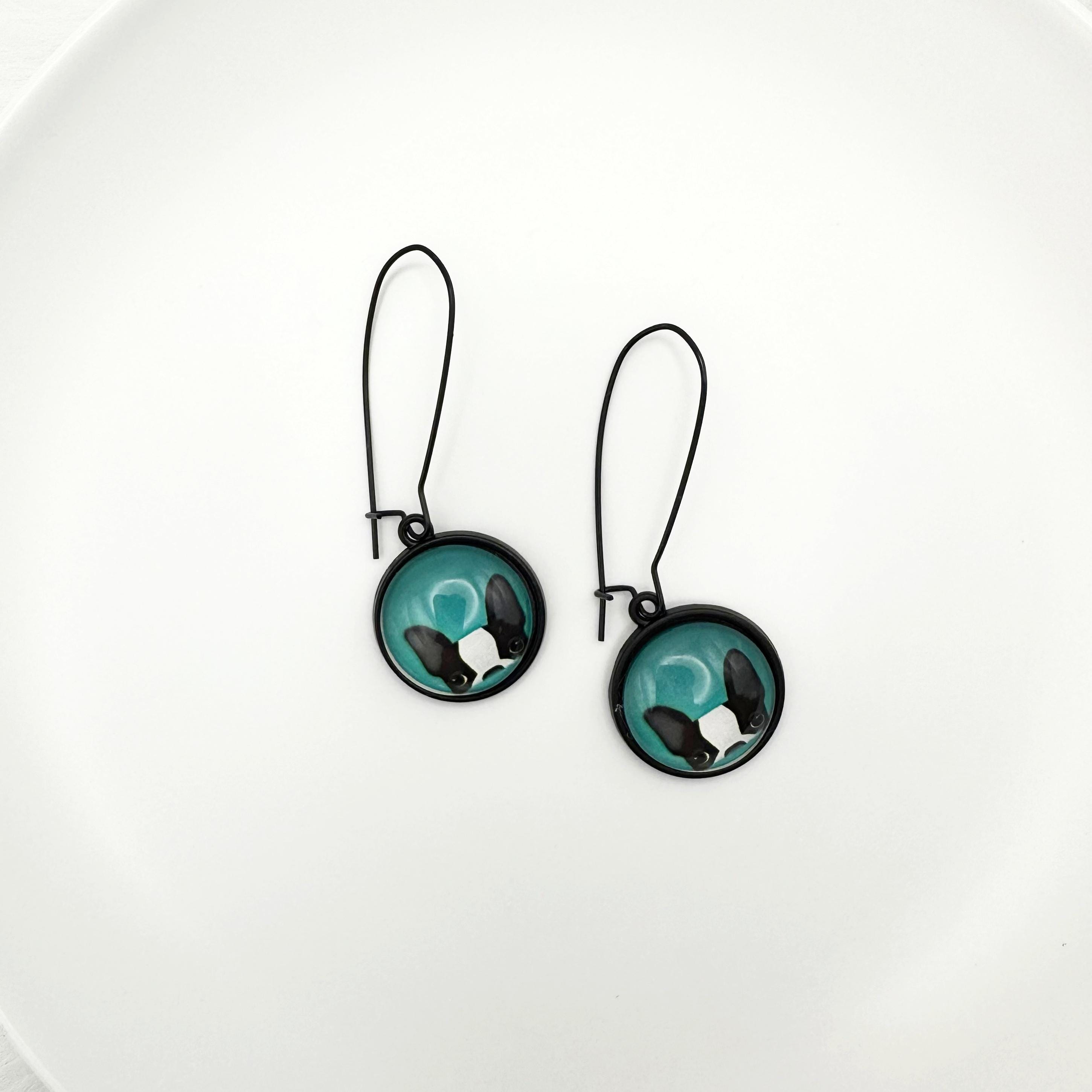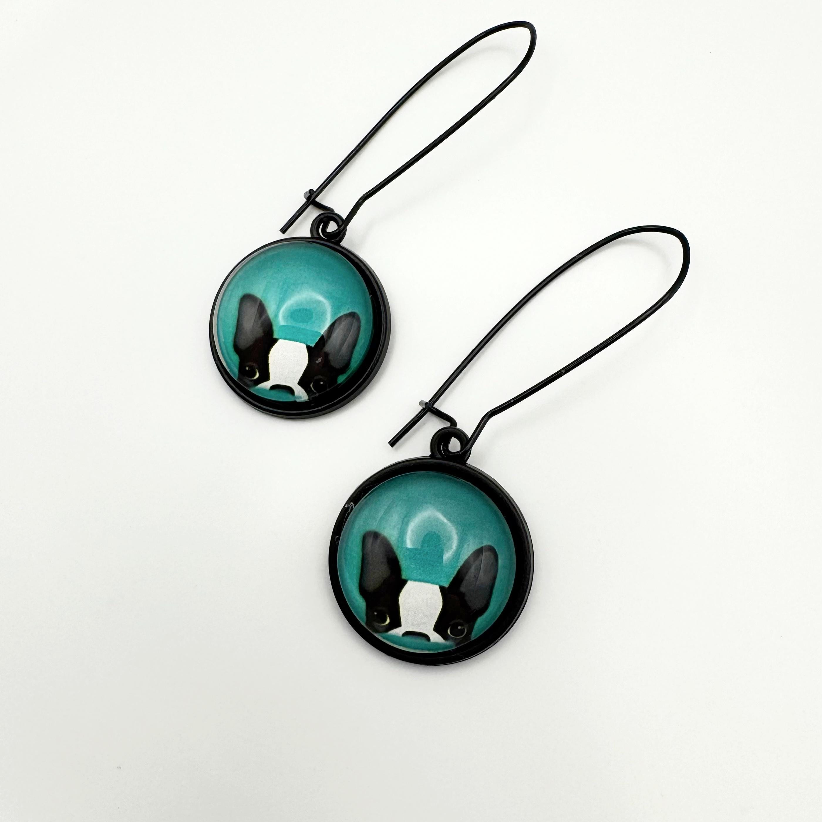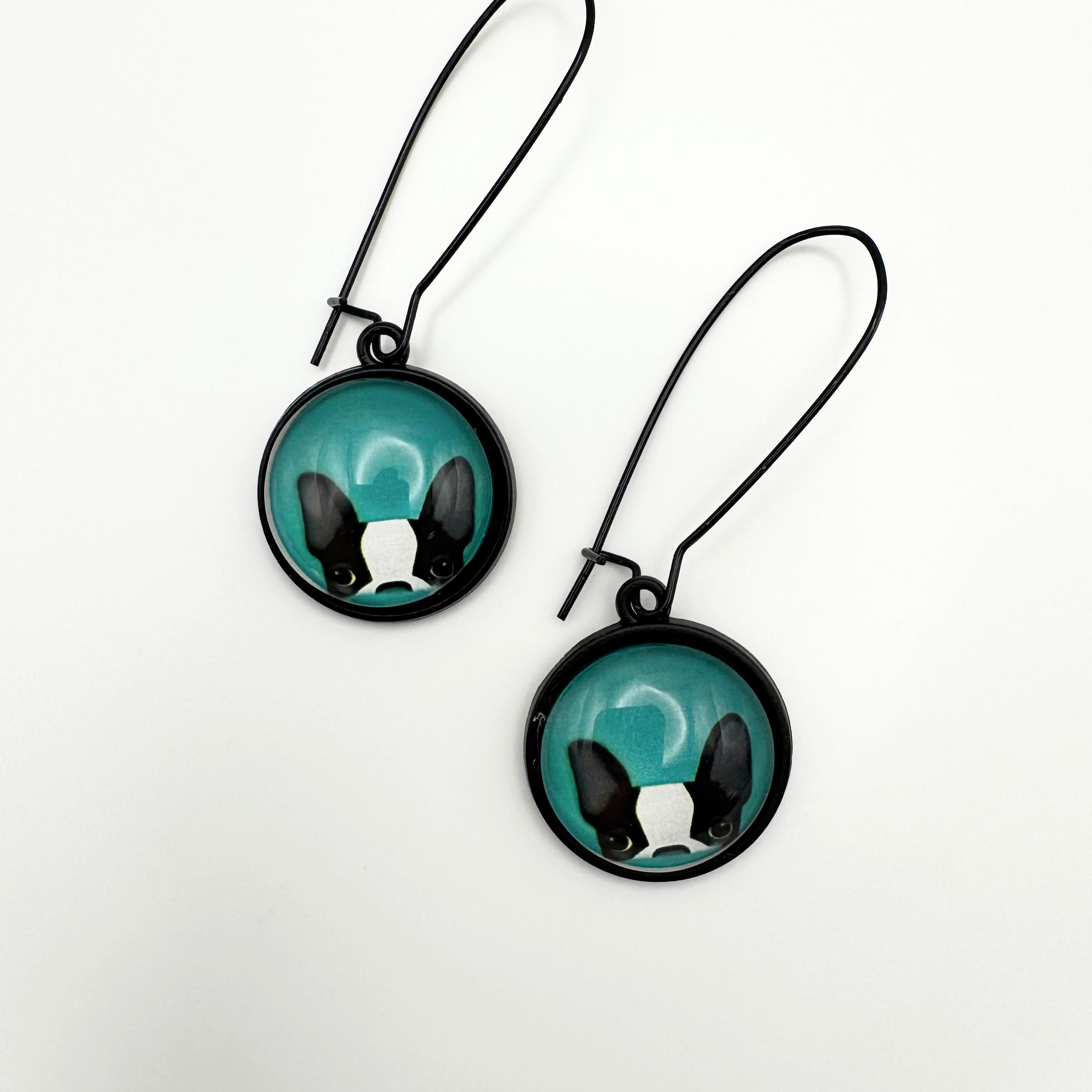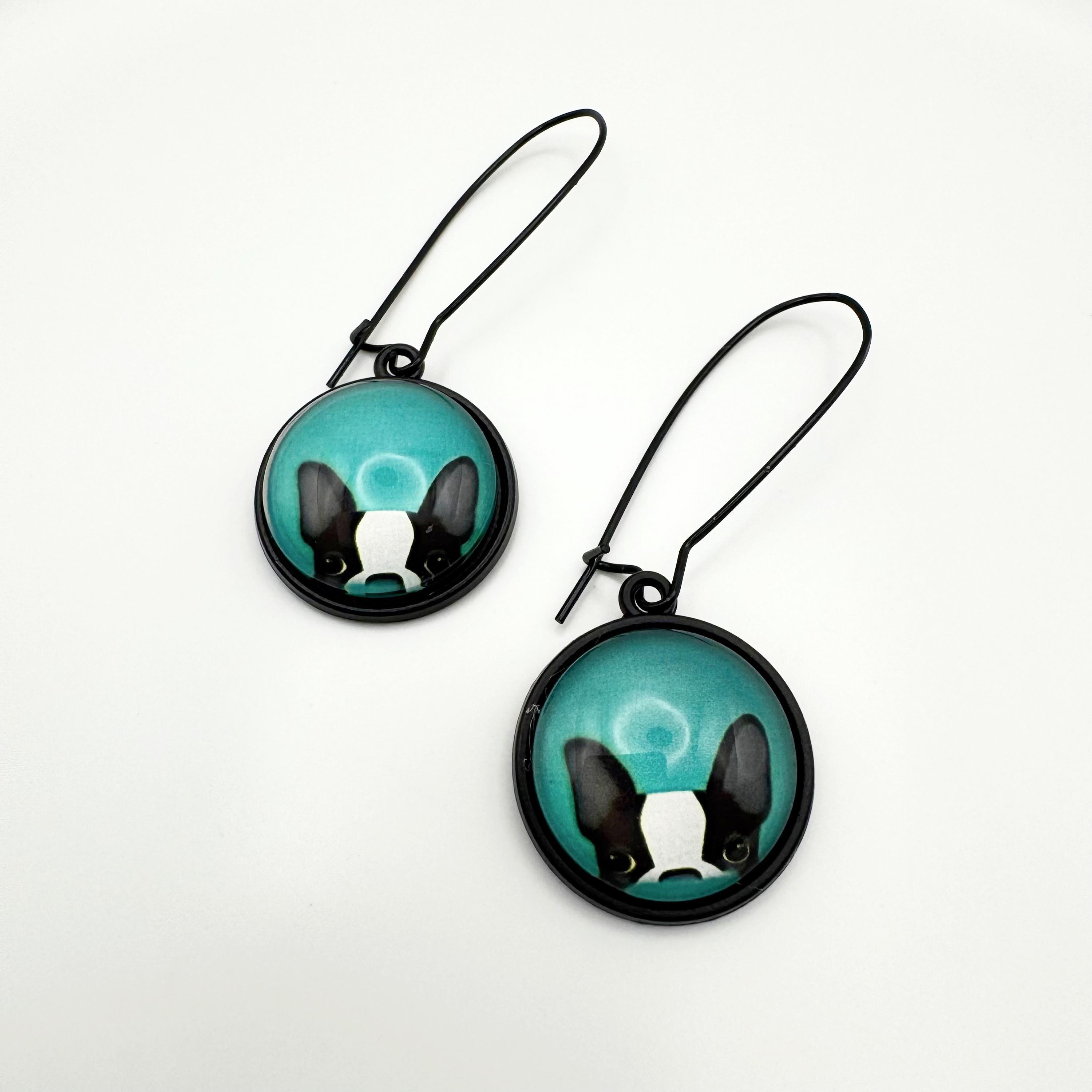 The earrings are made with a black 35mm kidney hook and an 18mm glass cabochon on a black setting. You've got your adorable black and white Boston Terrier dog peeking out with a teal background. These are way too cute and hang 2 inches!