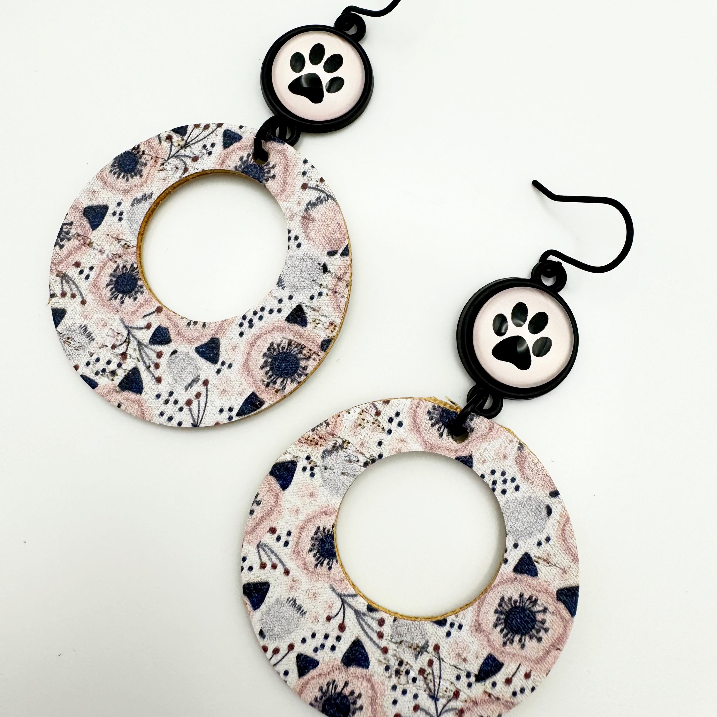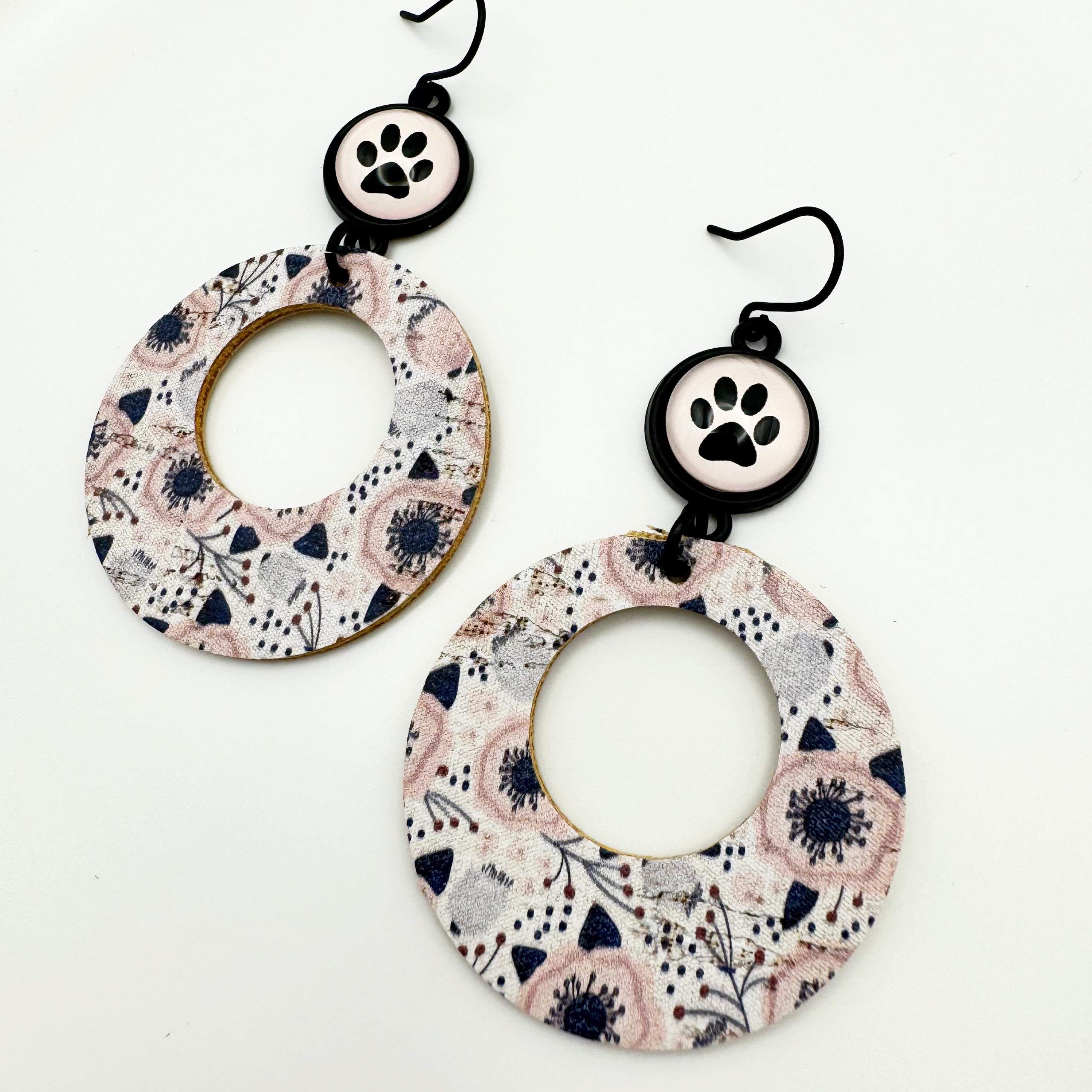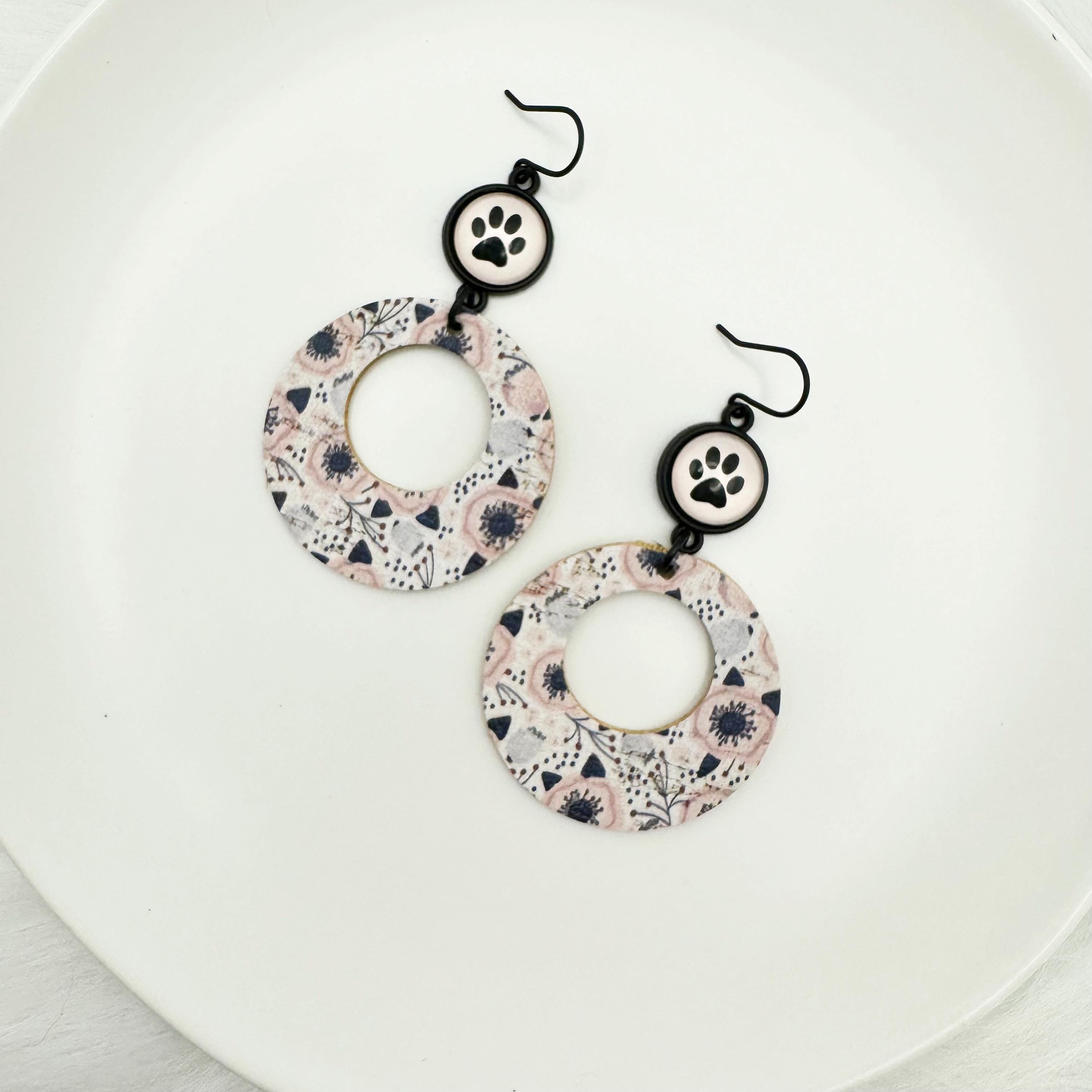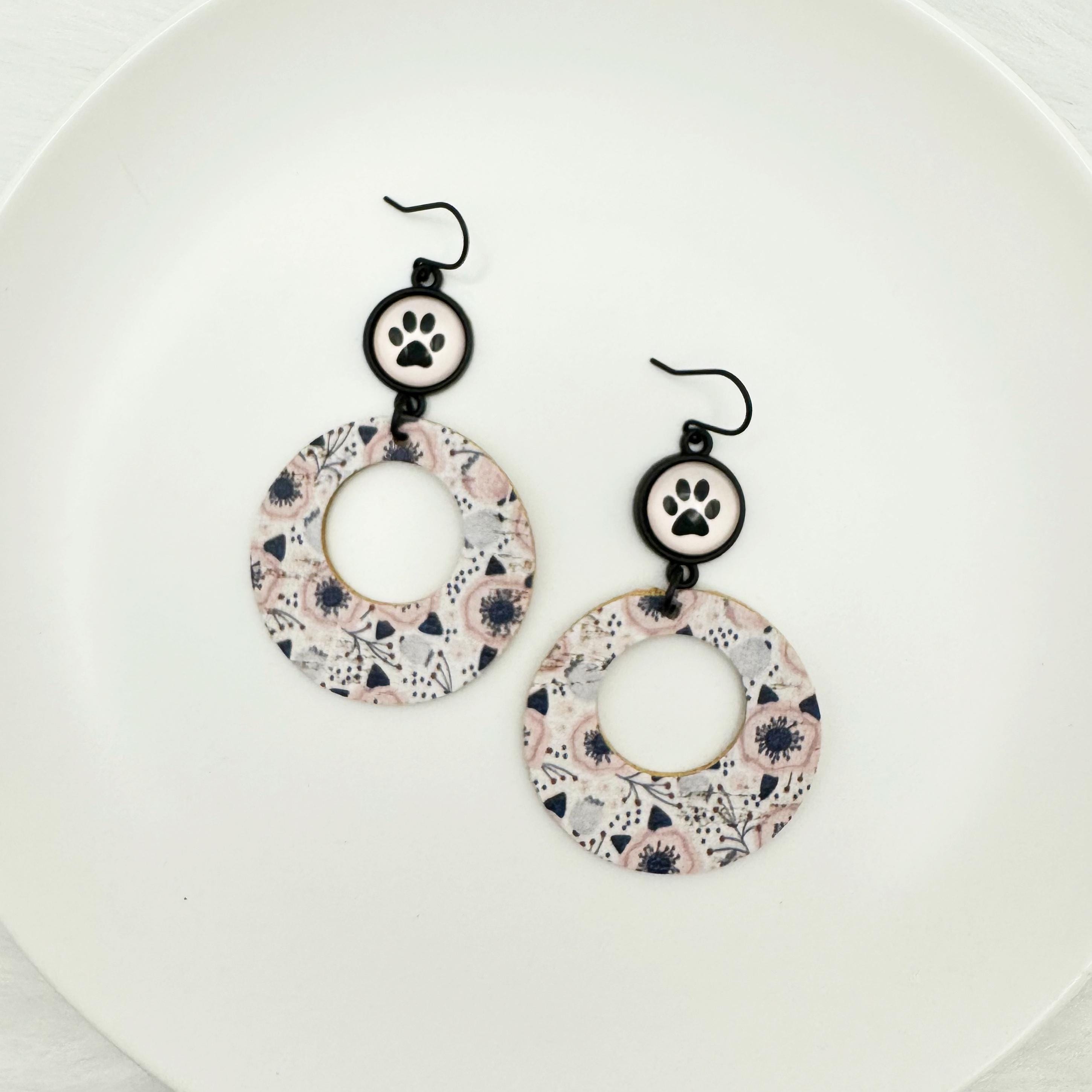 The earrings are made with a black hook, an 12mm cabochon with a paw and leather backed cork. These are fun, round earrings hanging 2.75 inches! They have a round, black and pink and gray poppies in leather backed cork.