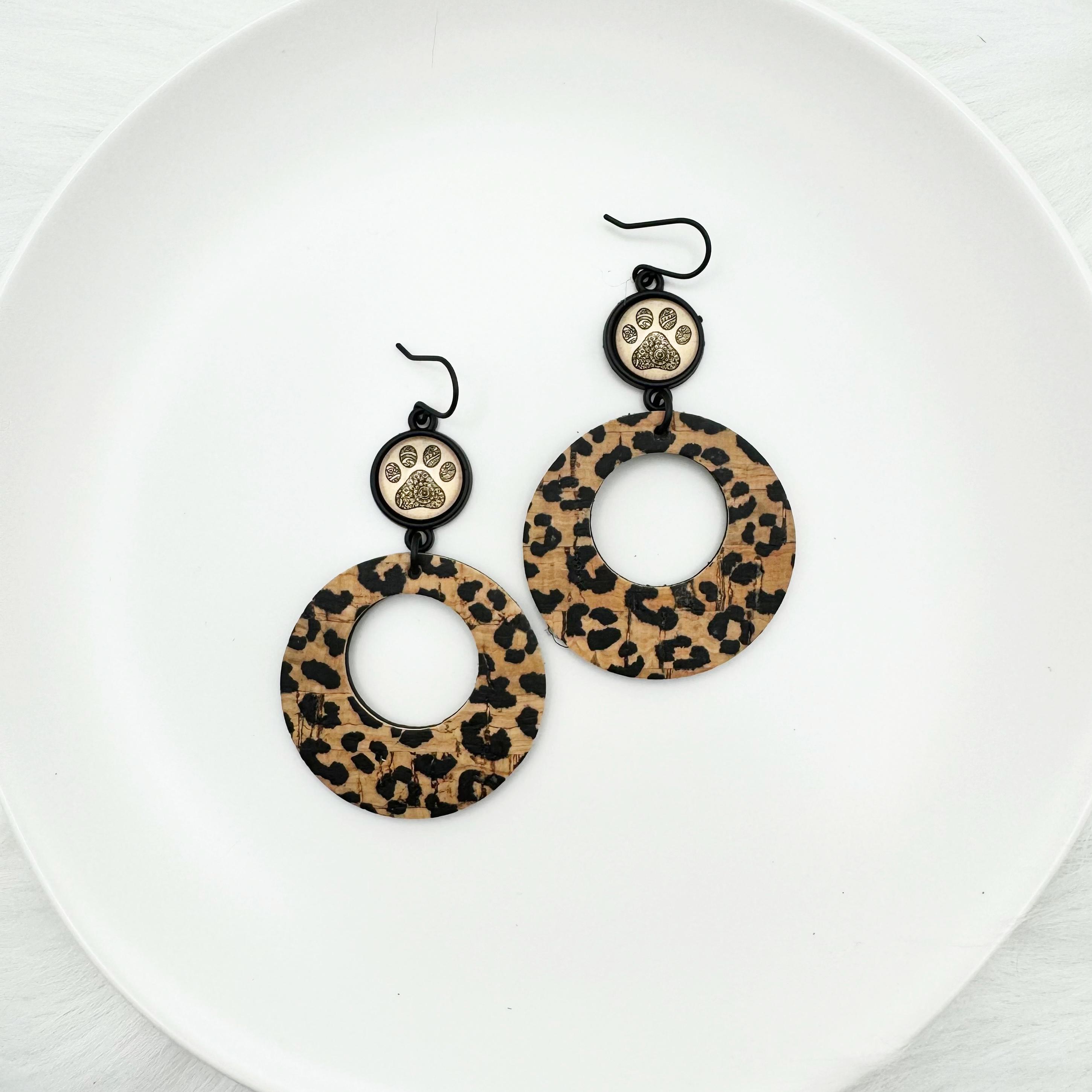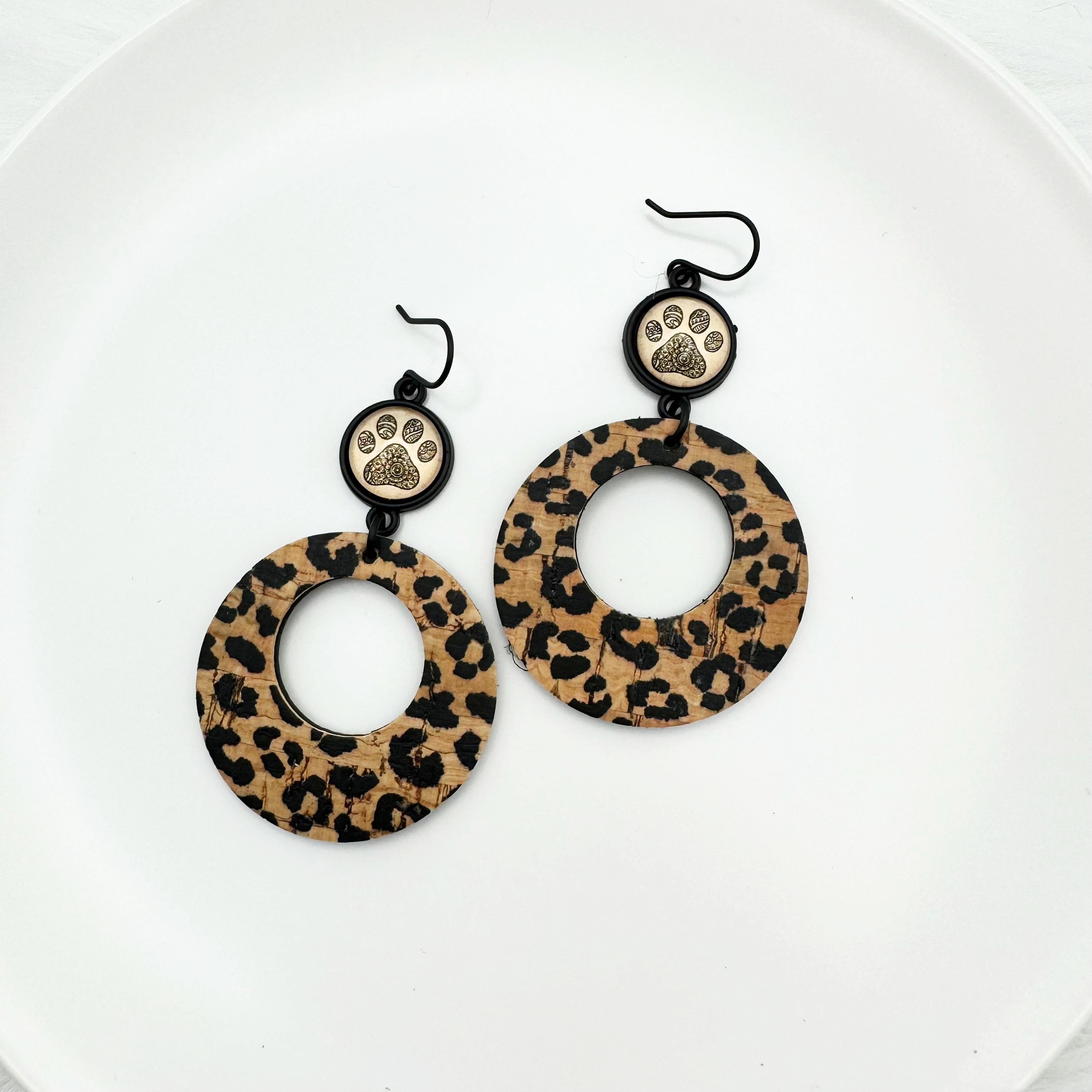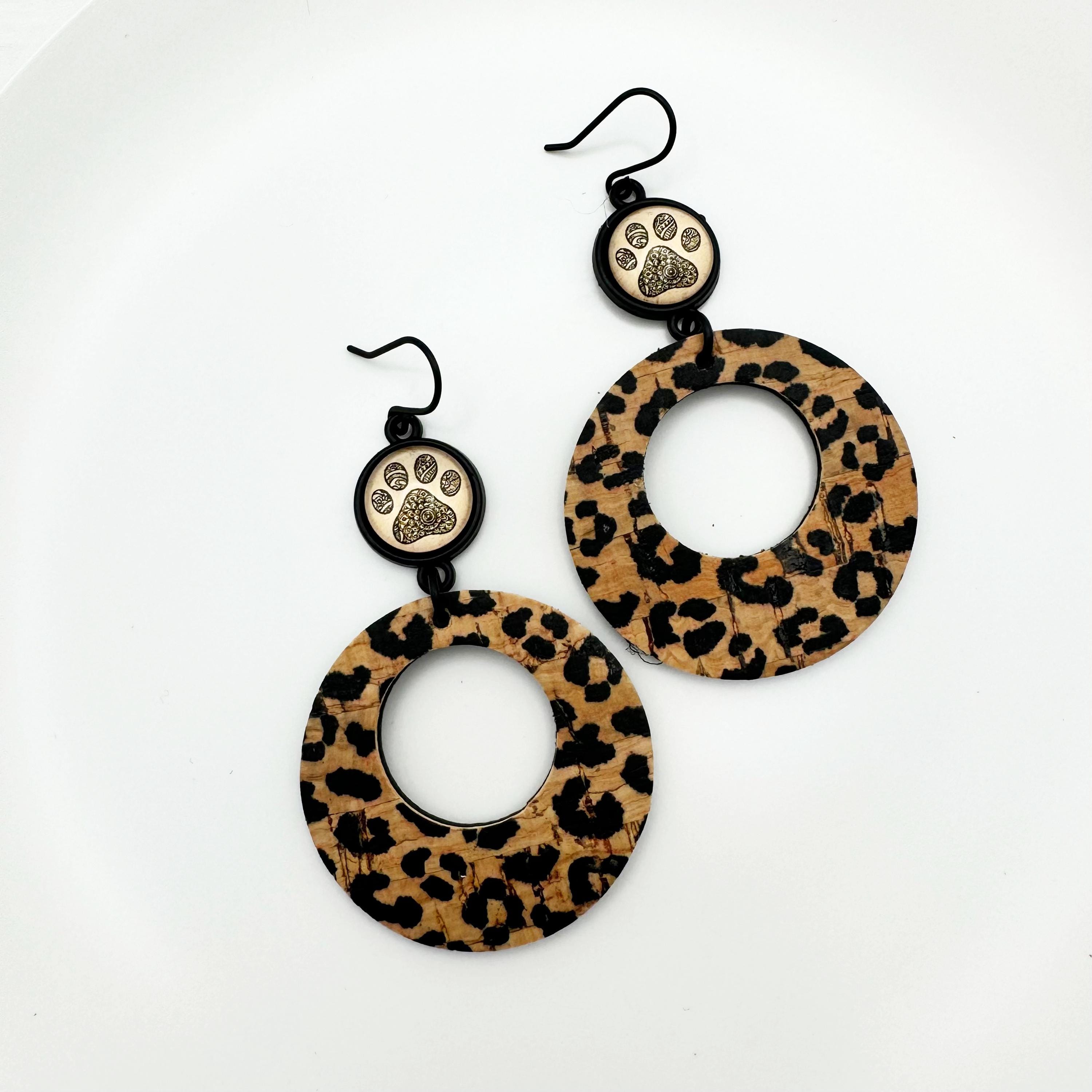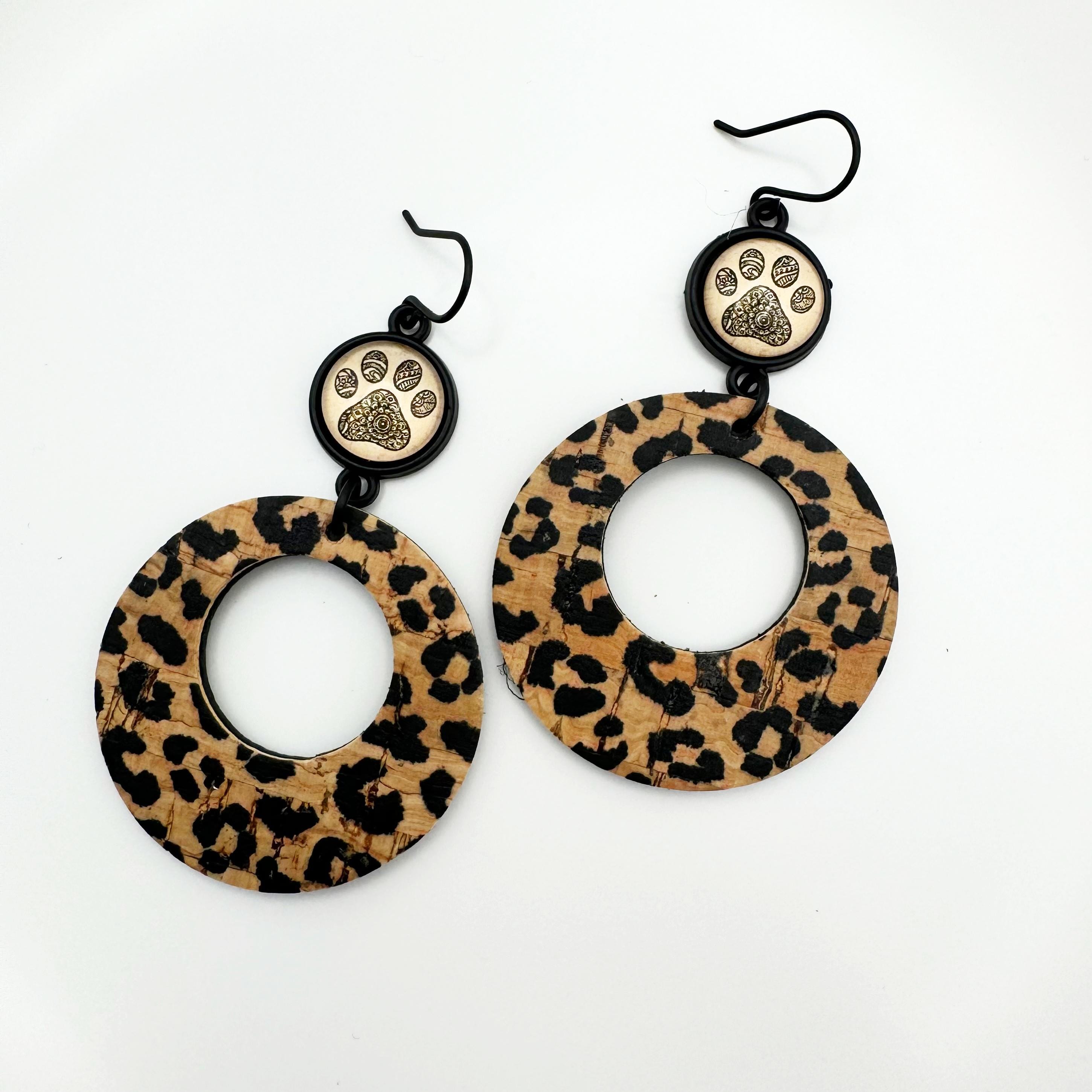 The earrings are made with a black hook, an 12mm cabochon with a paw and leather backed cork. These are fun, round earrings hanging 2.75 inches! They have a round, black and brown animal print in leather backed cork.