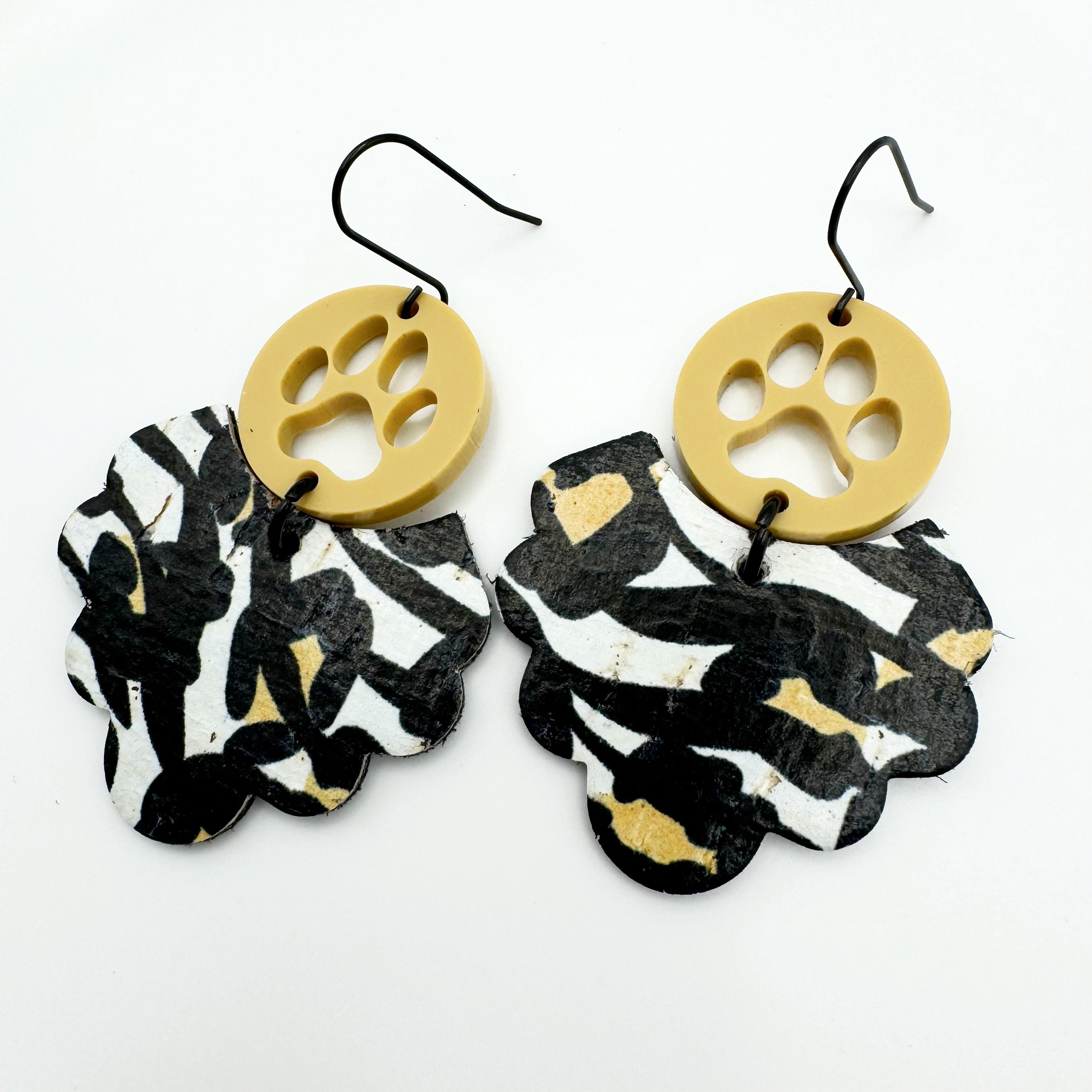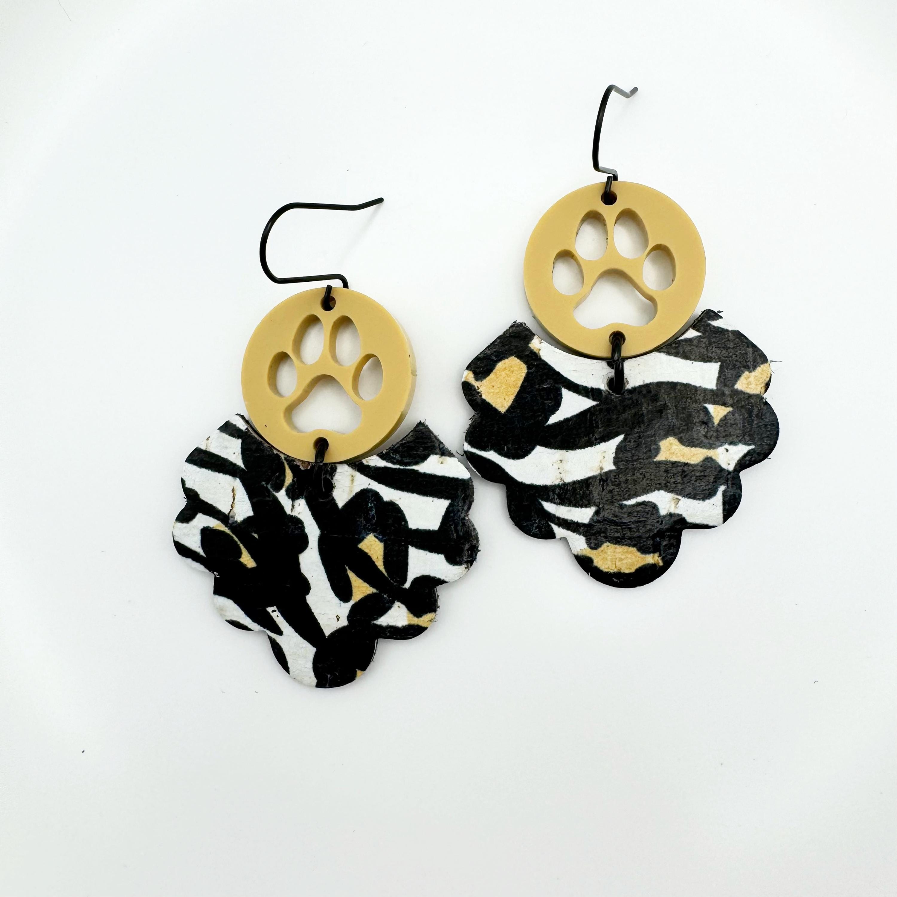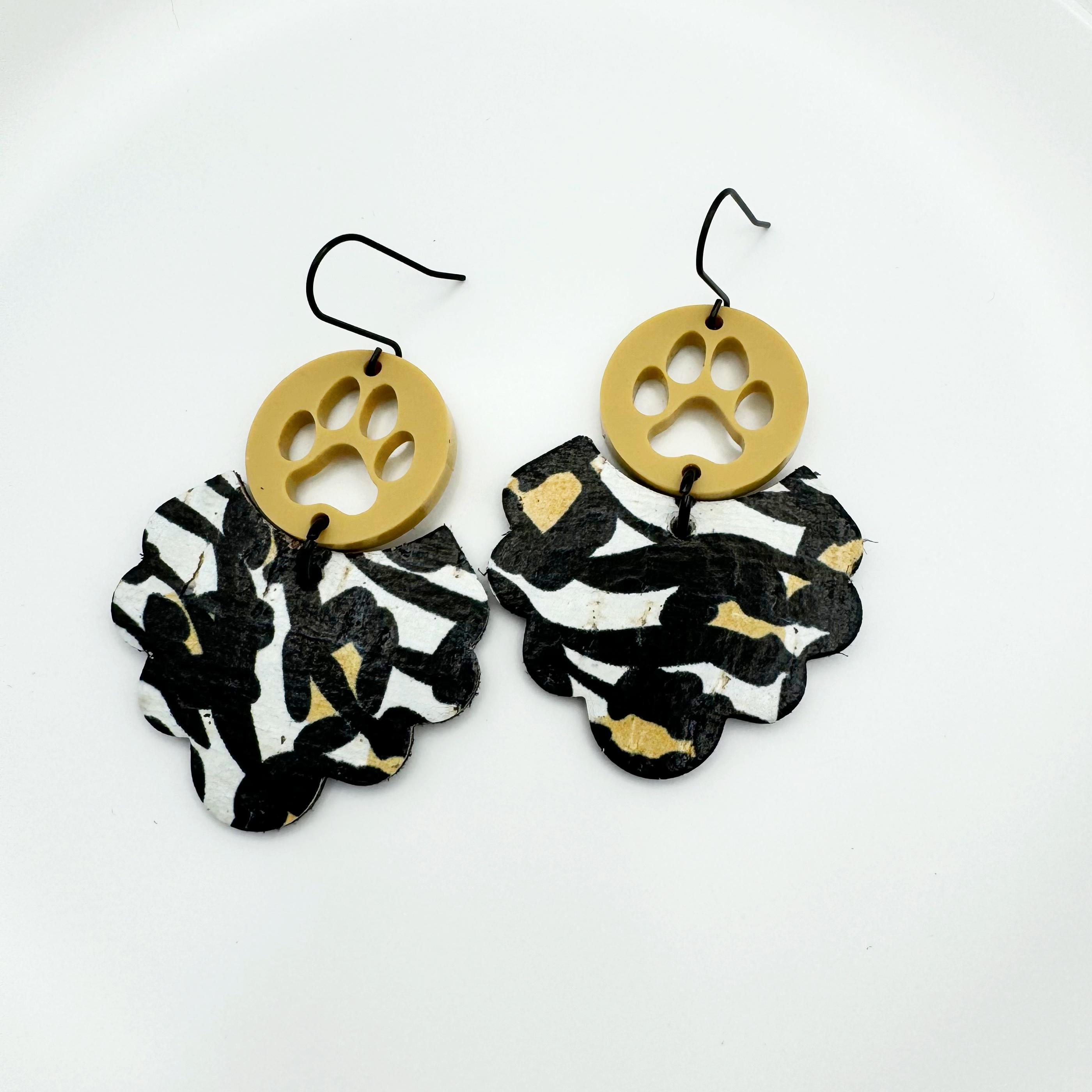 The earrings are made with a stainless steel black hook, an acrylic paw shape and leather backed cork. These are fun earrings hanging 2.75 inches! They have a nice classic scalloped shape in a black and mustard animal print leather backed cork hanging from mustard acrylic paw shape. They are so lightweight, you won't realize you're even wearing earrings!