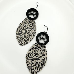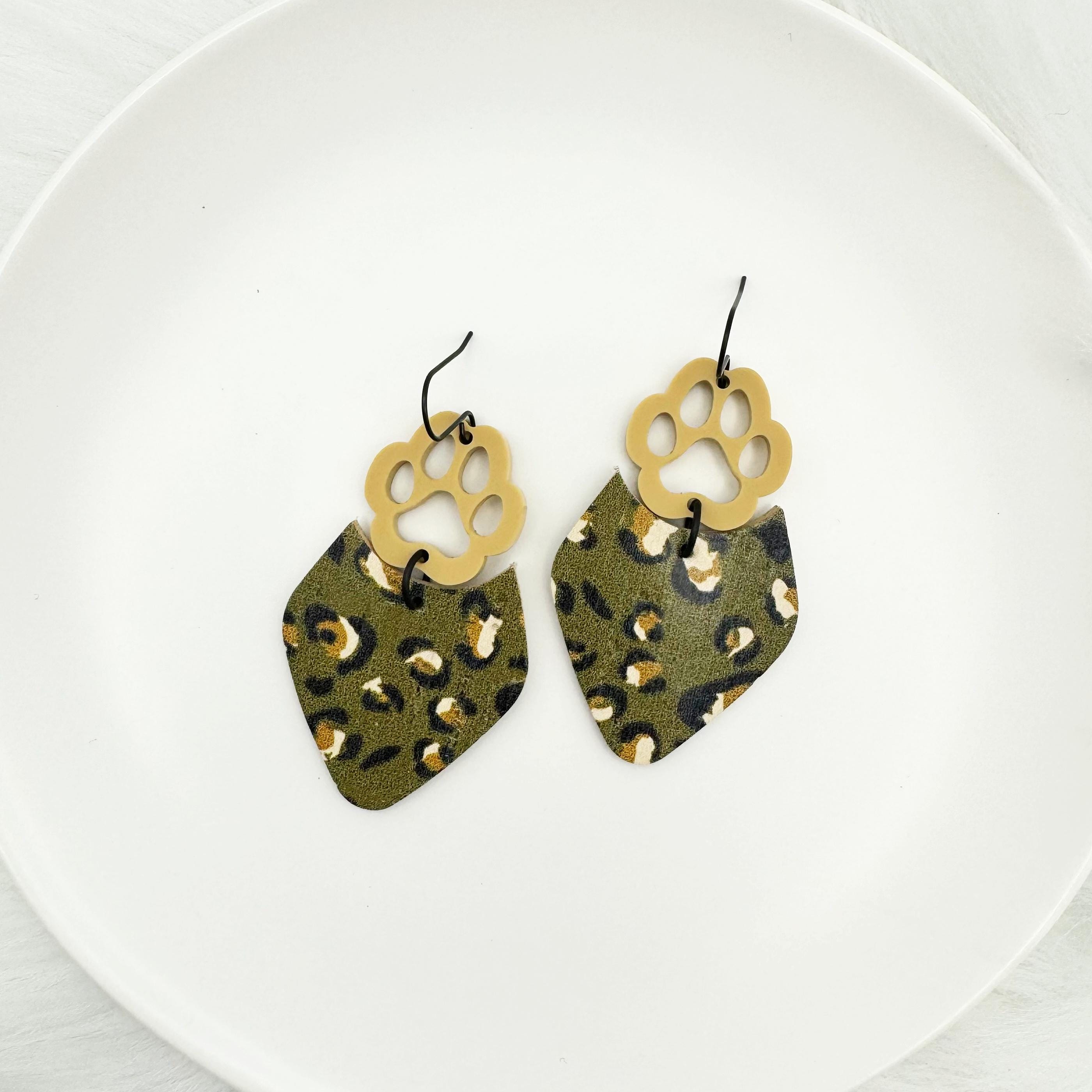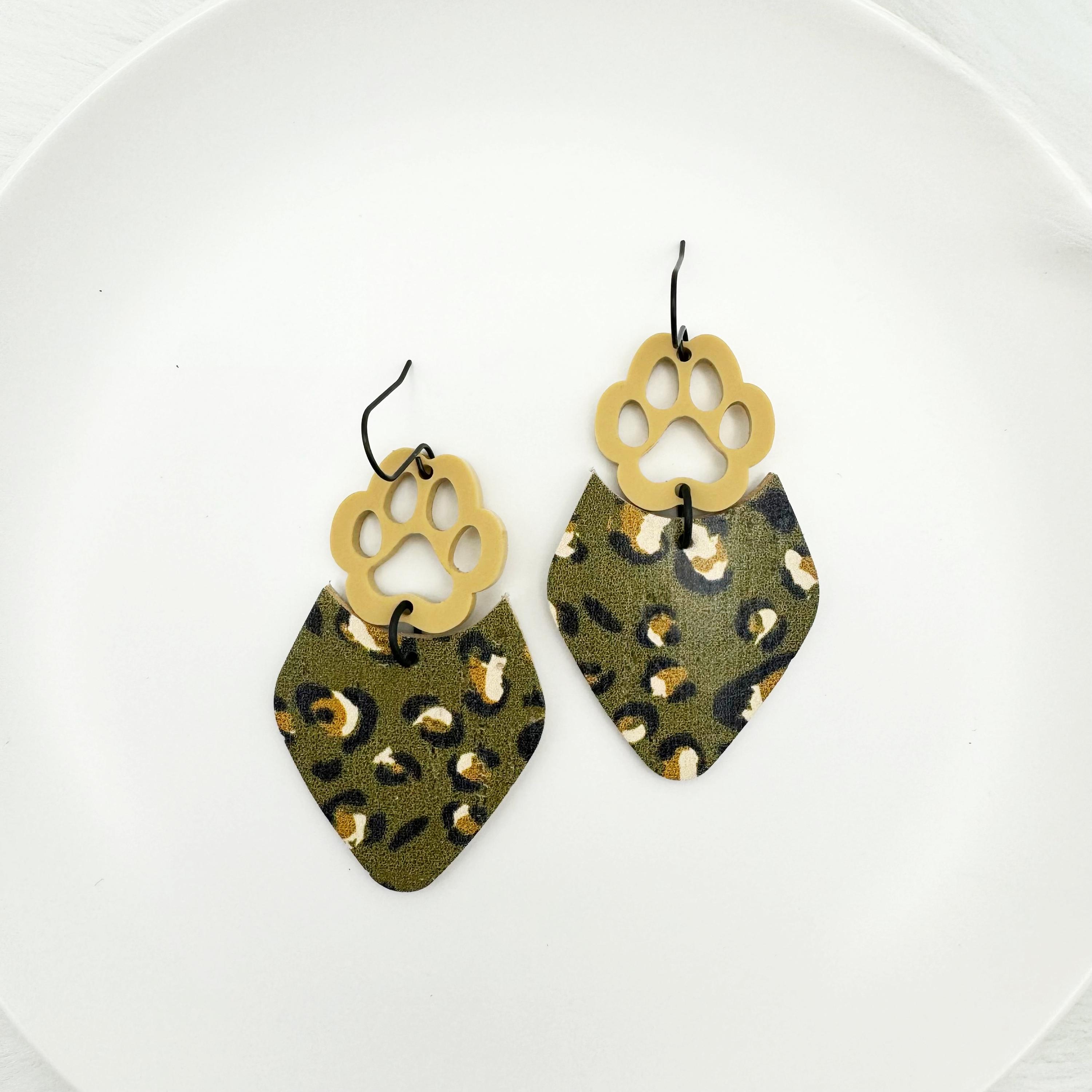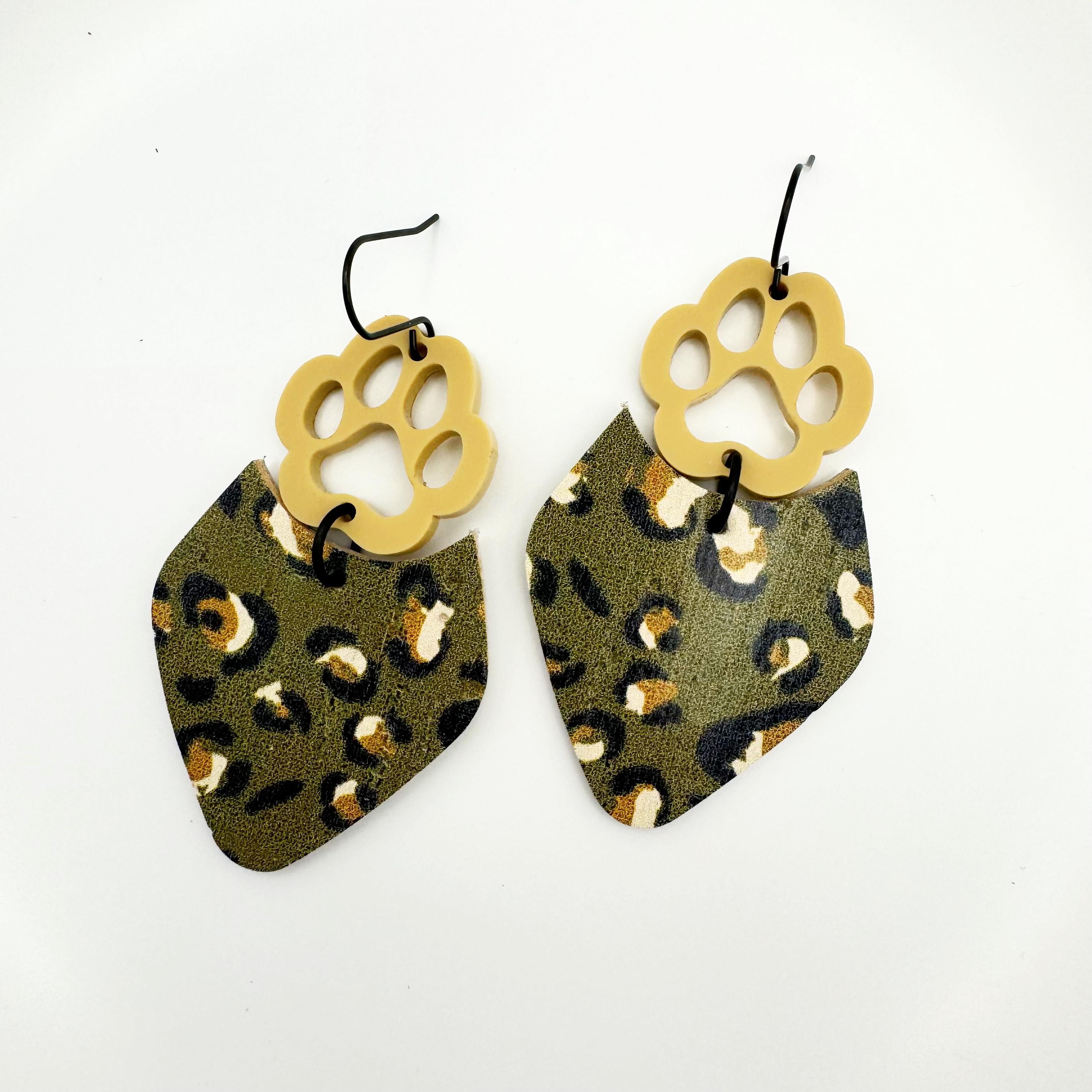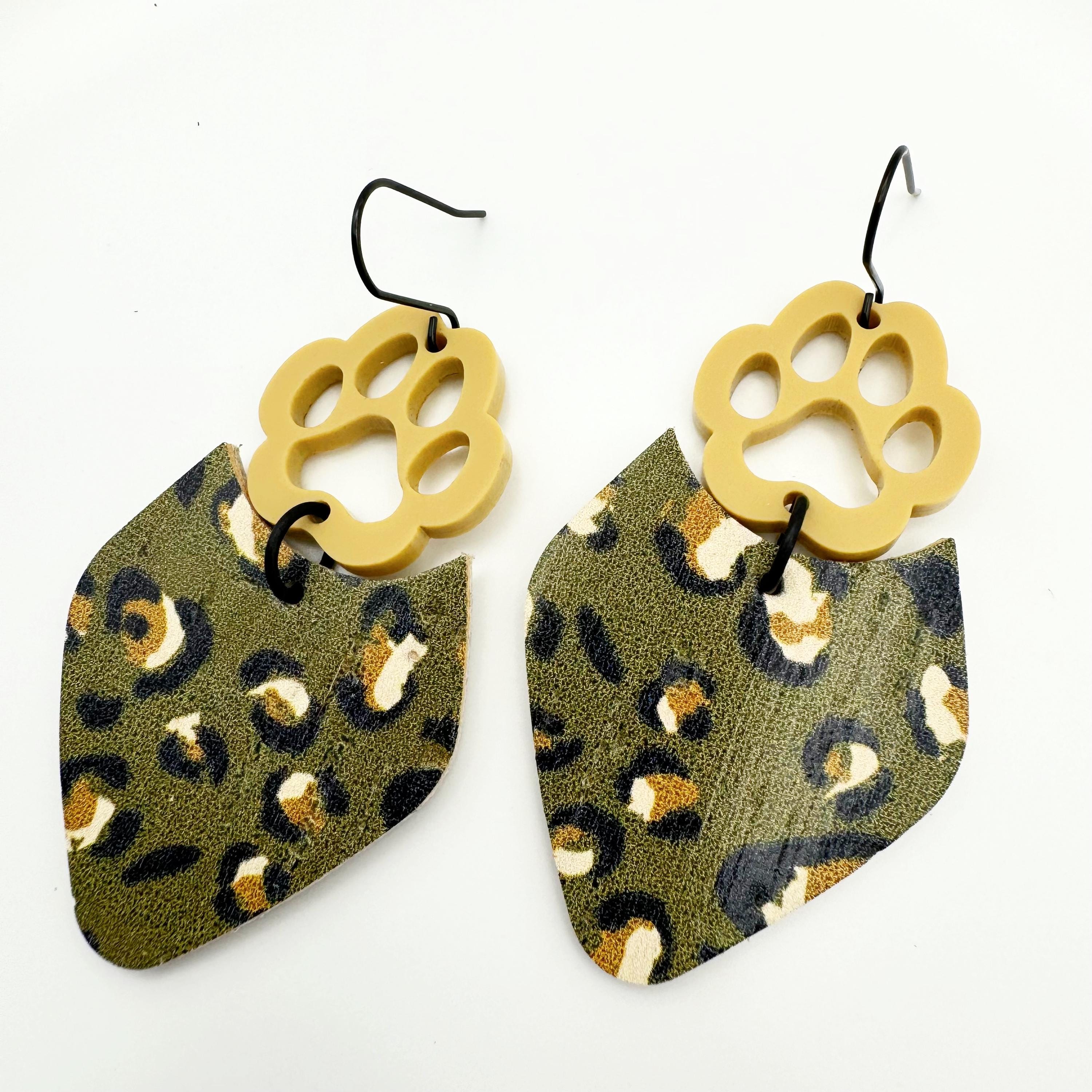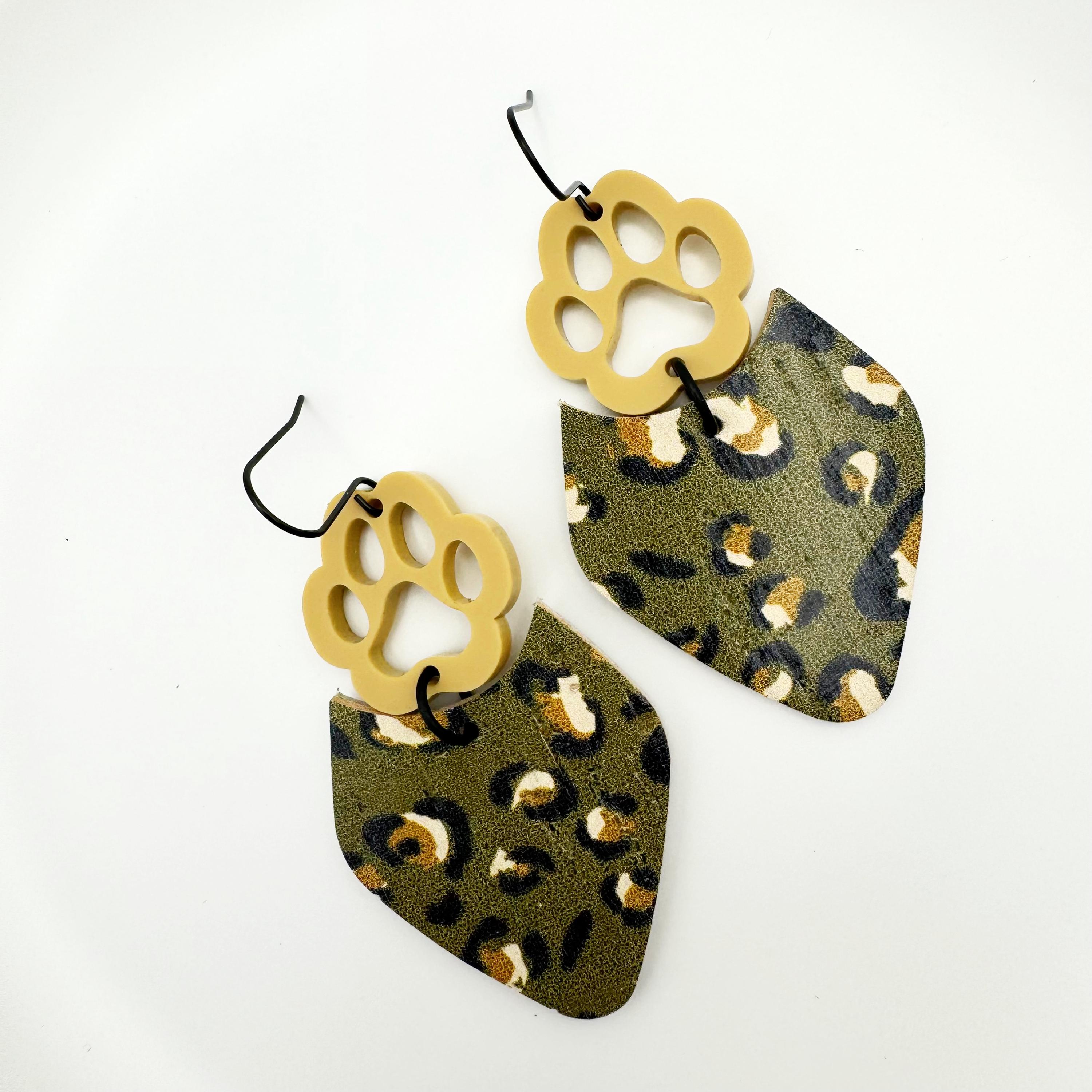 The earrings are made with a stainless steel black hook, an acrylic paw shape and leather backed cork. These are fun earrings hanging 2.75 inches! They have a nice classic shape in a mustard, black and olive green leather backed cork hanging from a mustard acrylic paw shape. They are so lightweight, you won't realize you're even wearing earrings!