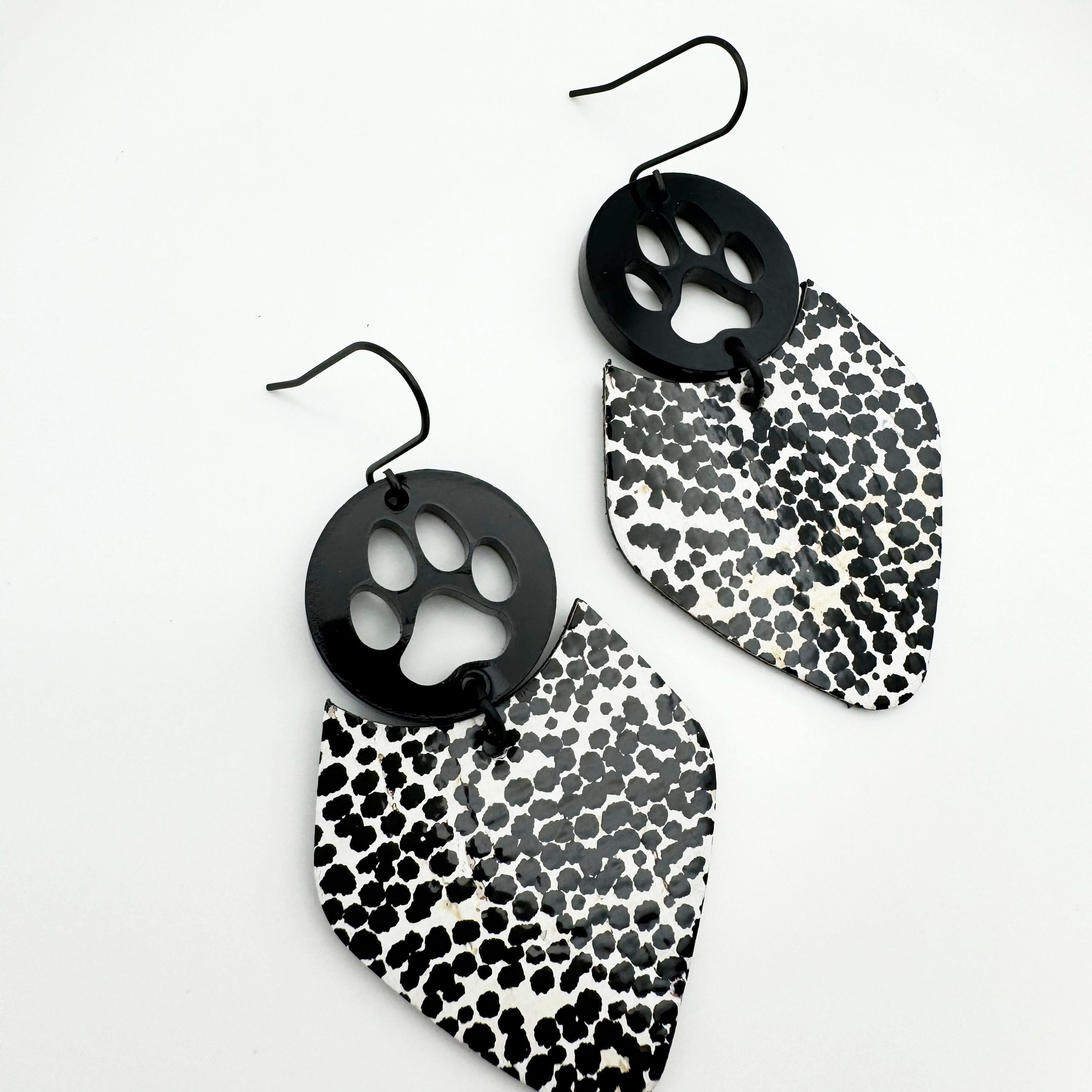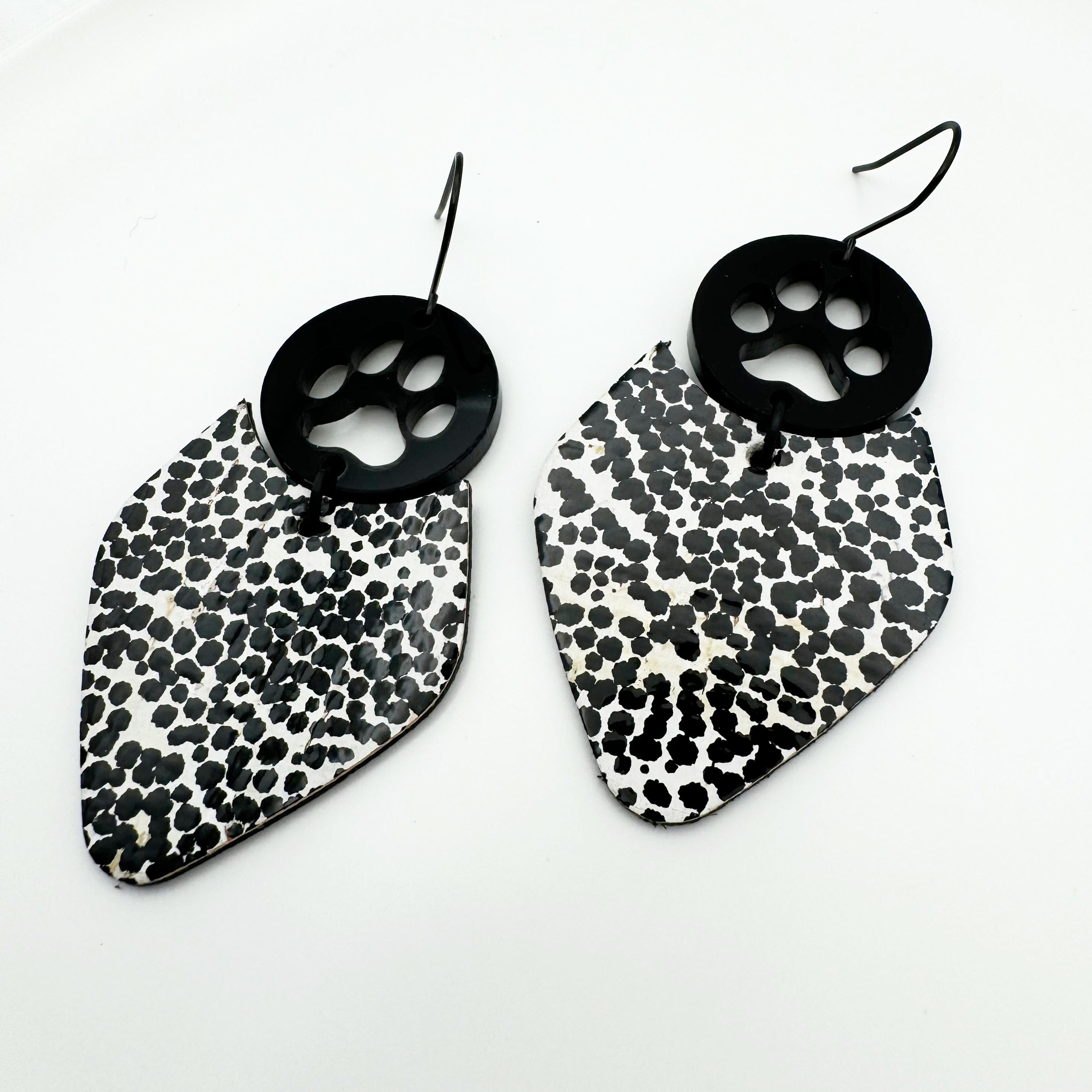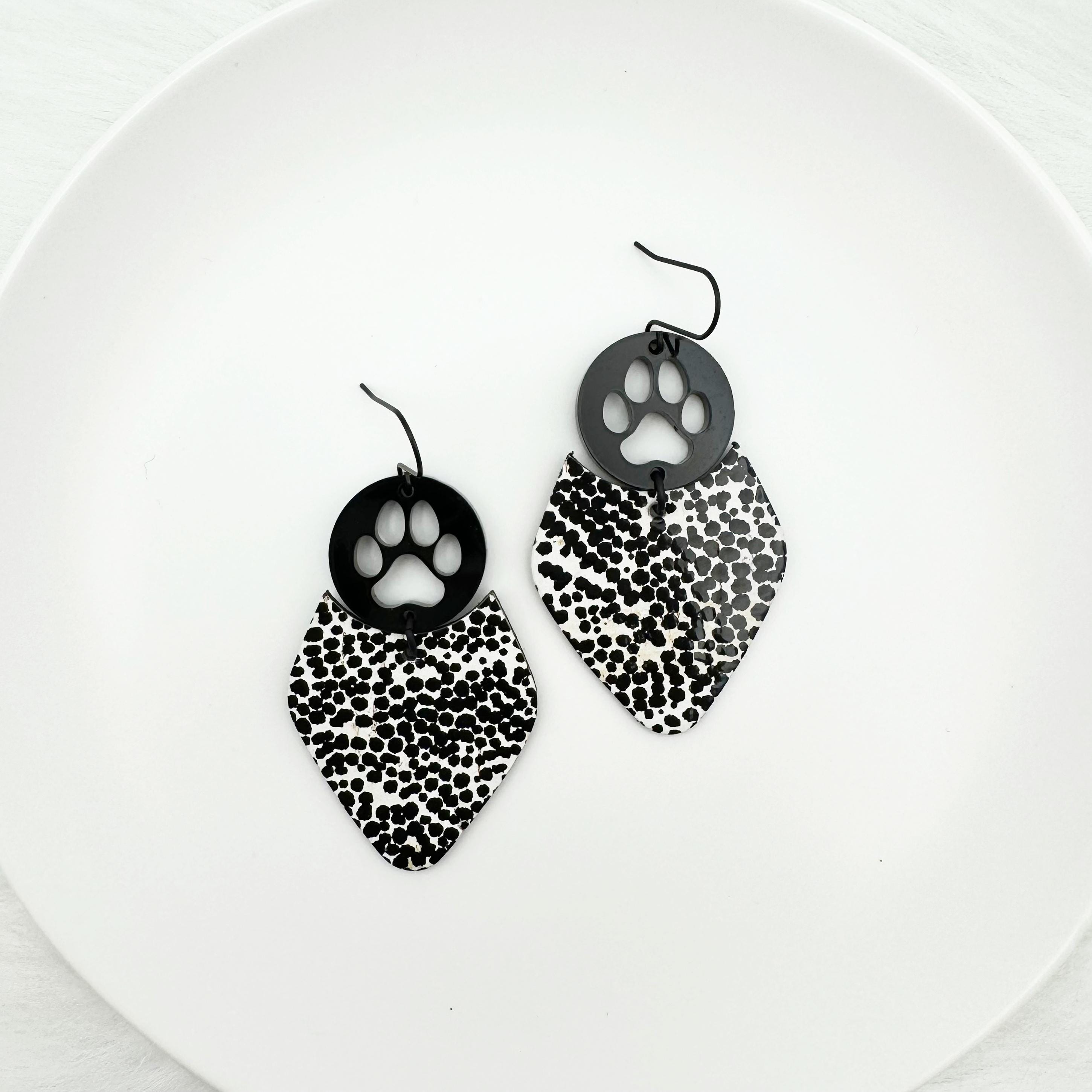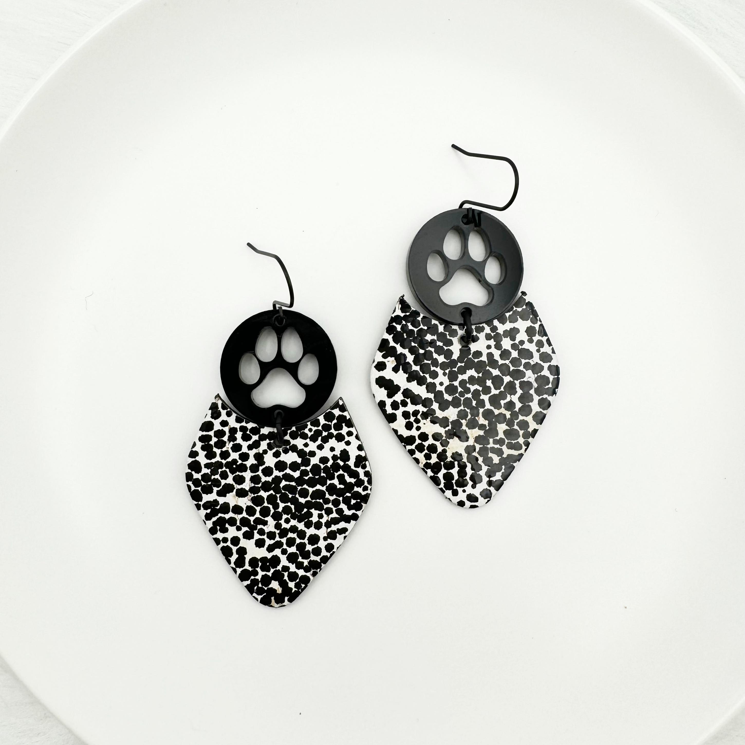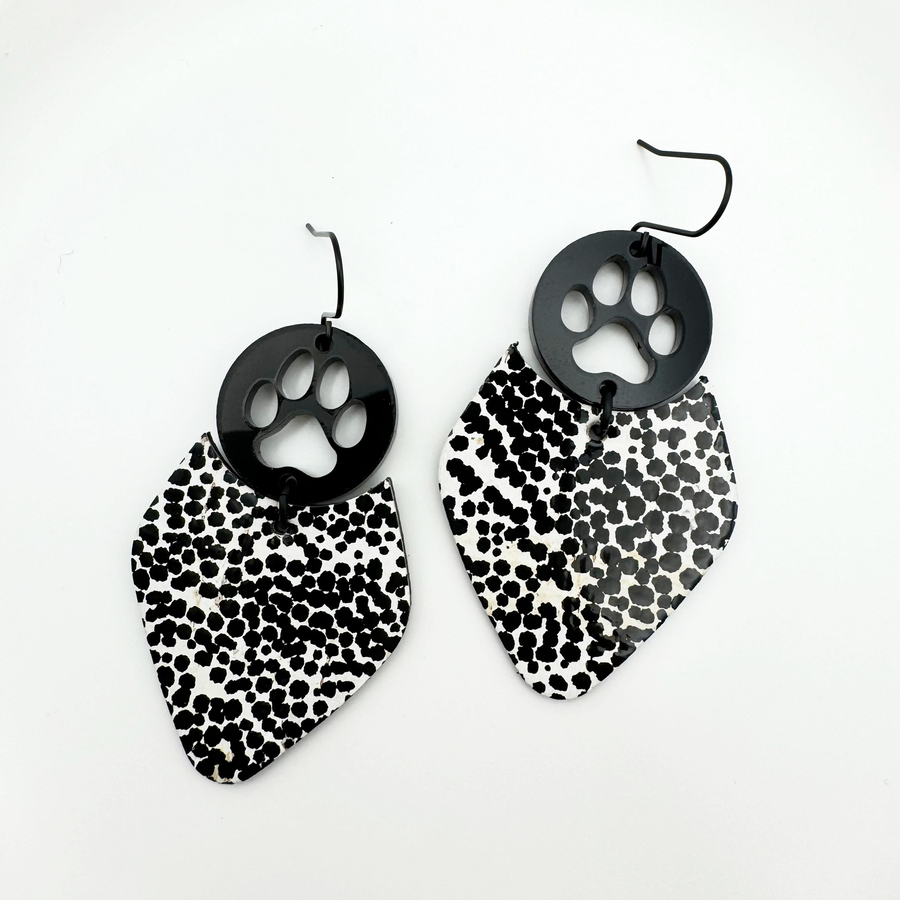 The earrings are made with a stainless steel black hook, an acrylic paw shape and leather backed cork. These are fun earrings hanging 2.75 inches! These are fun earrings hanging 2.75 inches! They have a nice classic shape in black and white polka dot leather backed cork hanging from an acrylic paw shape. They are so lightweight, you won't realize you're even wearing earrings!