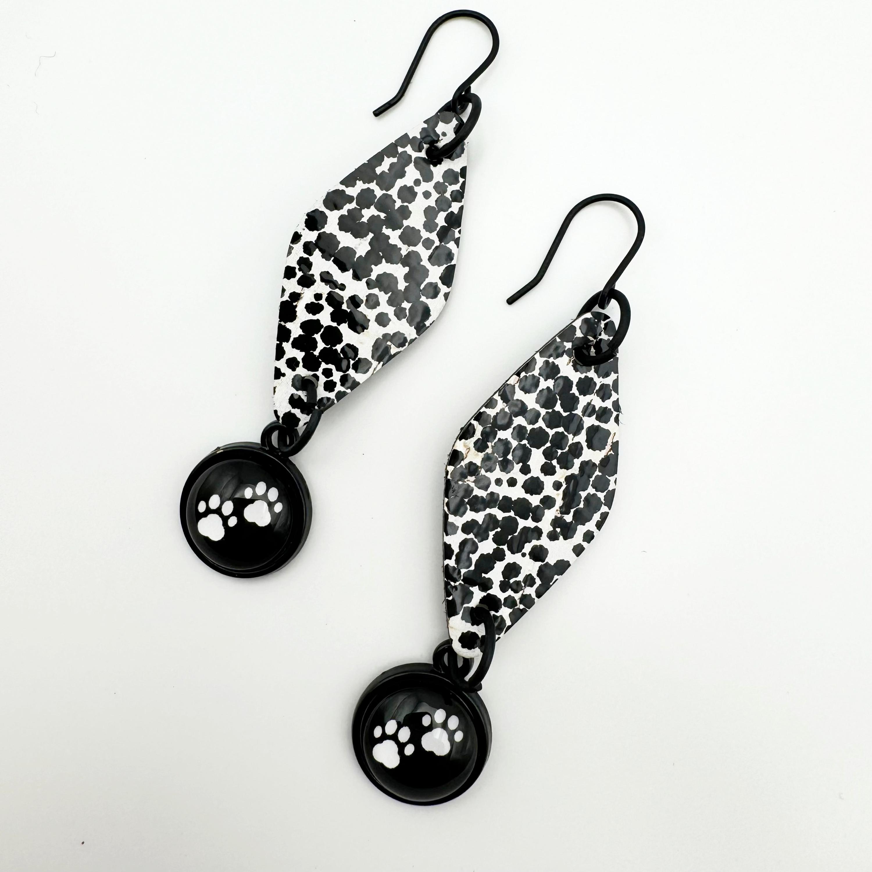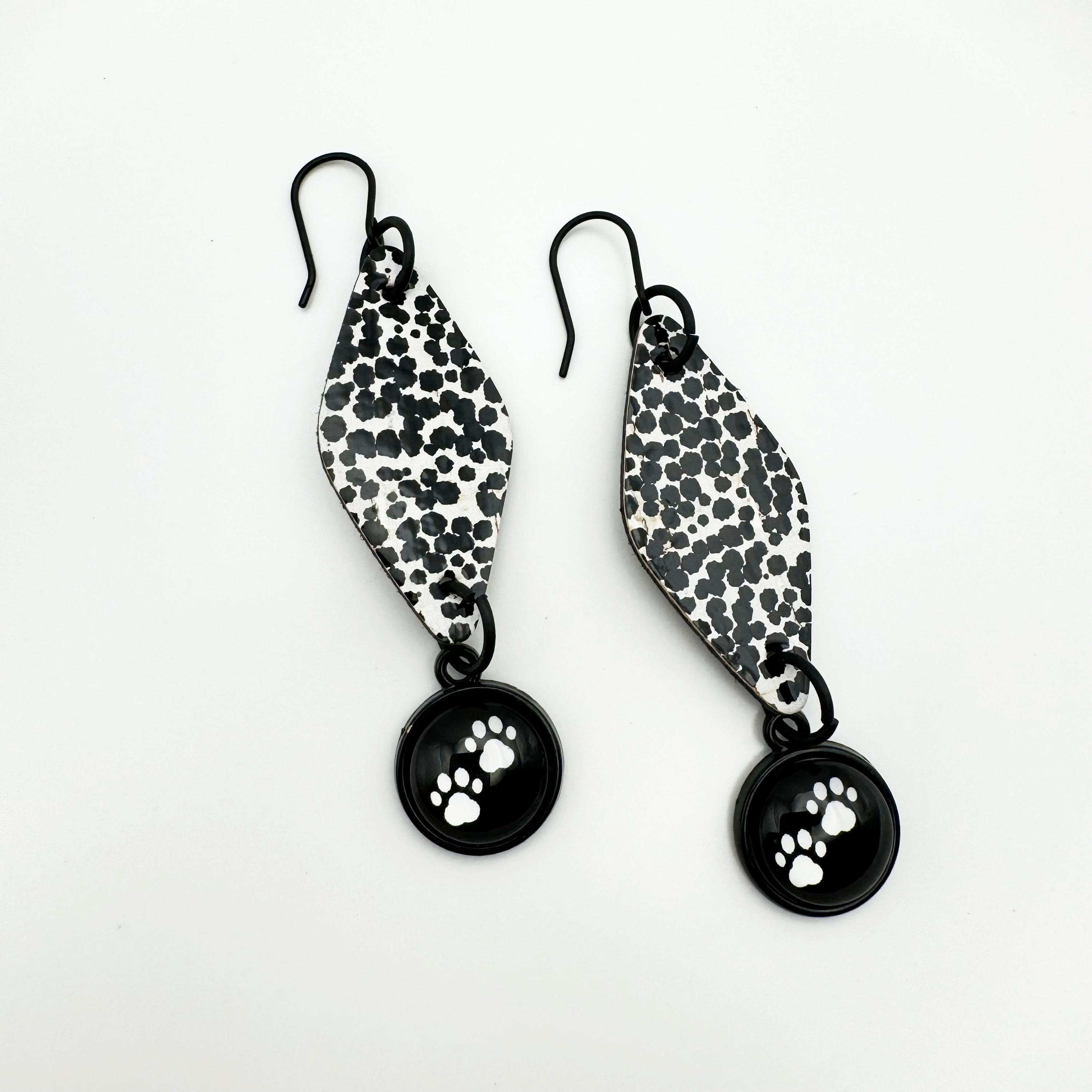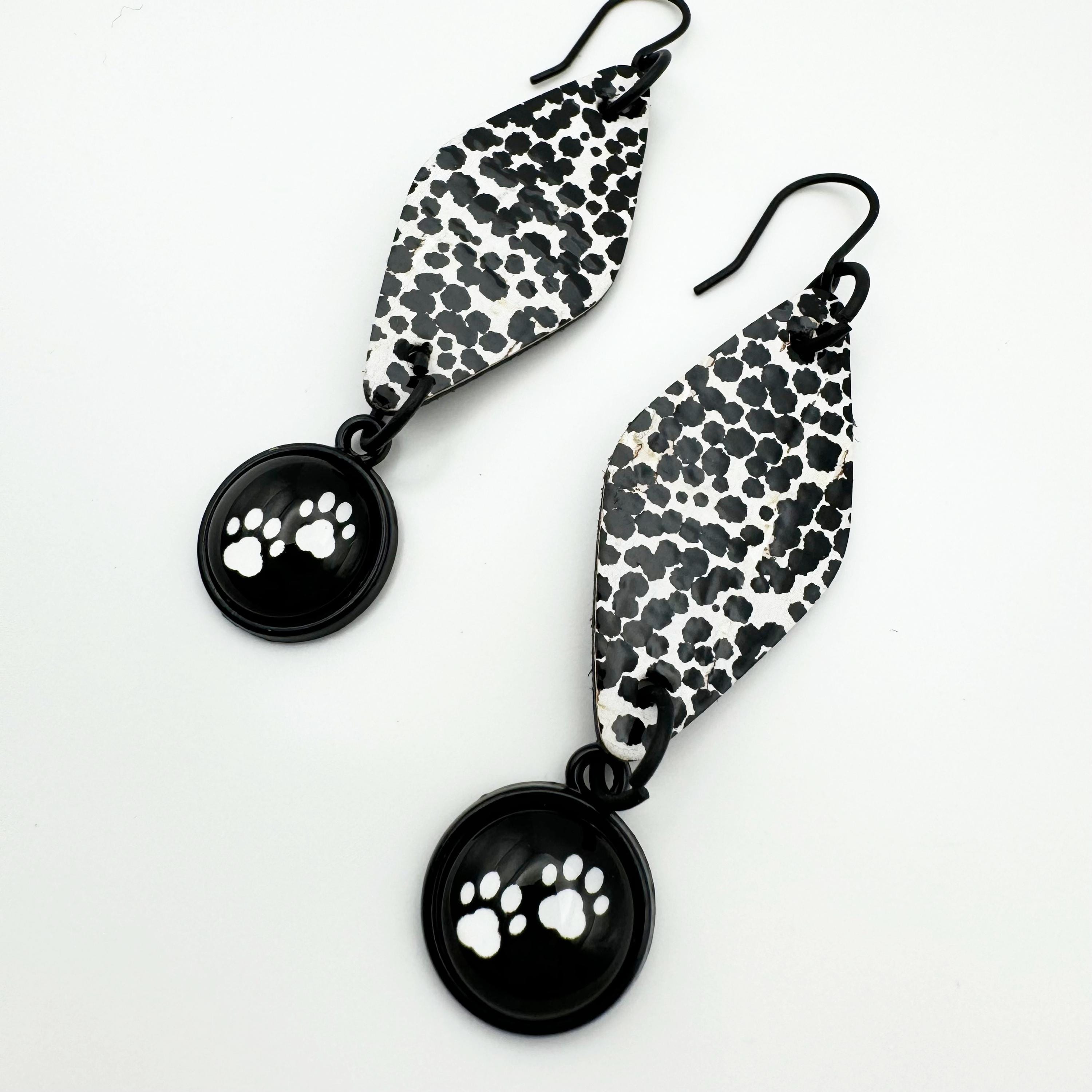 The earrings are made with a black hook, an 12mm cabochon with a paw and leather backed cork. These are fun, diamond shaped earrings hanging 2.75 inches! They have a diamond, black and white polka dot shape in leather backed cork with the paw cabochon hanging from the bottom.