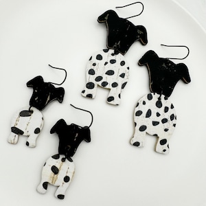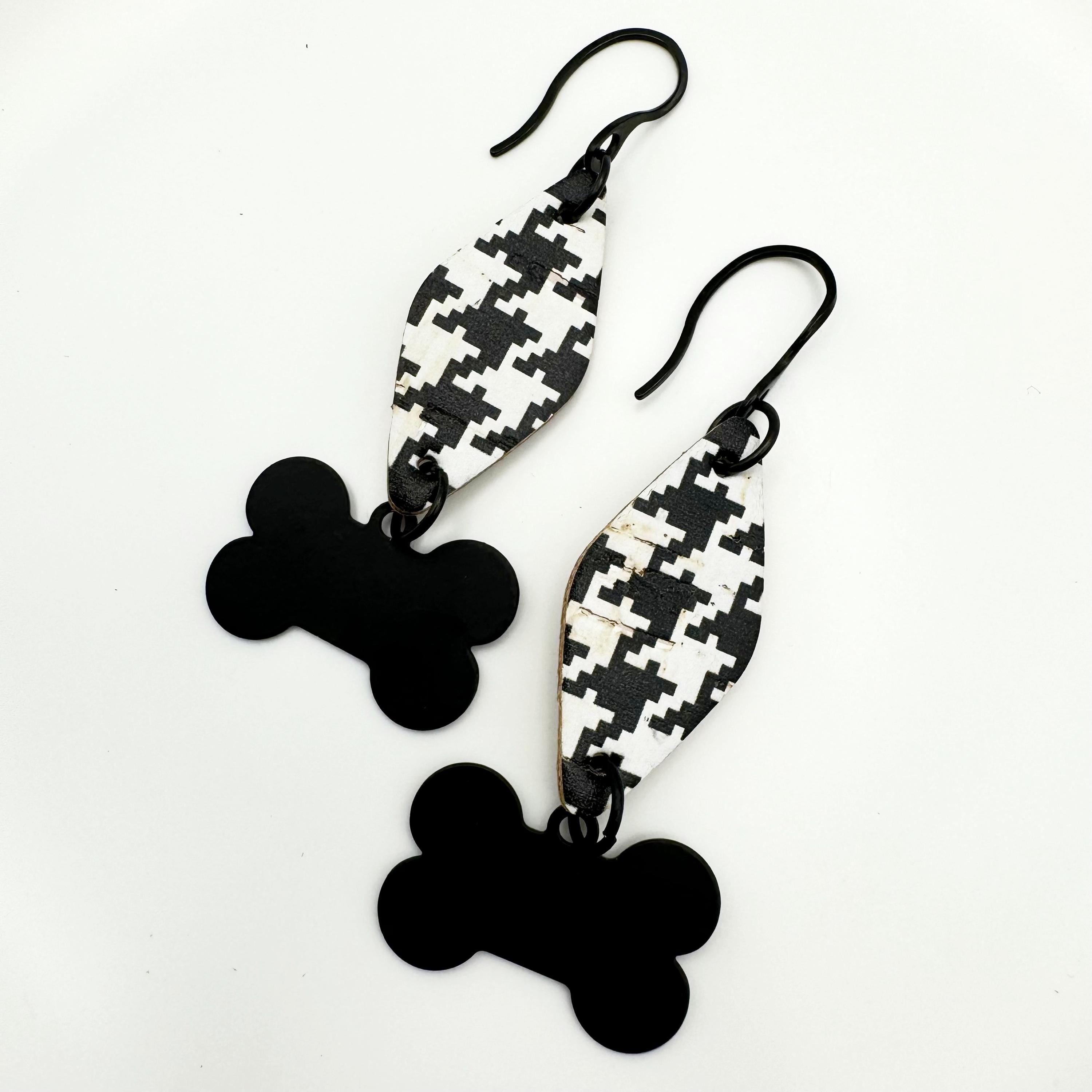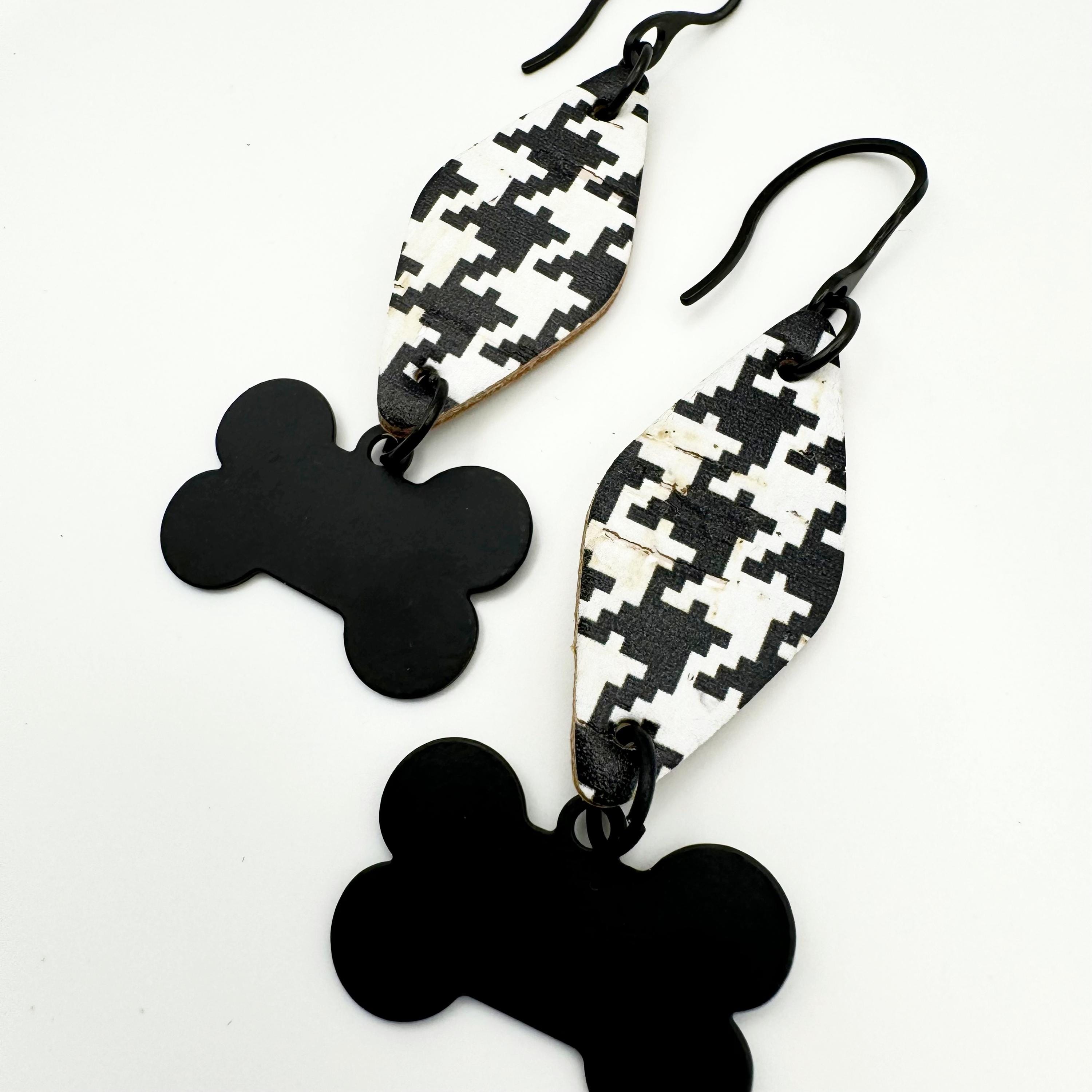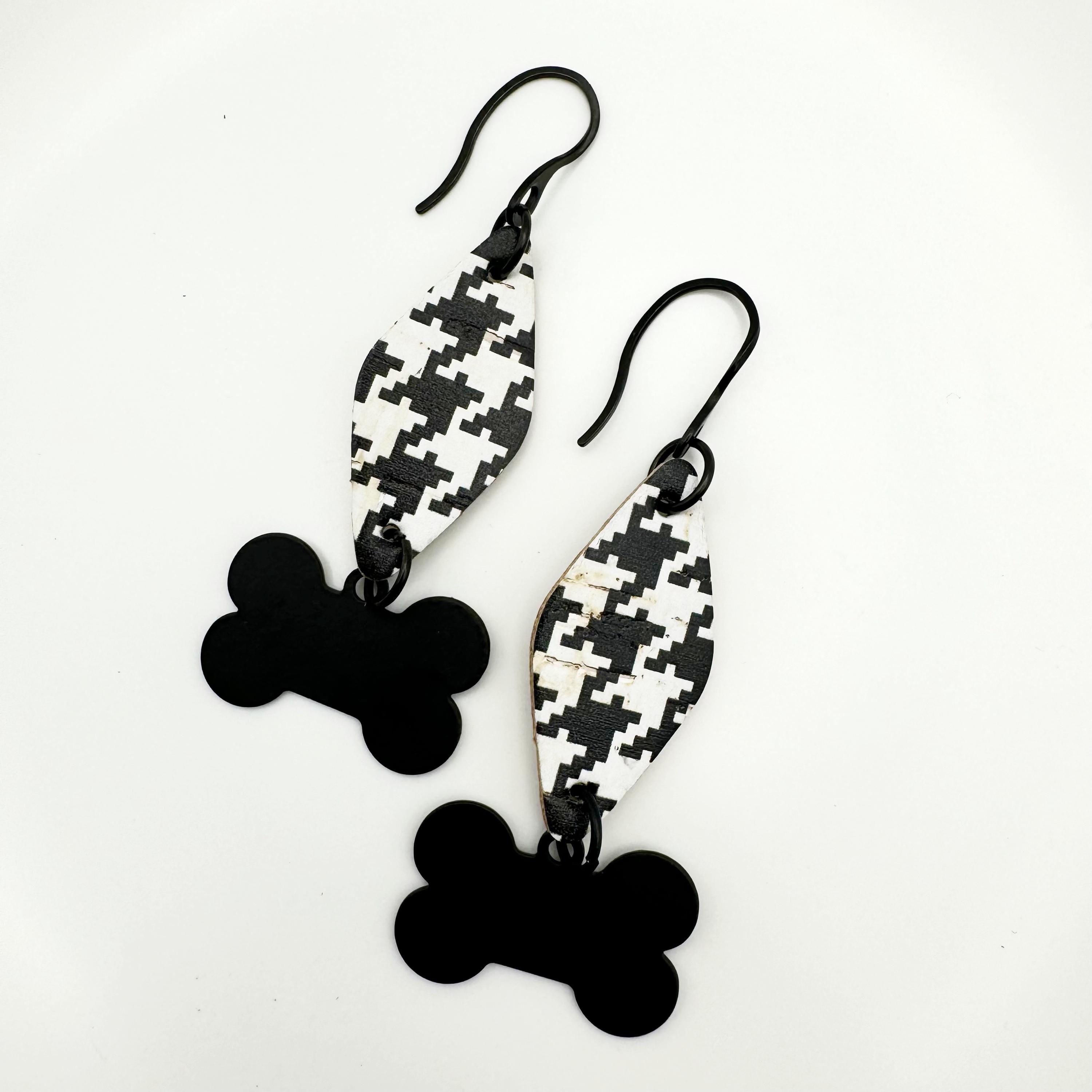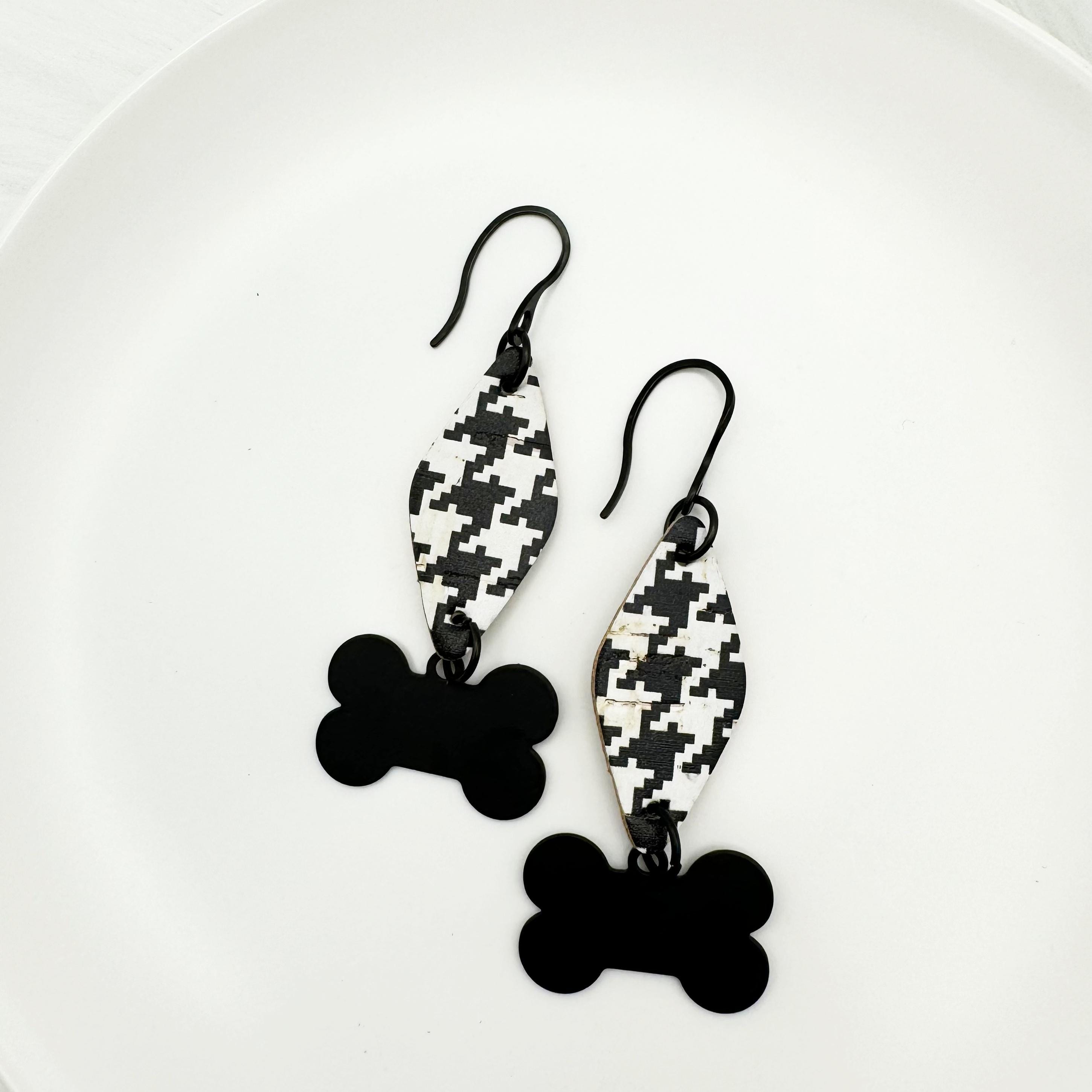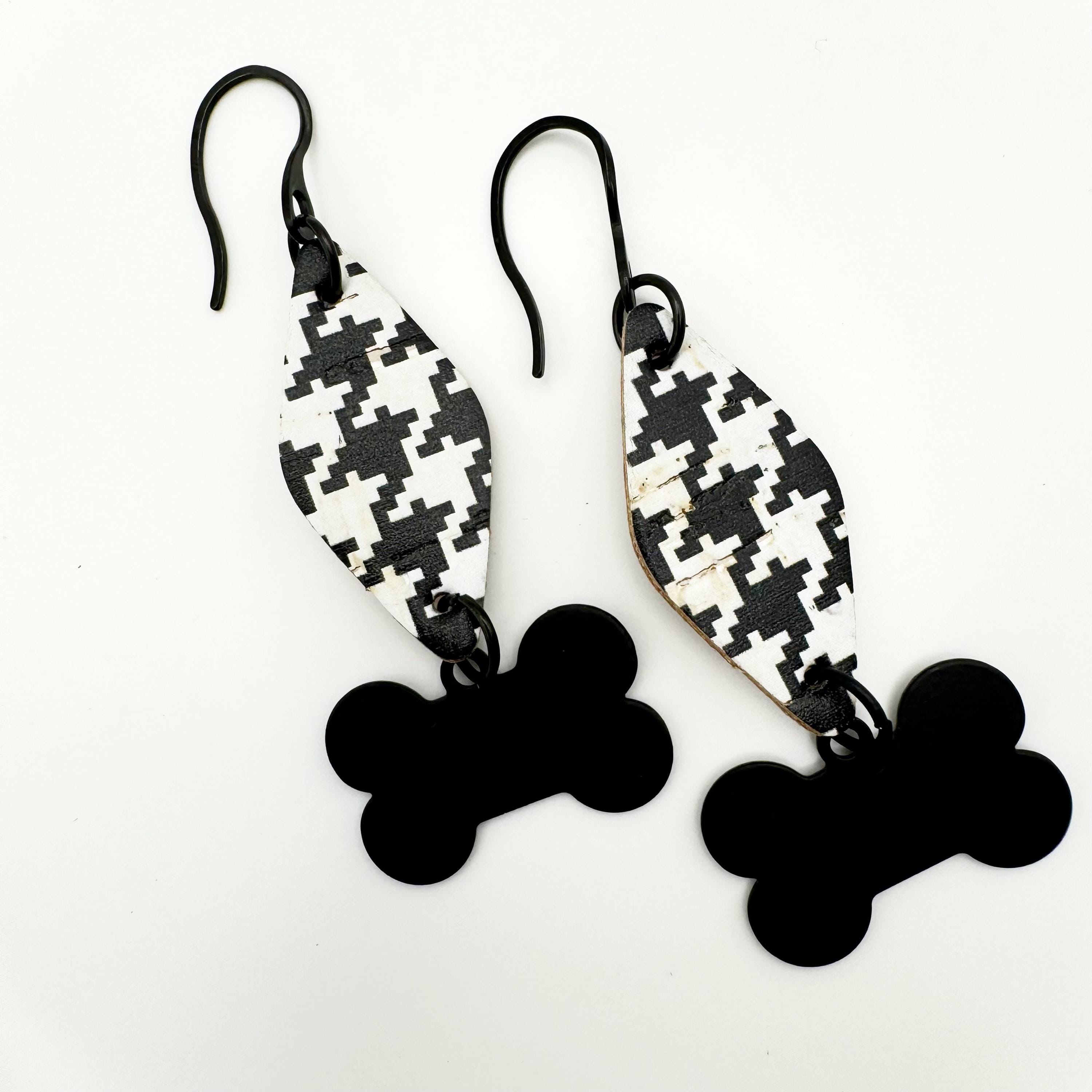 The earrings are made with a stainless black hook and leather backed cork. The black and white houndstooth in a triangle shape in leather backed cork have a black bone charm dangling from the cork triangle. These are way too cute and hang 2.75 inches.