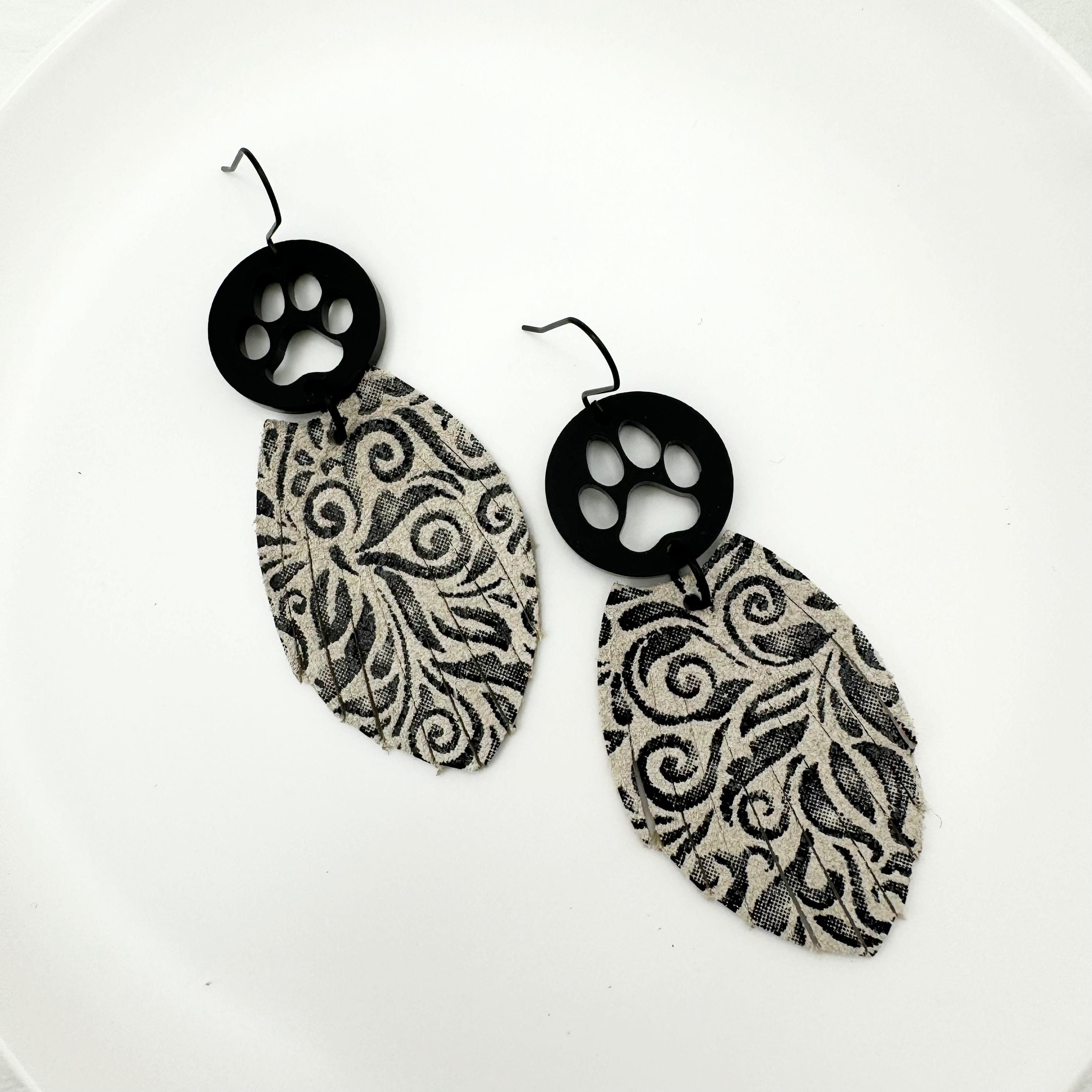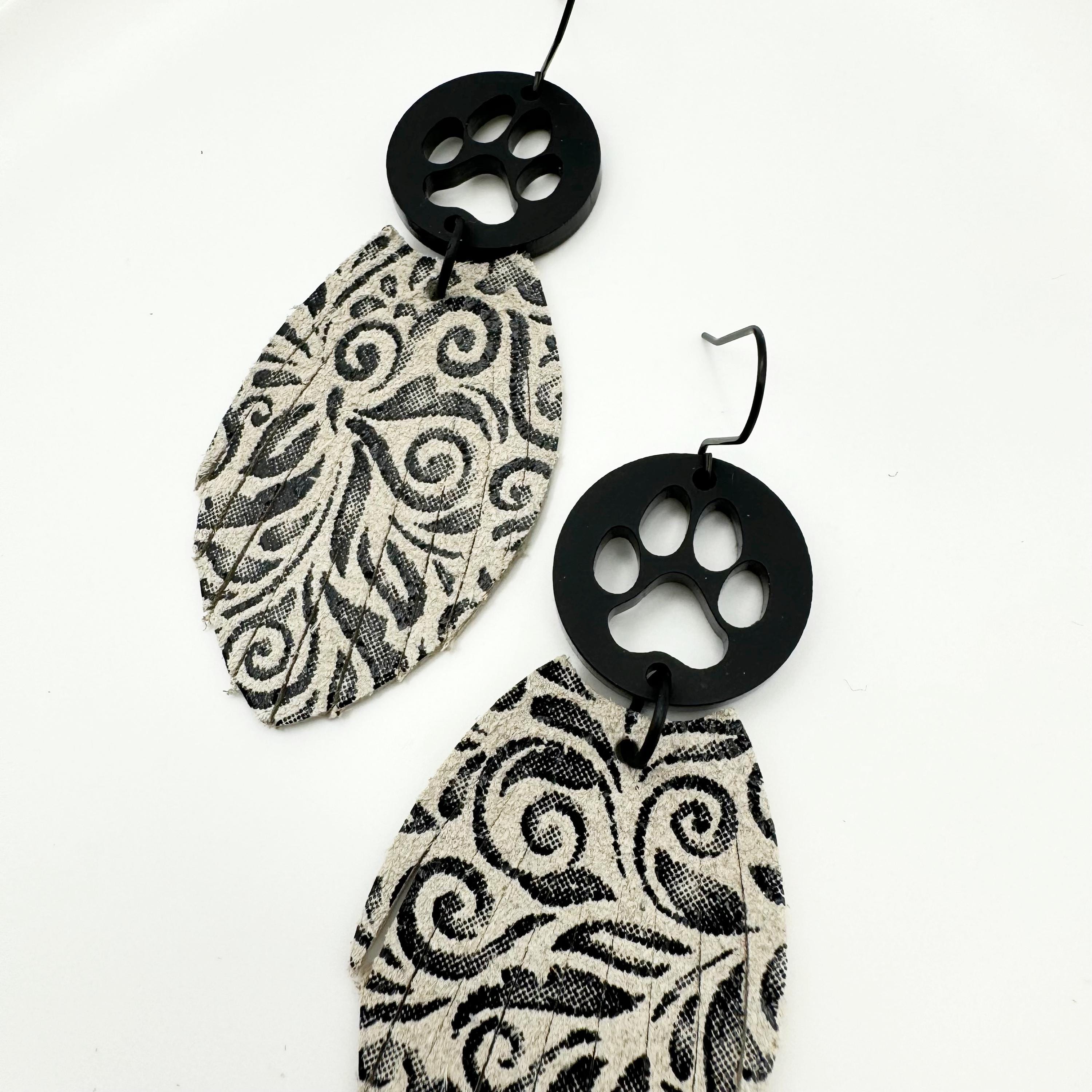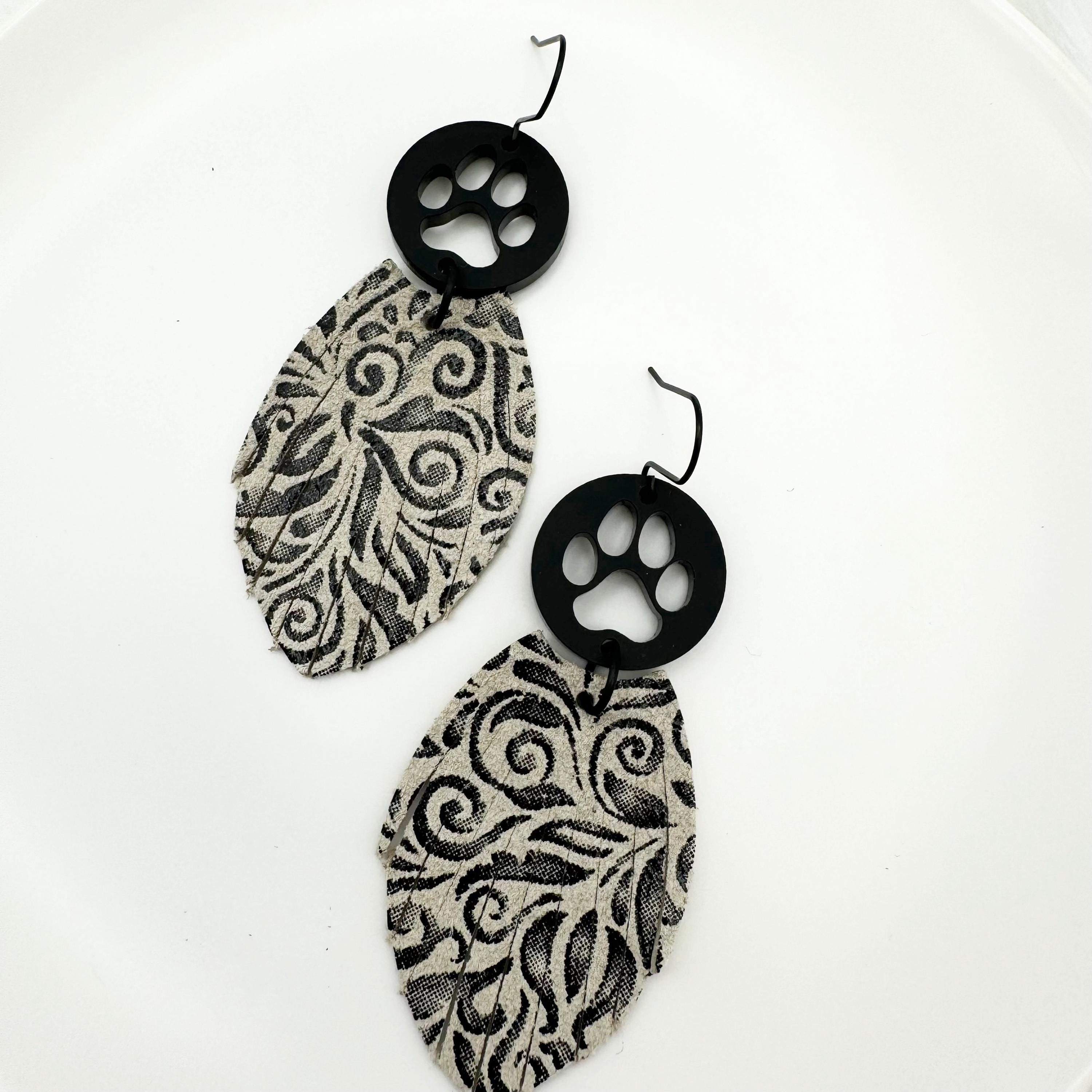 These feather, pointed drop earrings are so lightweight you won't even feel them hanging from your ears. The feathers are embossed cream cowhide with a beautiful, black swirl hanging from a round acrylic paw. These hang about 3"!