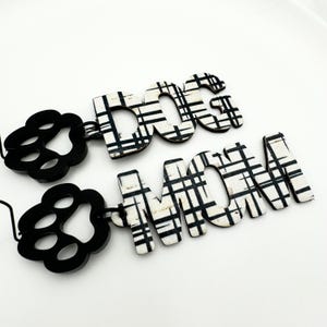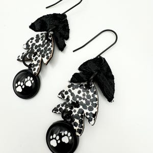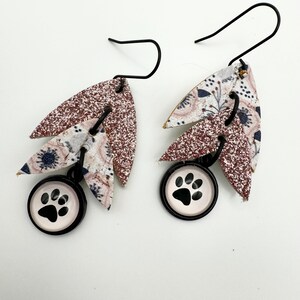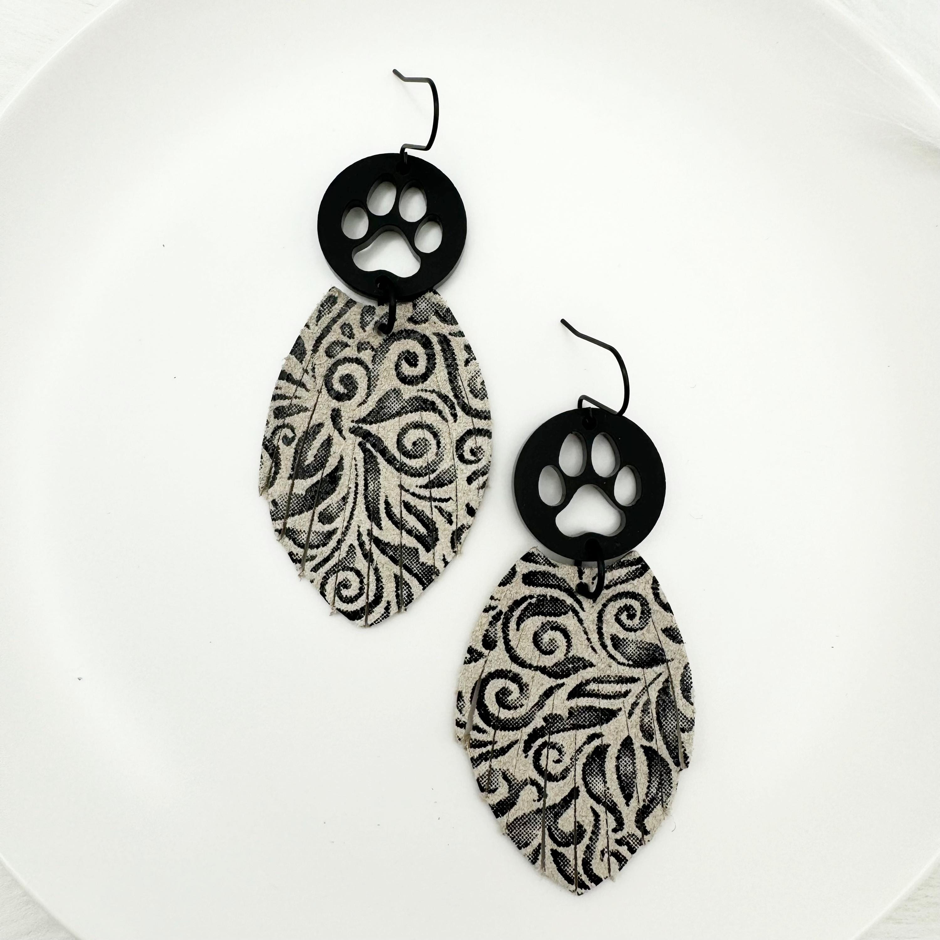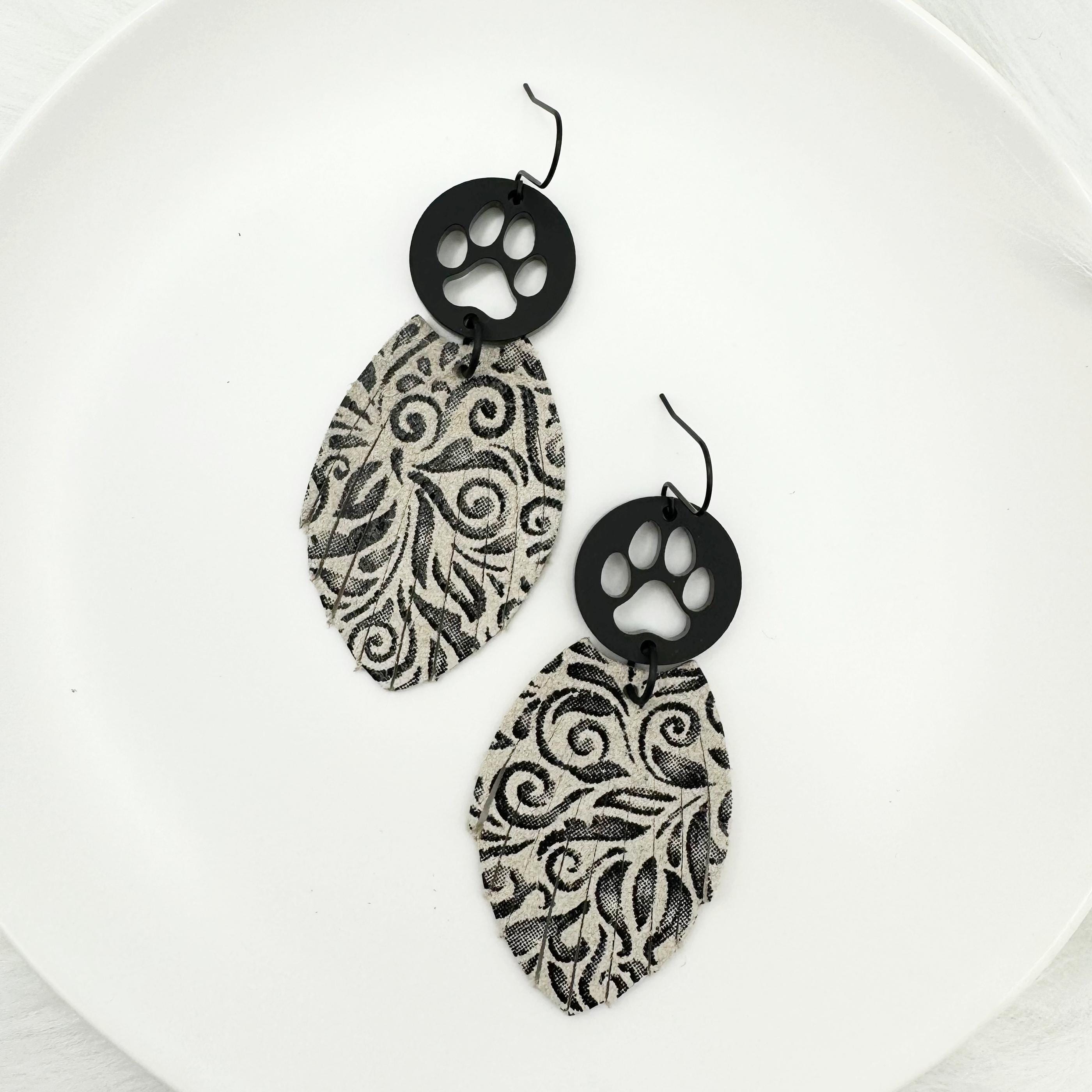 These feather, pointed drop earrings are so lightweight you won't even feel them hanging from your ears. The feathers are embossed cream cowhide with a beautiful, black swirl hanging from a round acrylic paw. These hang about 3"!