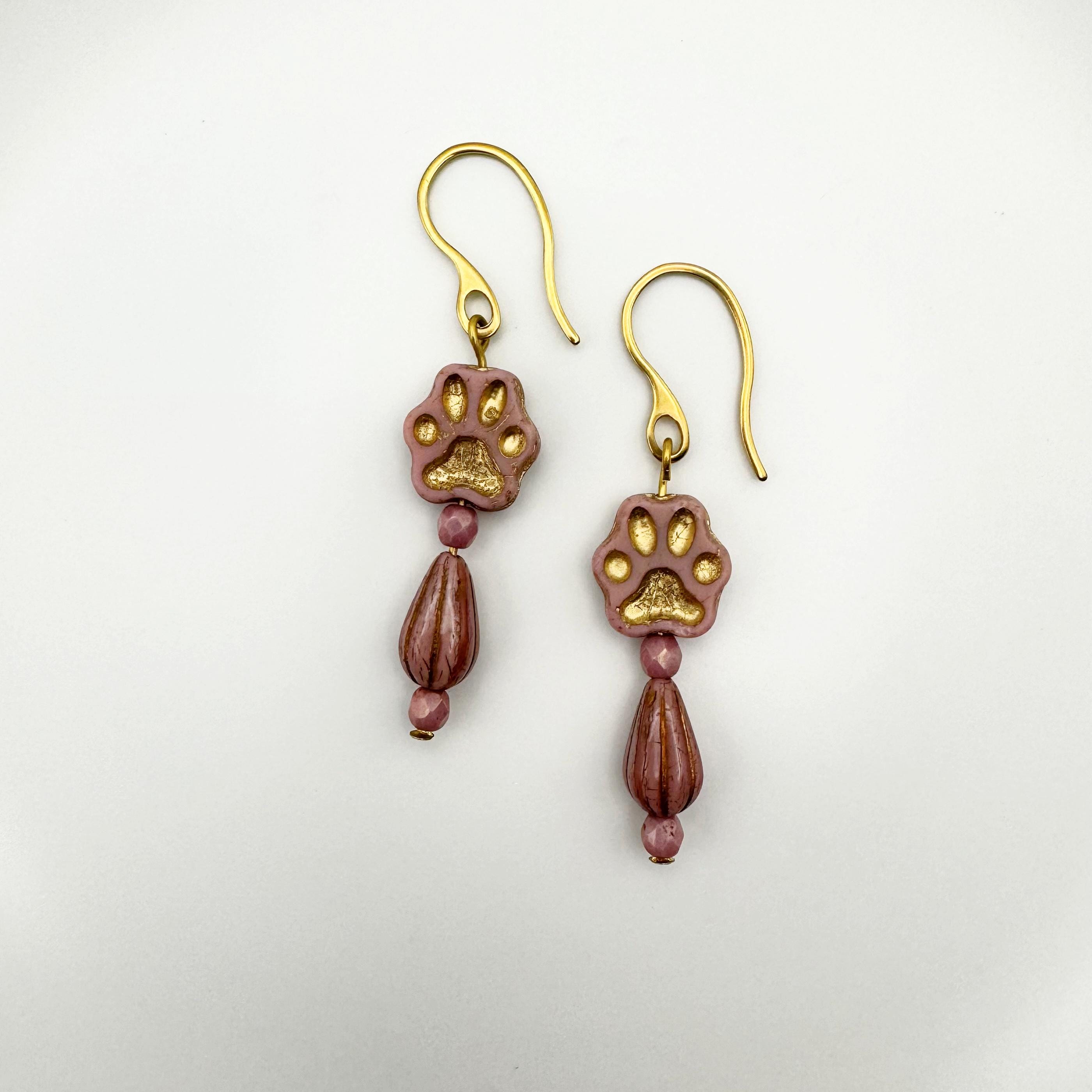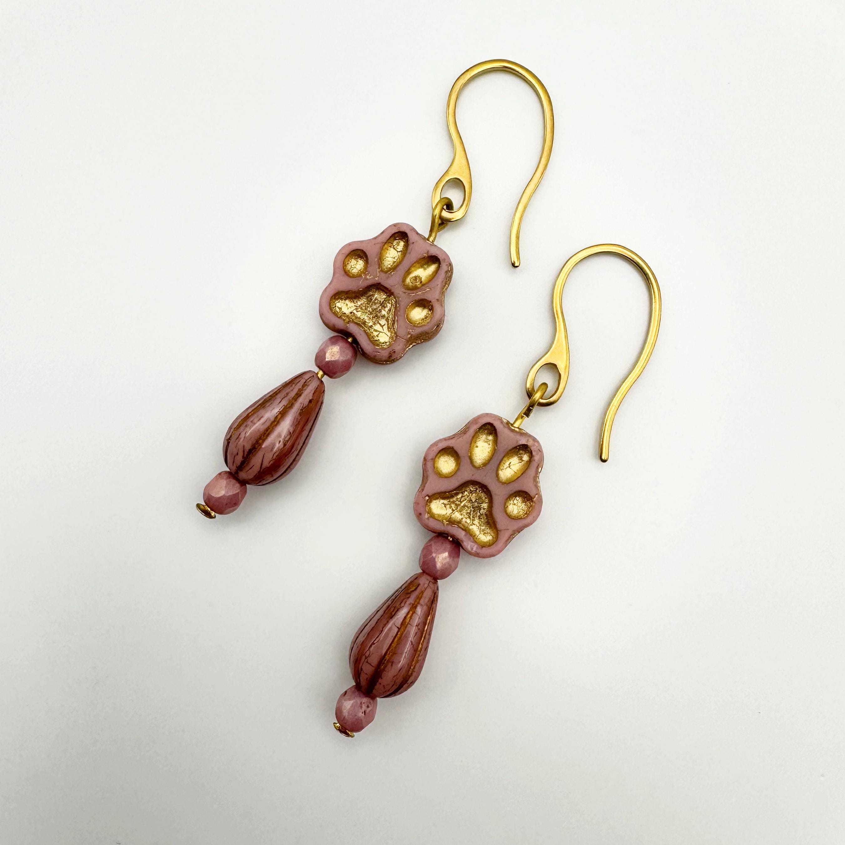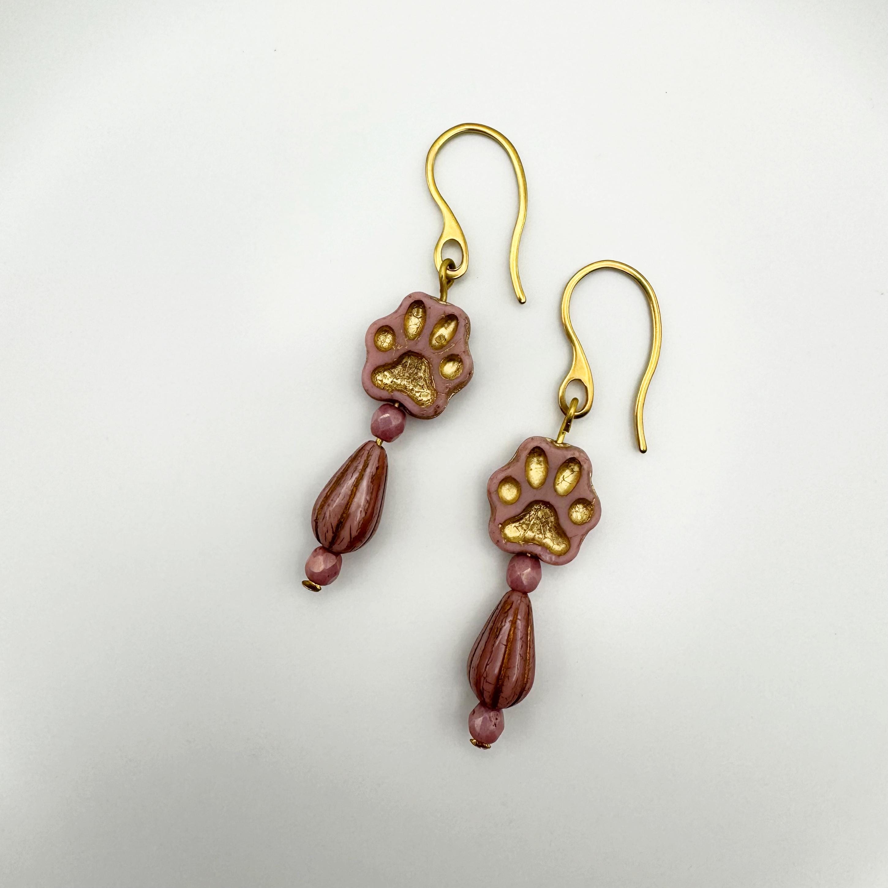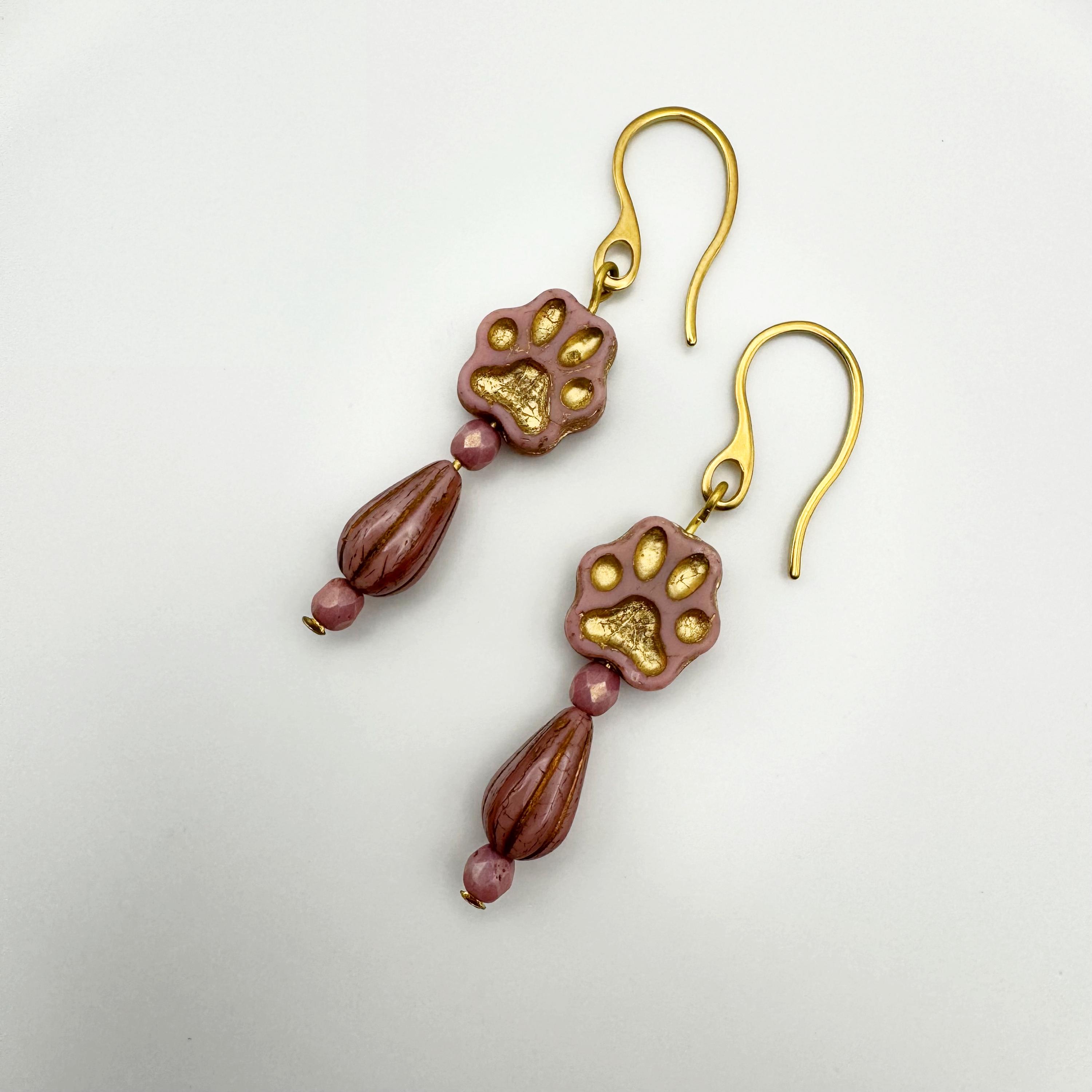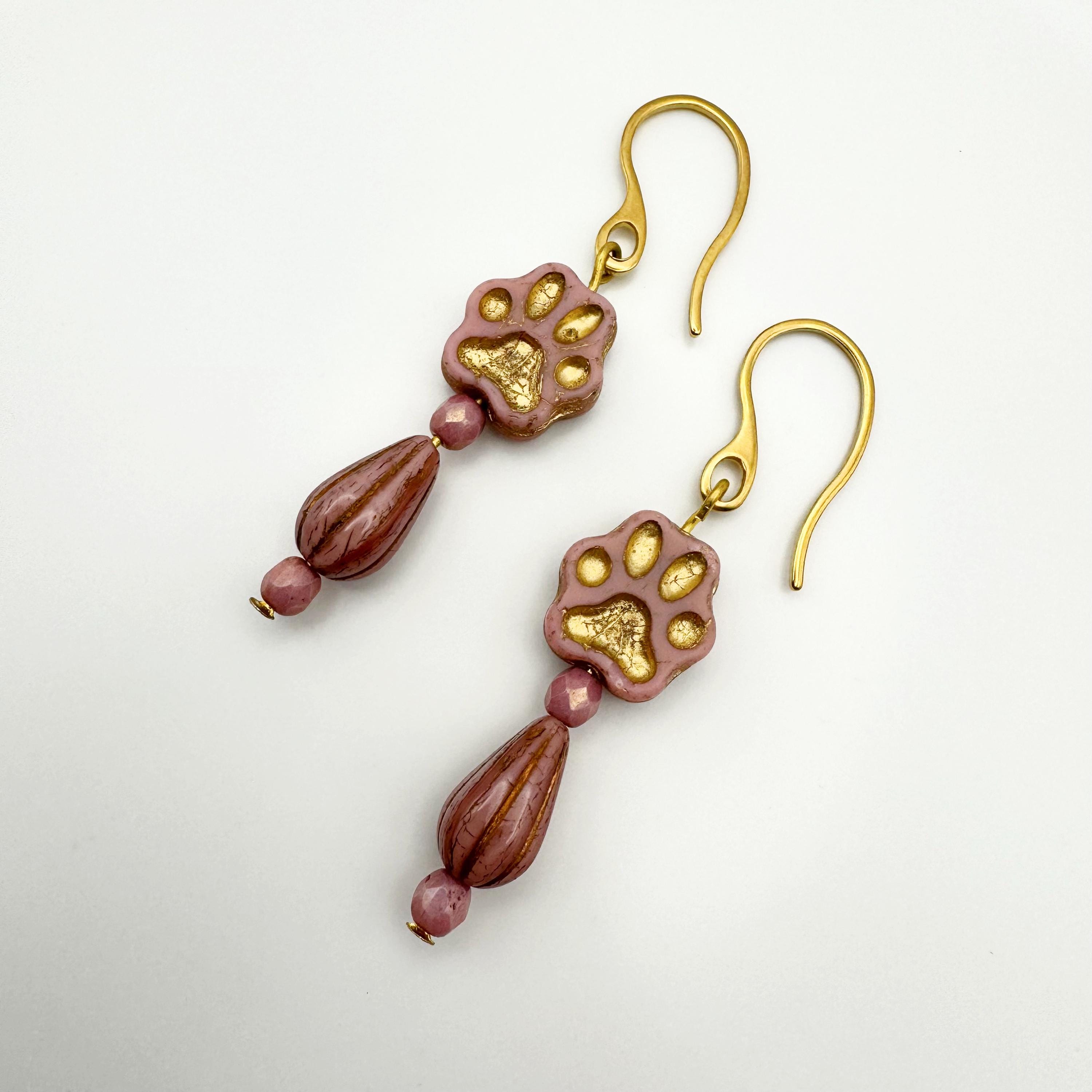Celebrate the love of your dog or cat with these adorable paw earrings. The paw is a Czech dusty pink bead with gold accents. It is hanging with a tulip, teardrop melon bead with tiny Czech fire polished mauve beads. You will find gold earring components on these dog lover earrings and they hang about 2 inches. These are an amazing and fun accessory to add to any outfit!