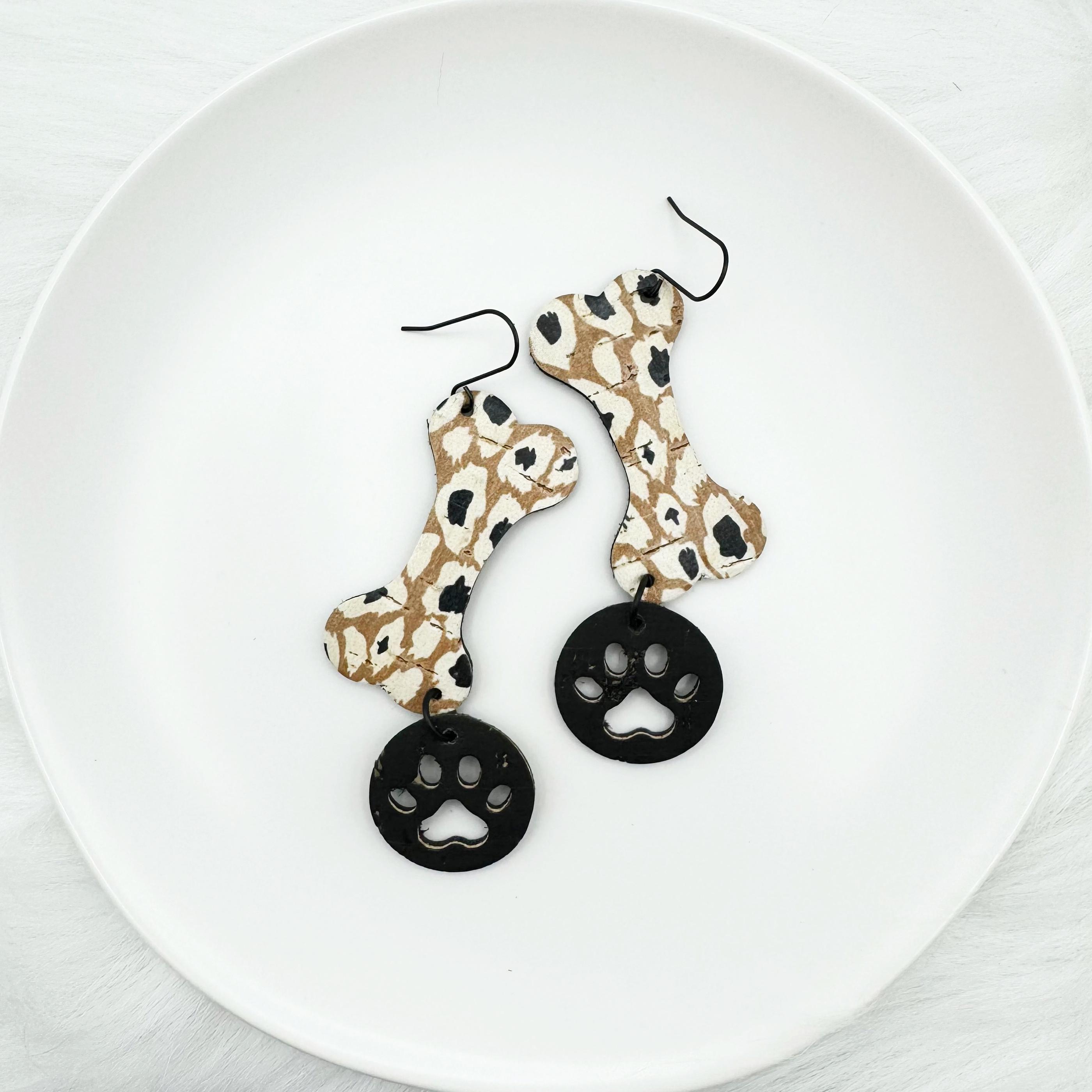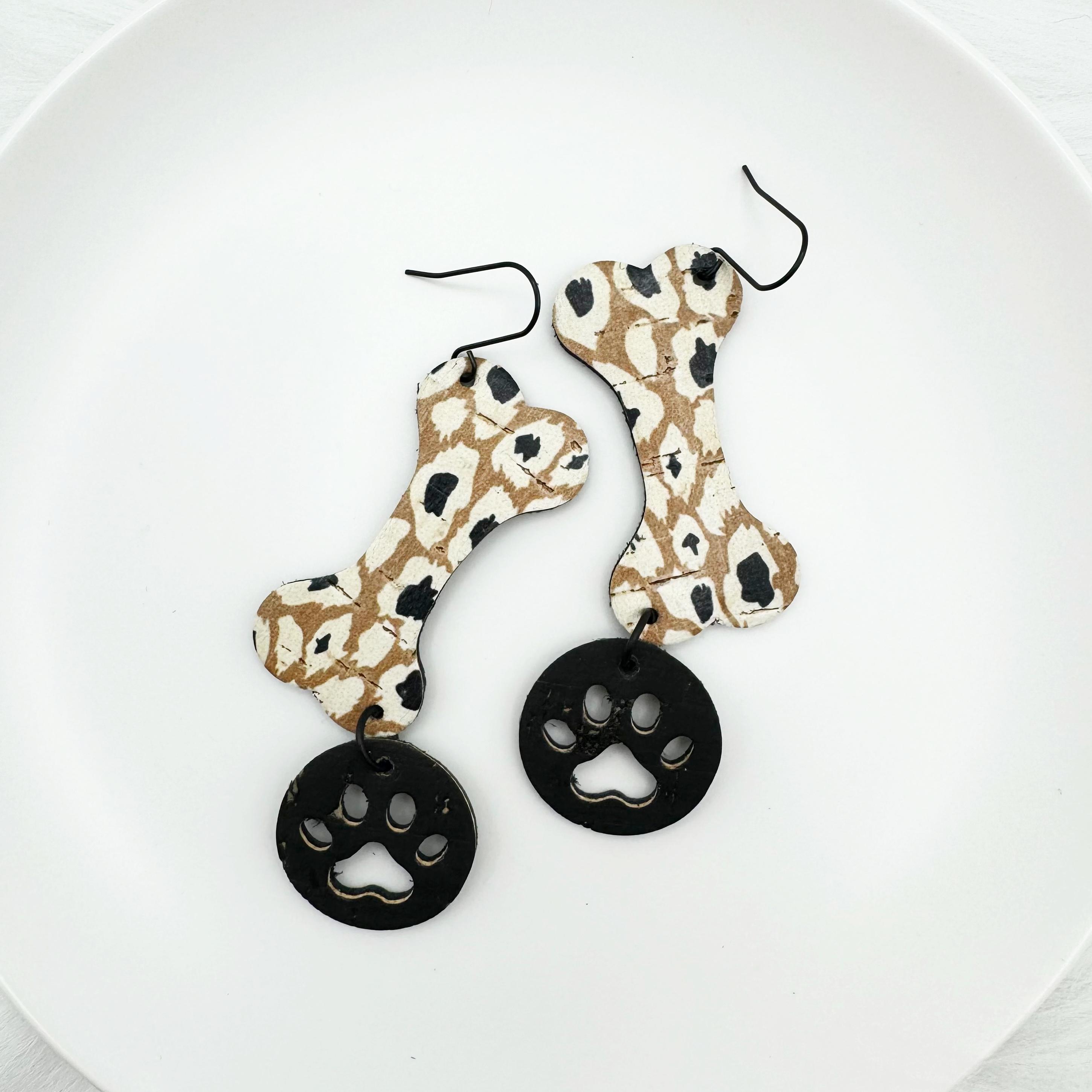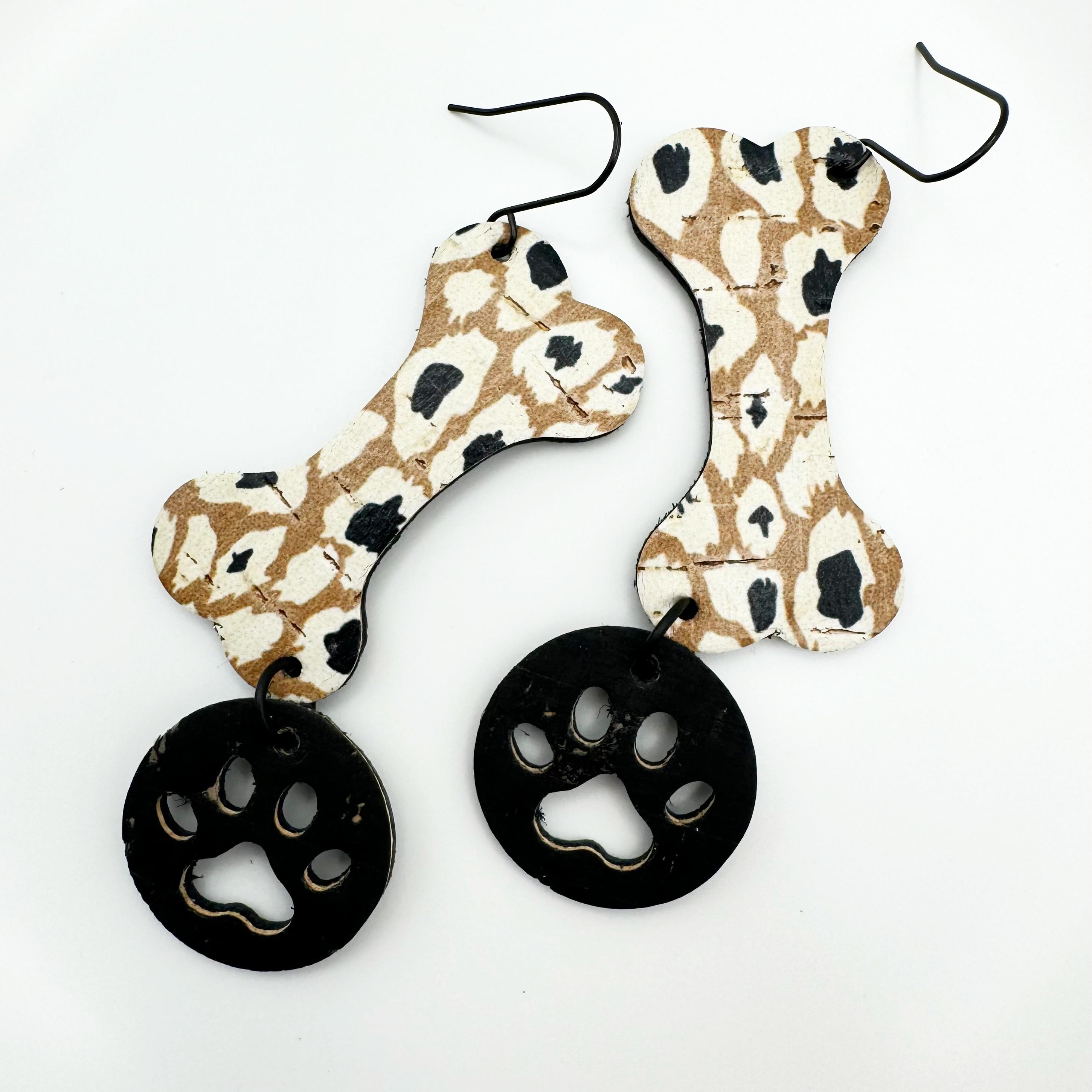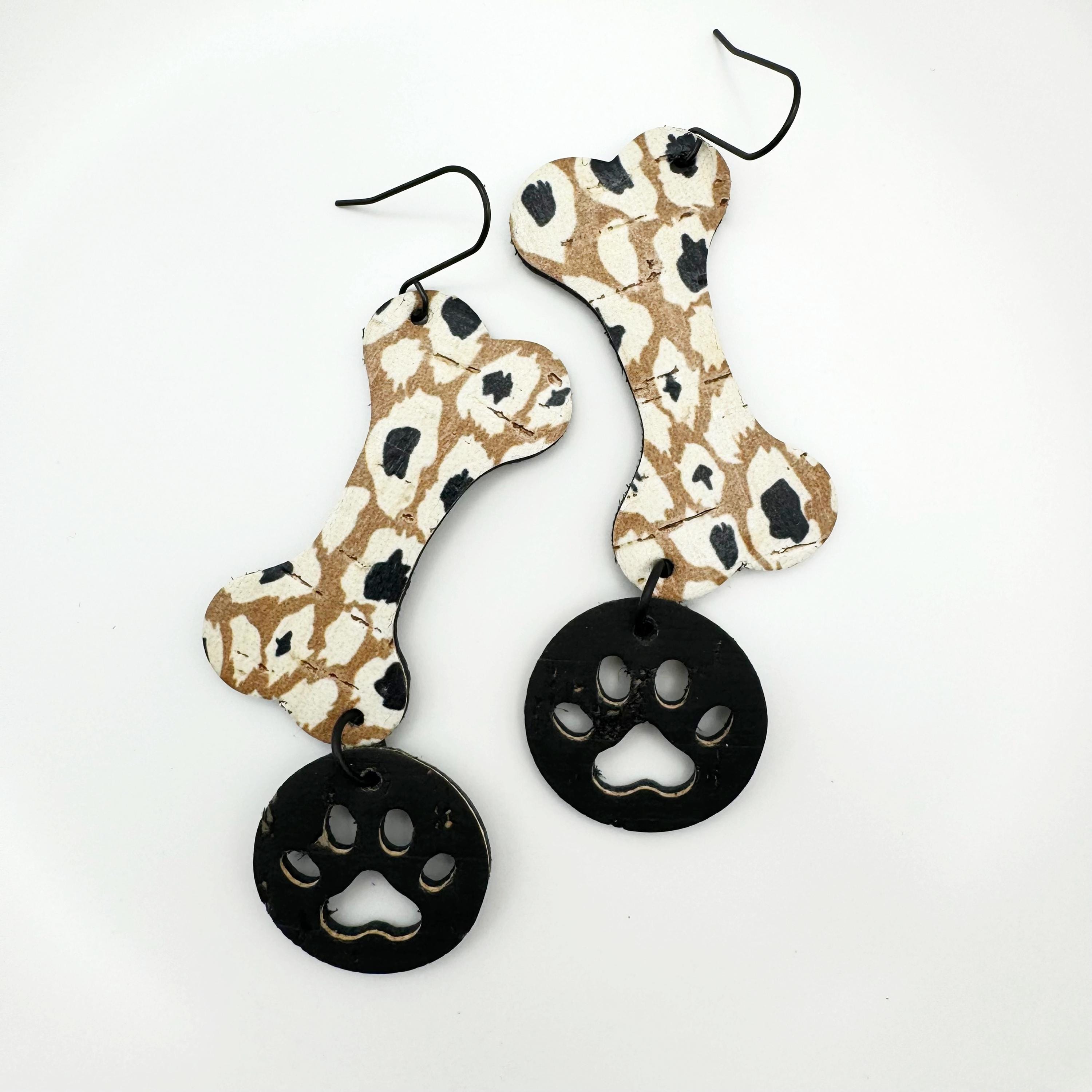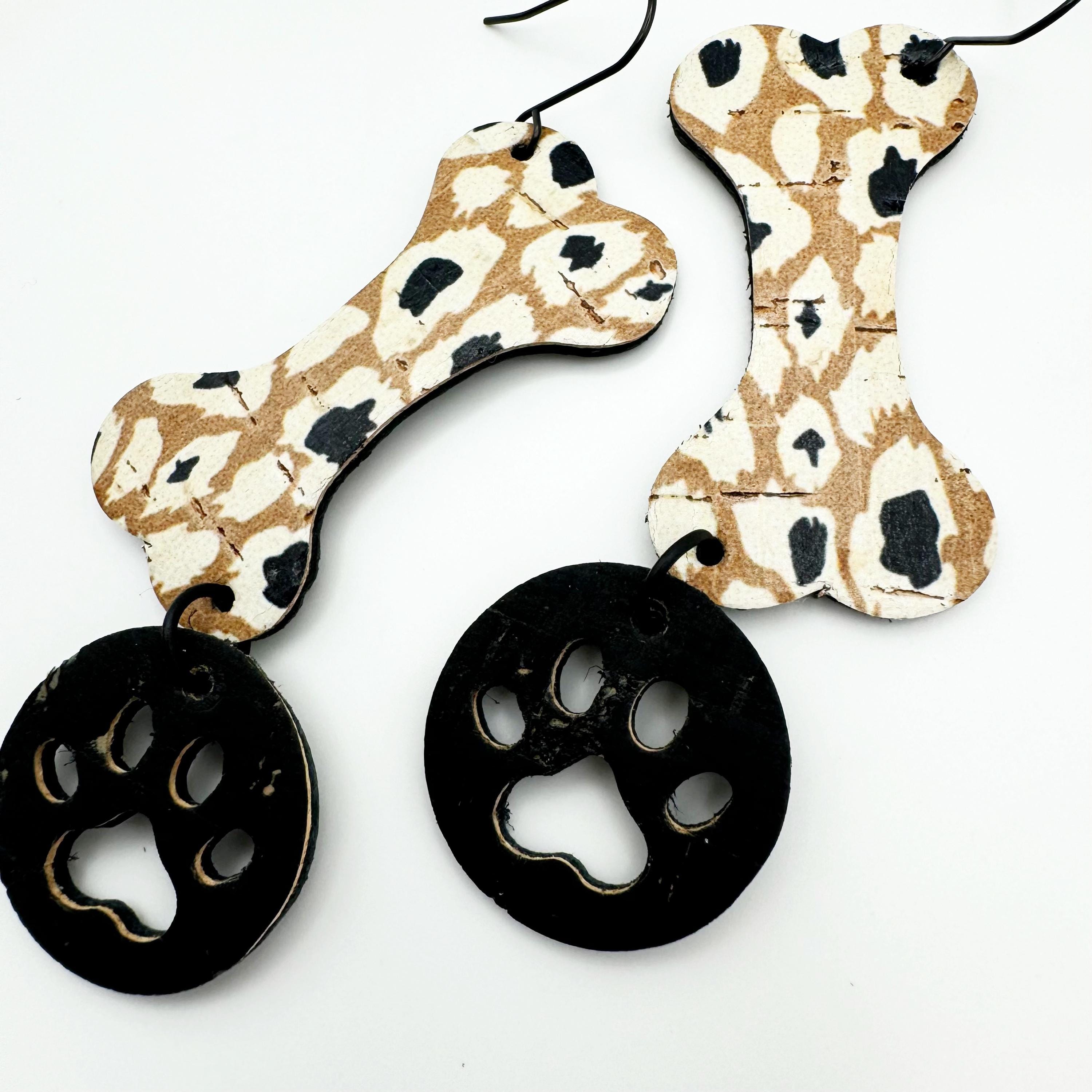 The earrings are made with a black hook and leather backed cork. The bone is a fun, black, cream and mustard yellow leopard animal print leather backed cork with a black cutout paw in leather backed cork dangling from the bone. These are way too cute and hang 3.5 inches.