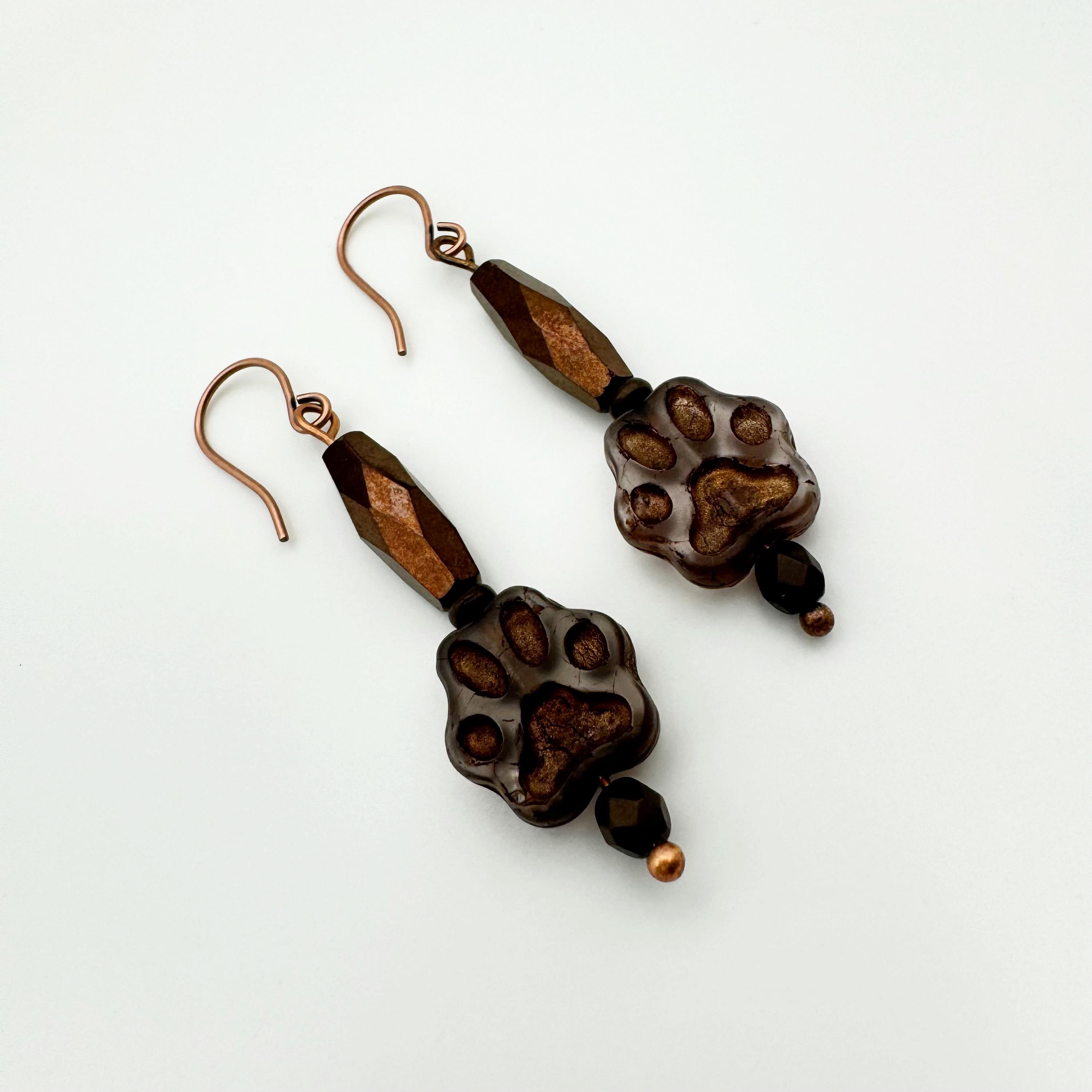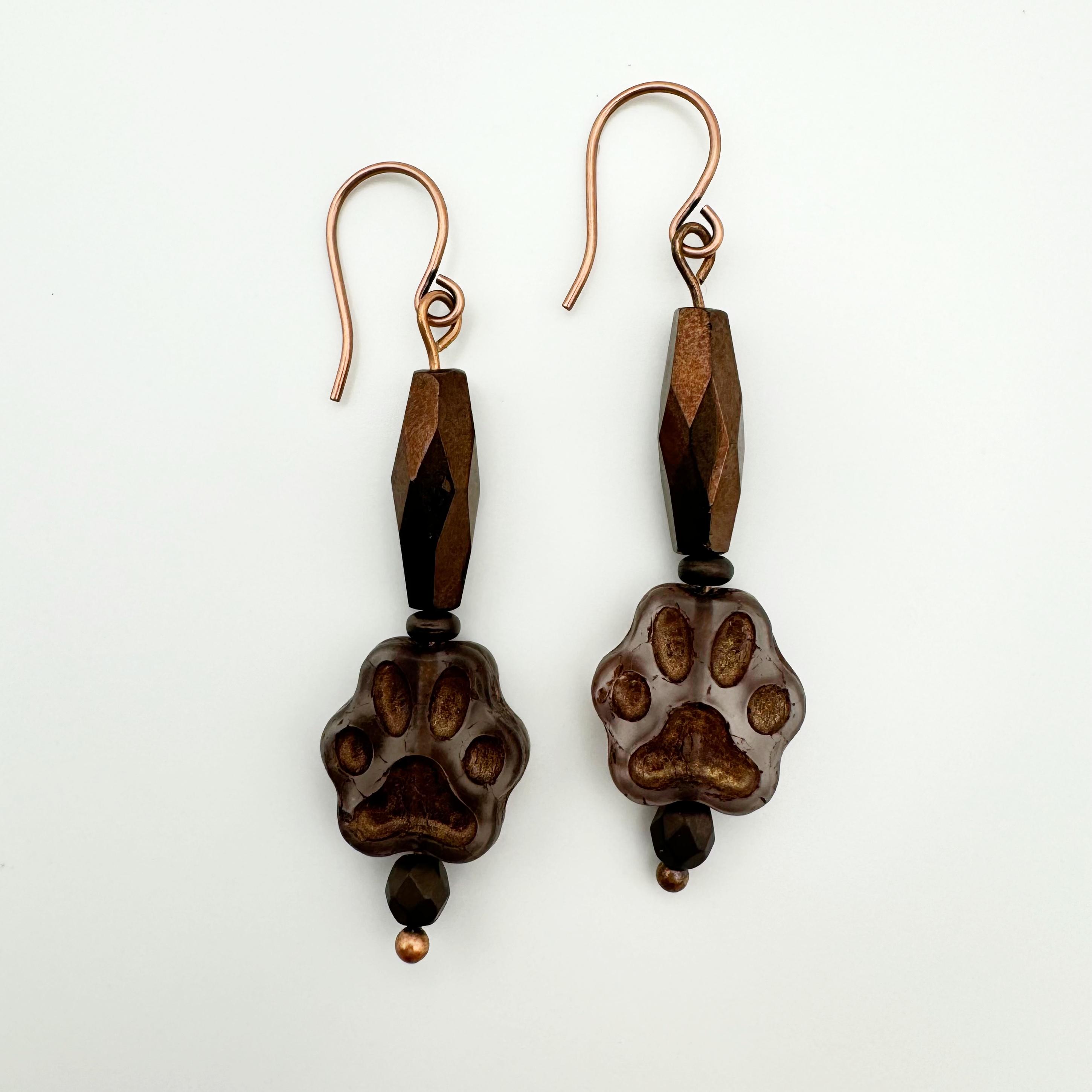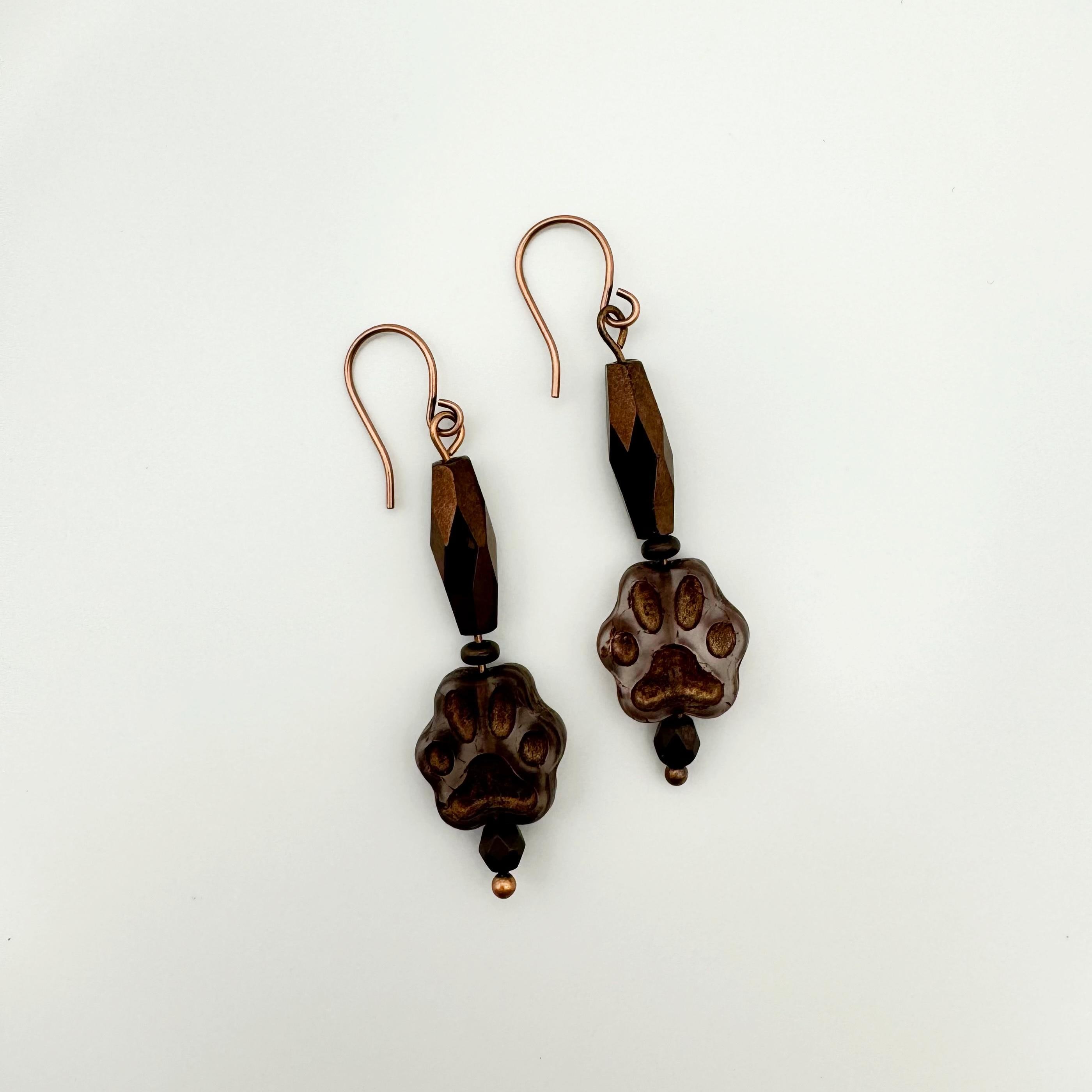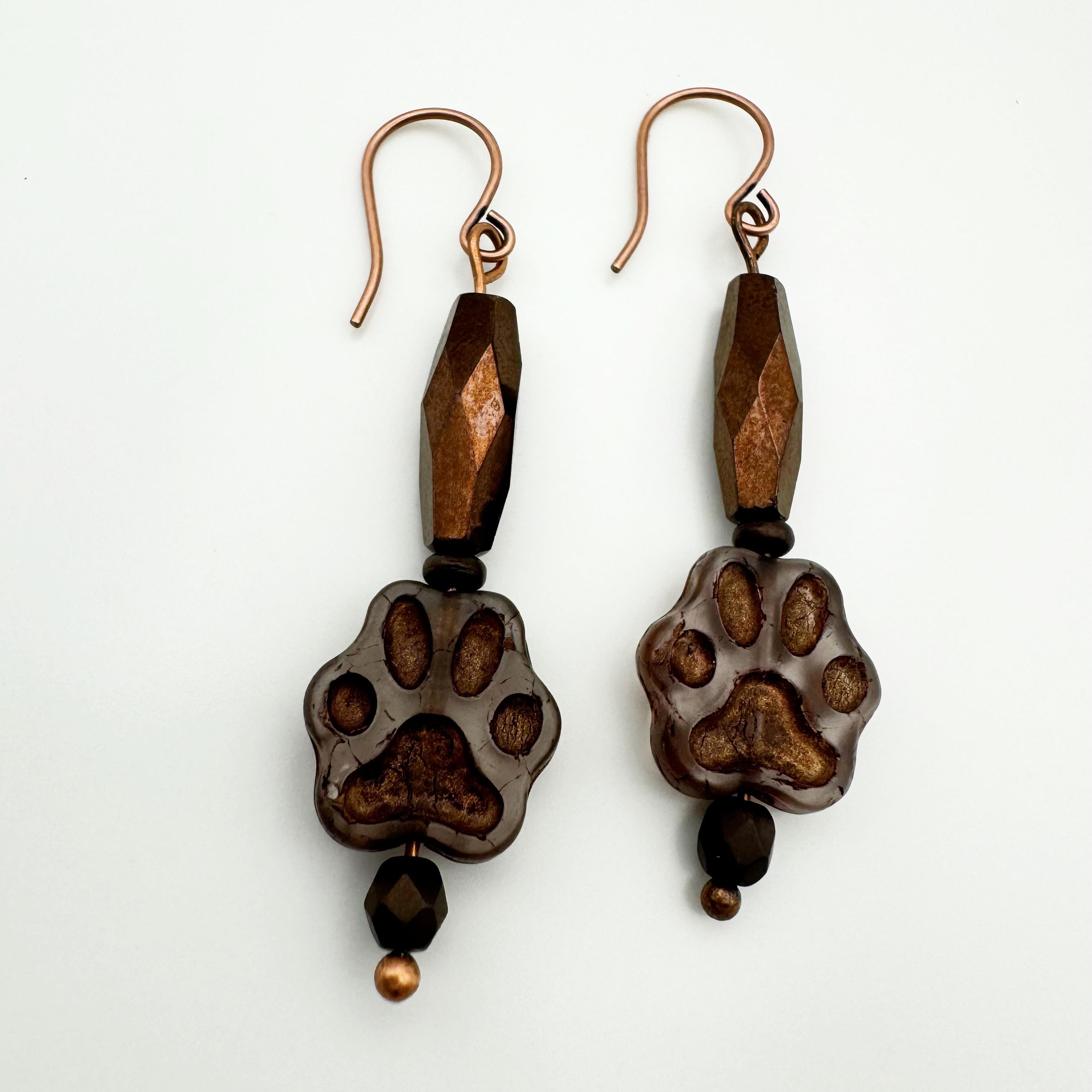 Celebrate the love of your dog or cat with these adorable paw earrings. The paw is a Czech transparent brown bead with bronze accents. It is hanging with a faceted, metallic bronze tube bead. You will find copper earring components on these dog lover earrings and they hang about 2 inches. These are an amazing and fun accessory to add to any outfit!
