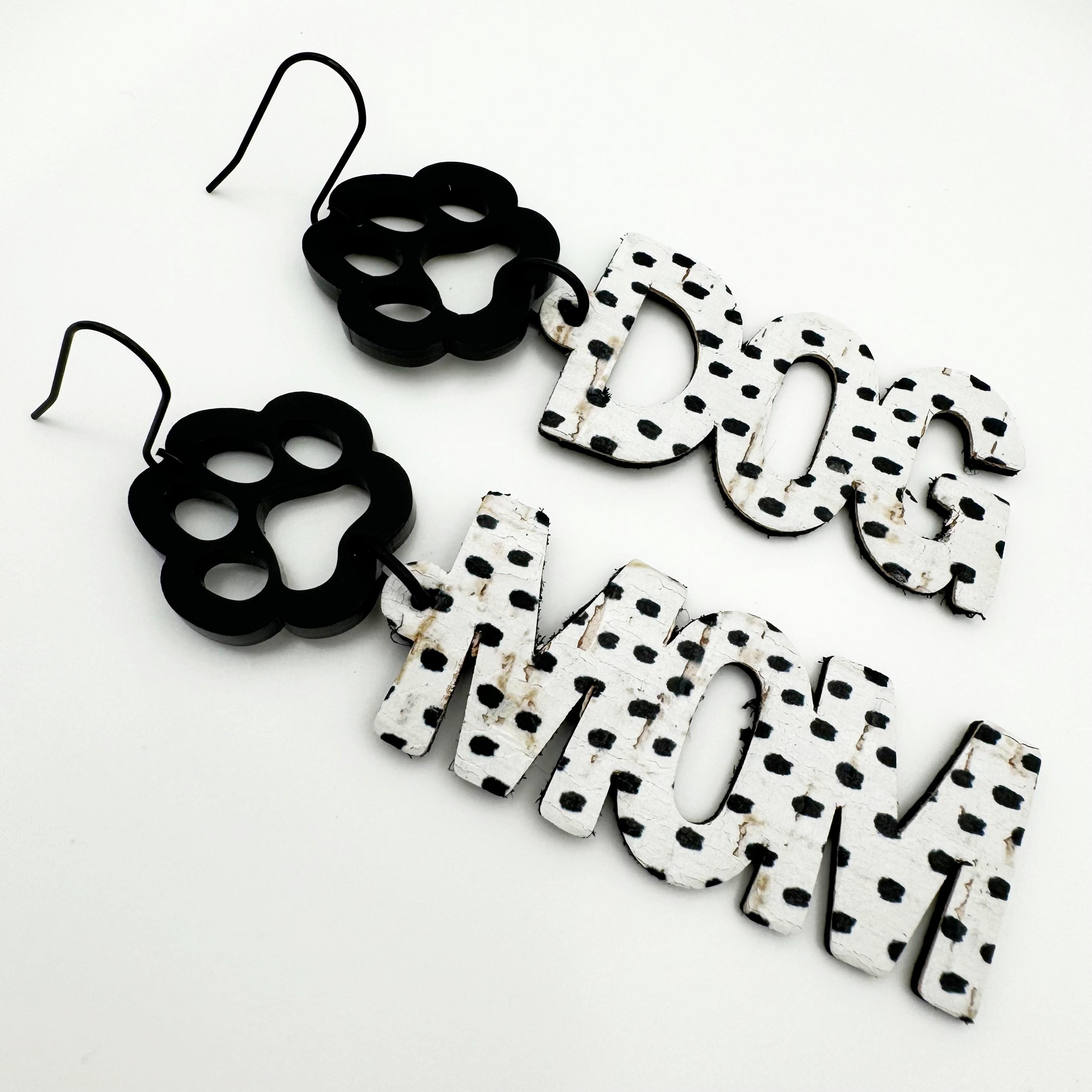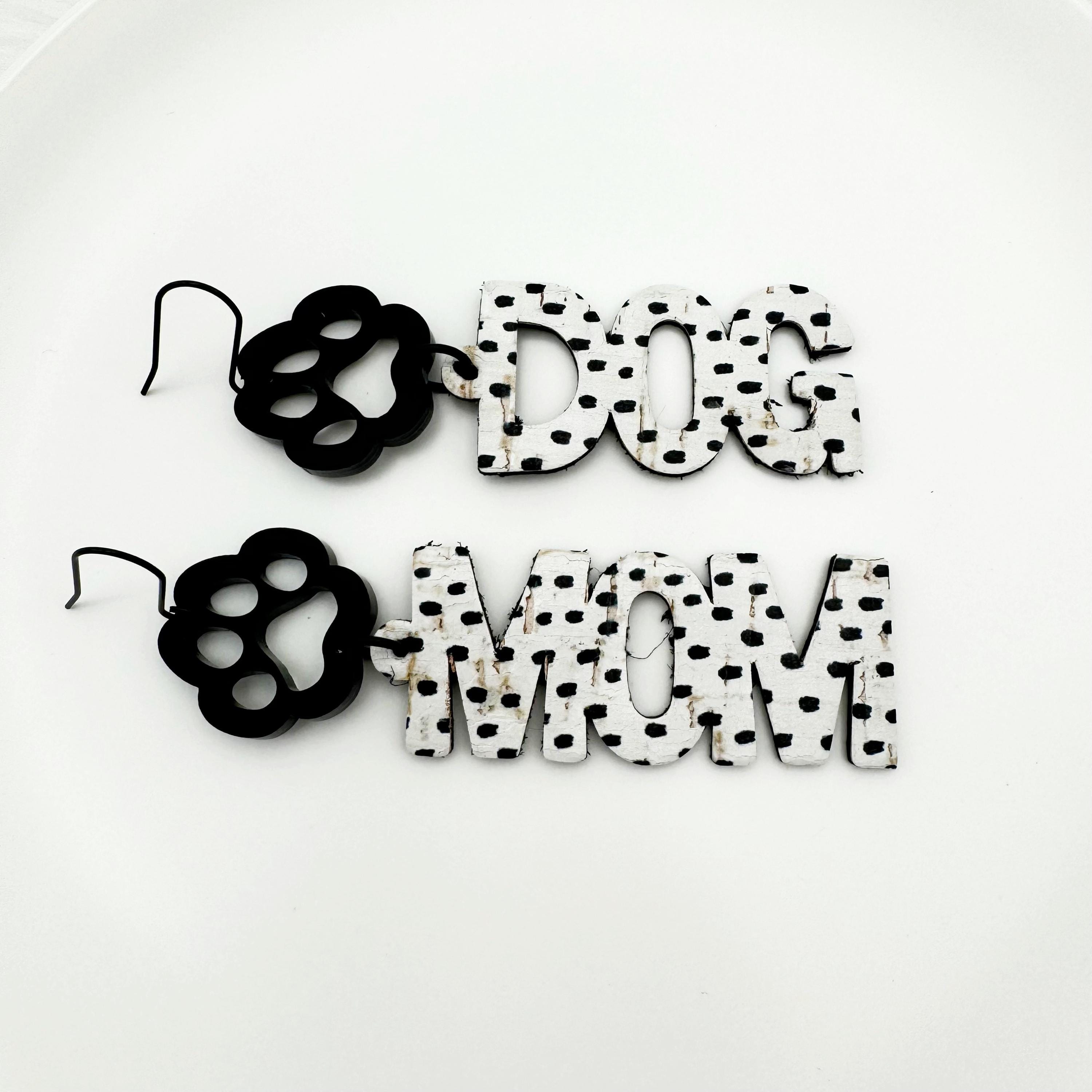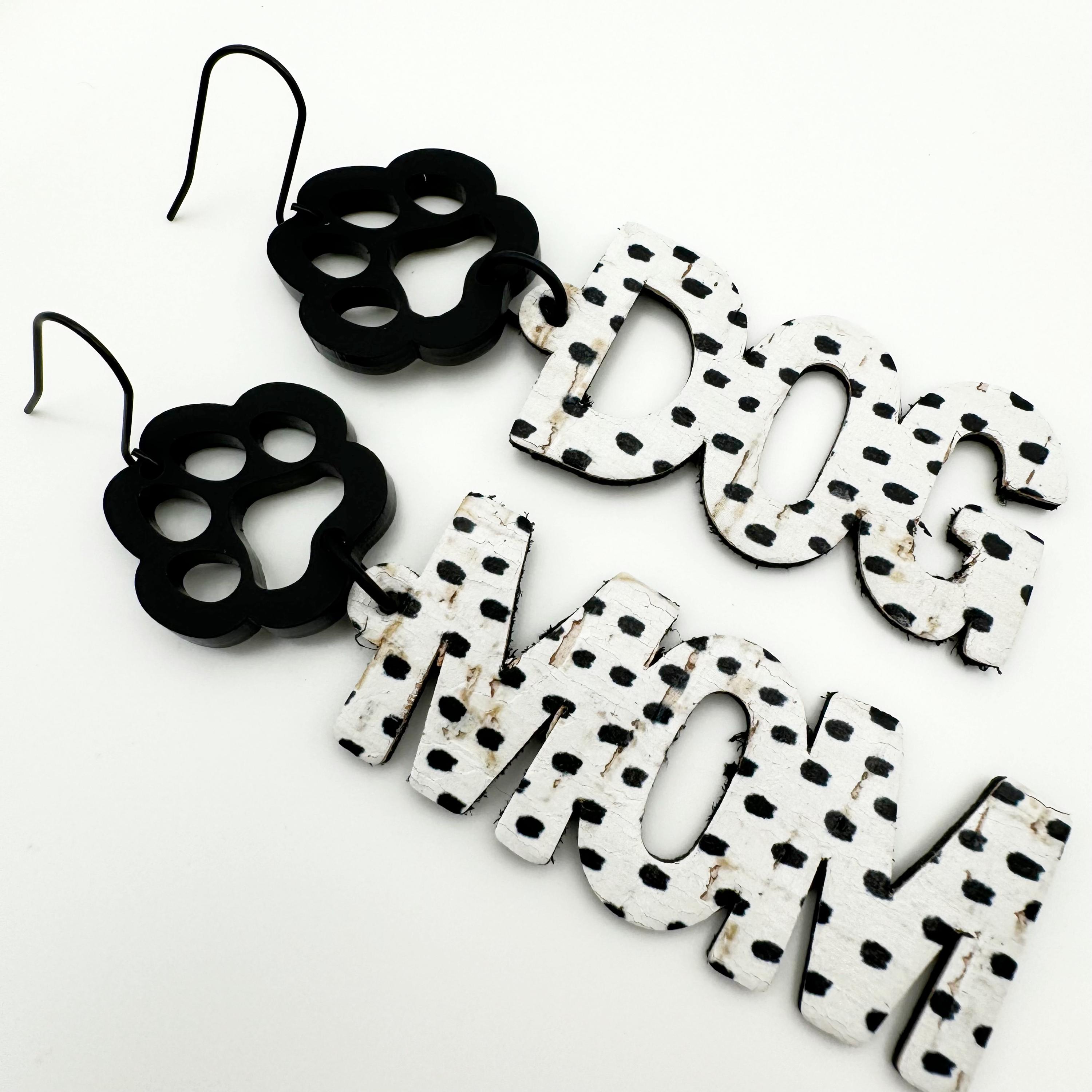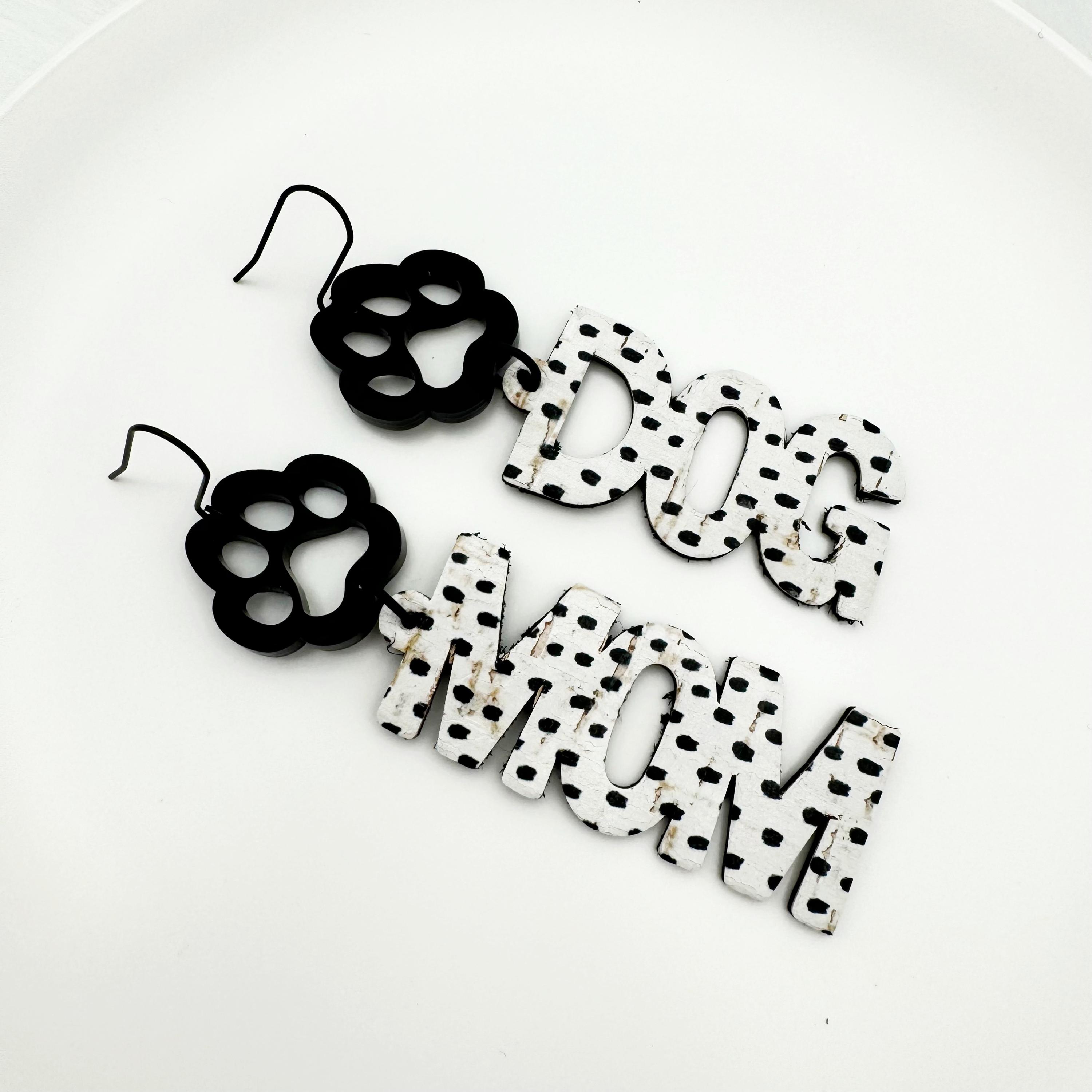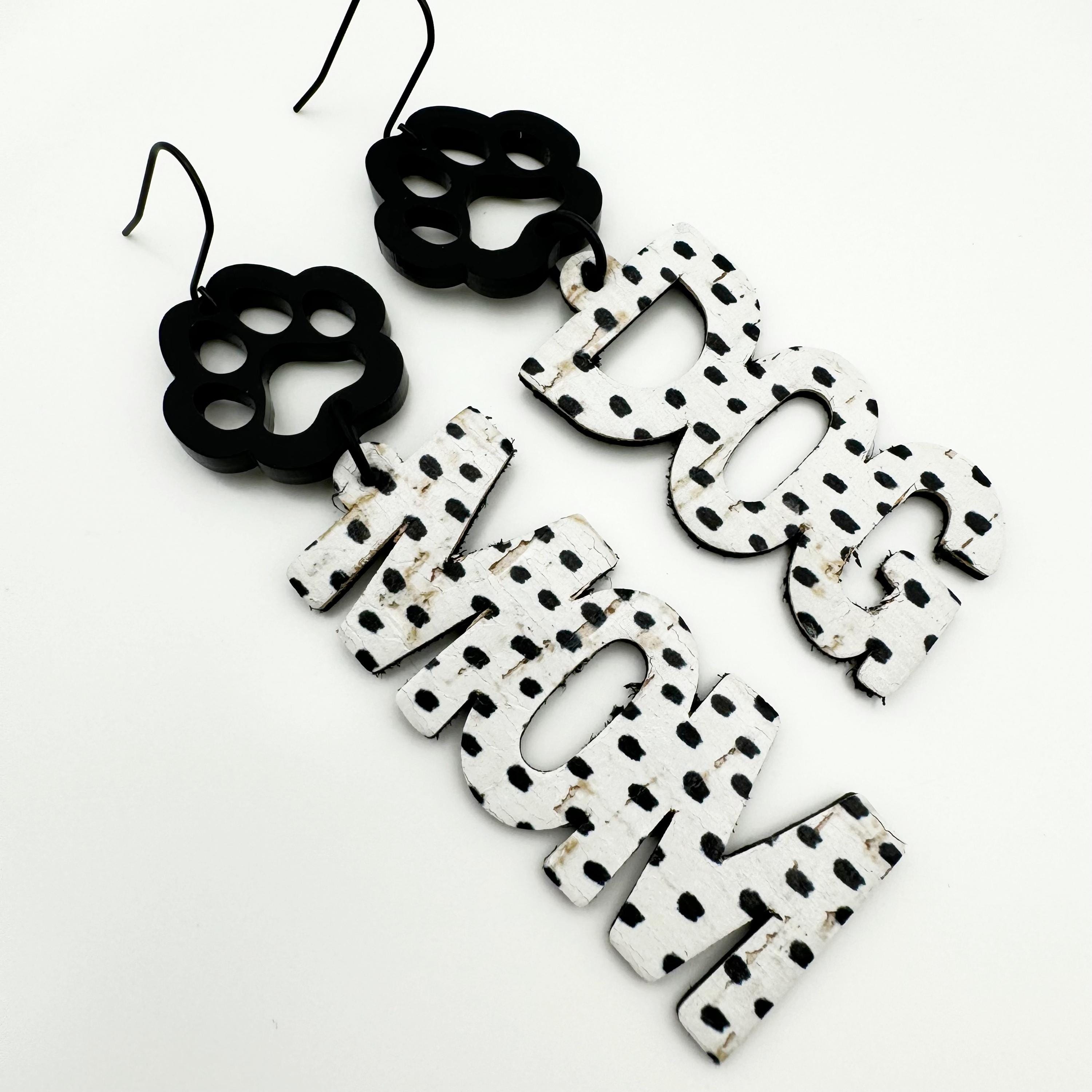 The DOG MOM words are made with a black and white polka dot leather backed cork. The words are attached with a matte black, acrylic paw cut out with stainless steel, black earring findings. The MOM word hangs about 3.5" and the DOG word is slightly shorter.