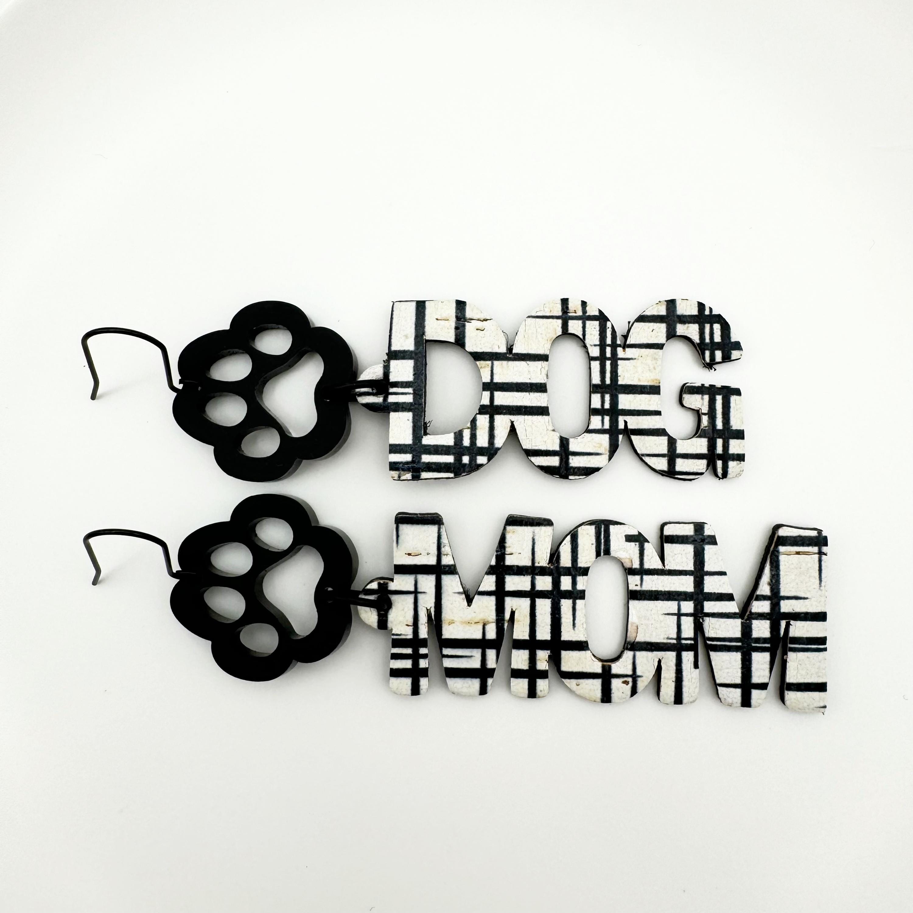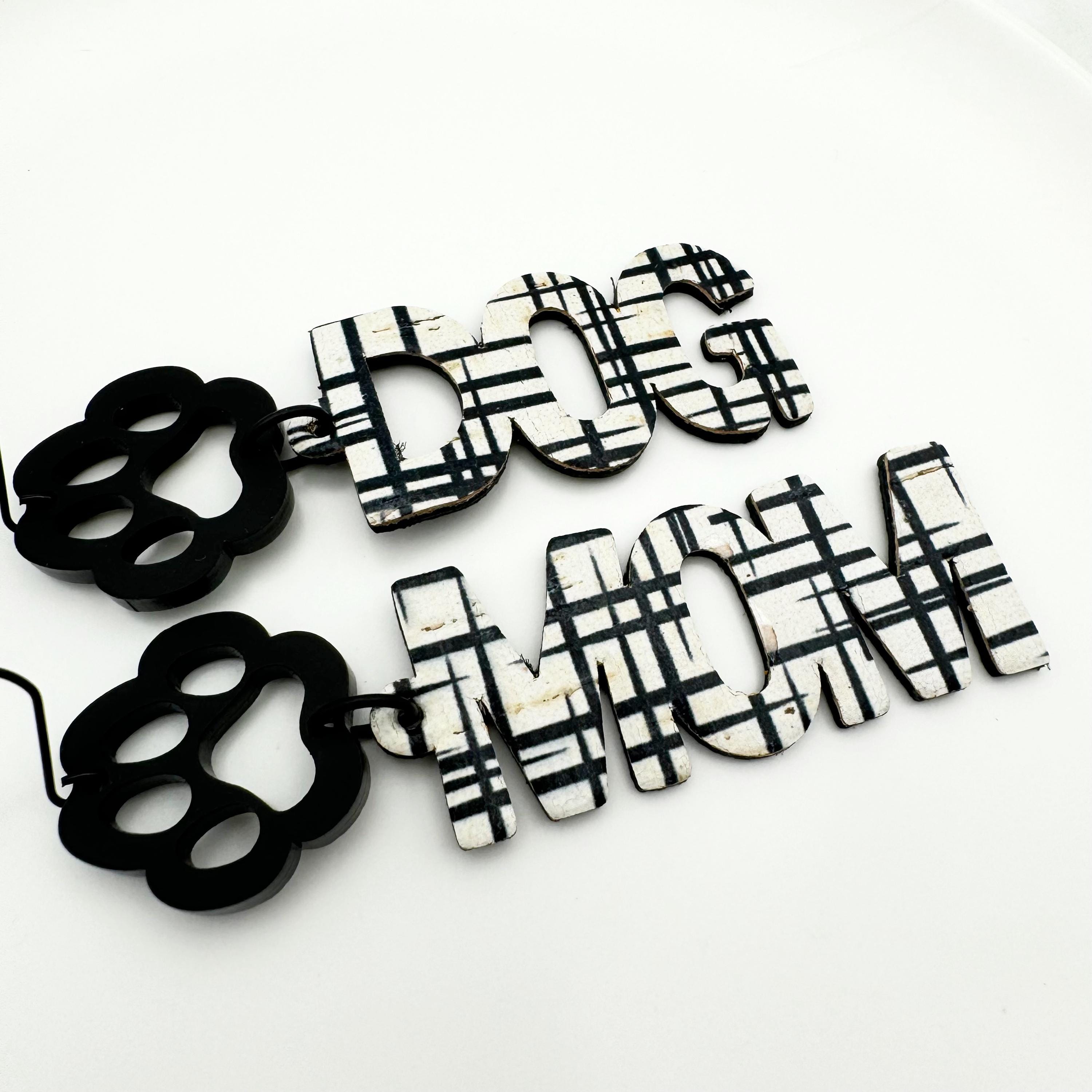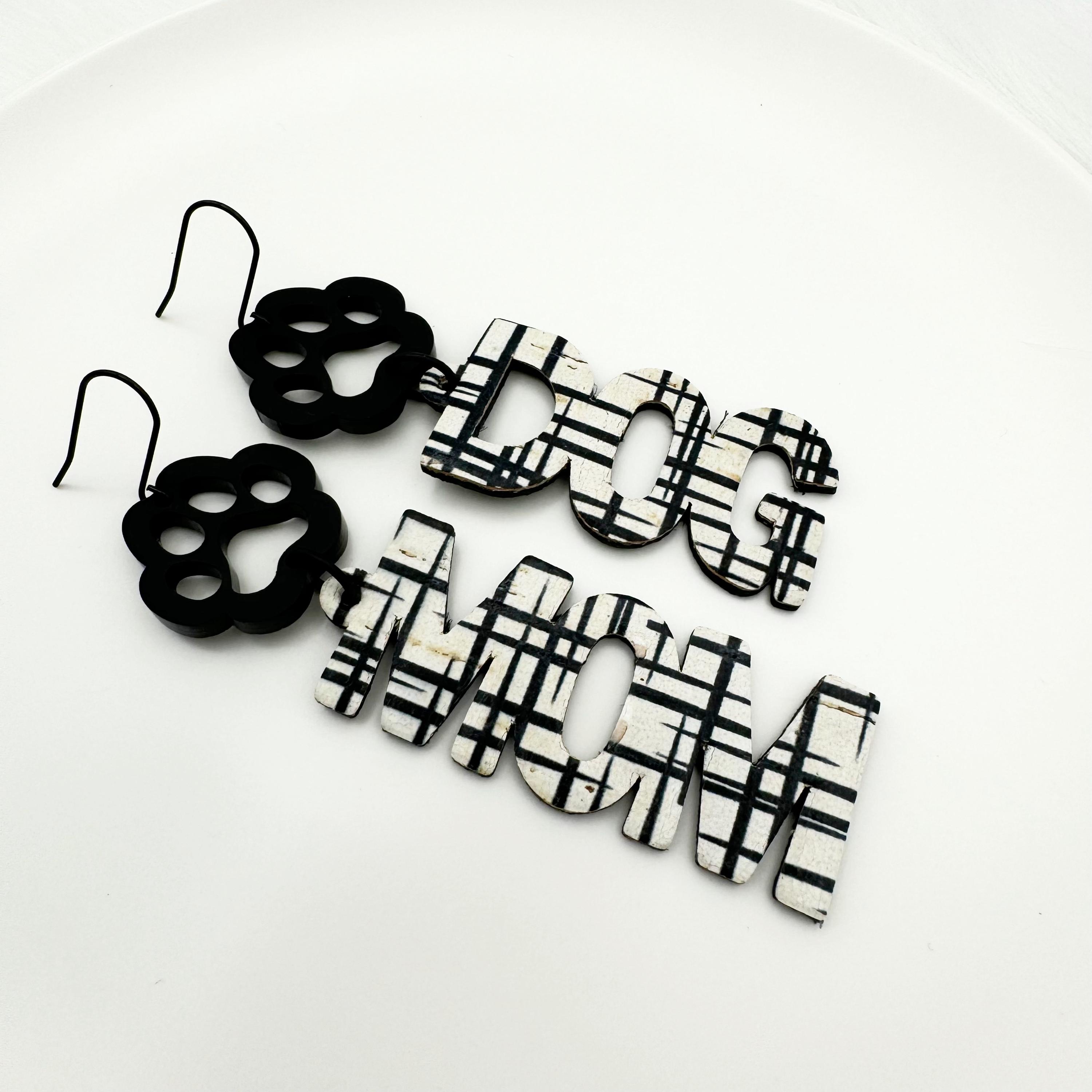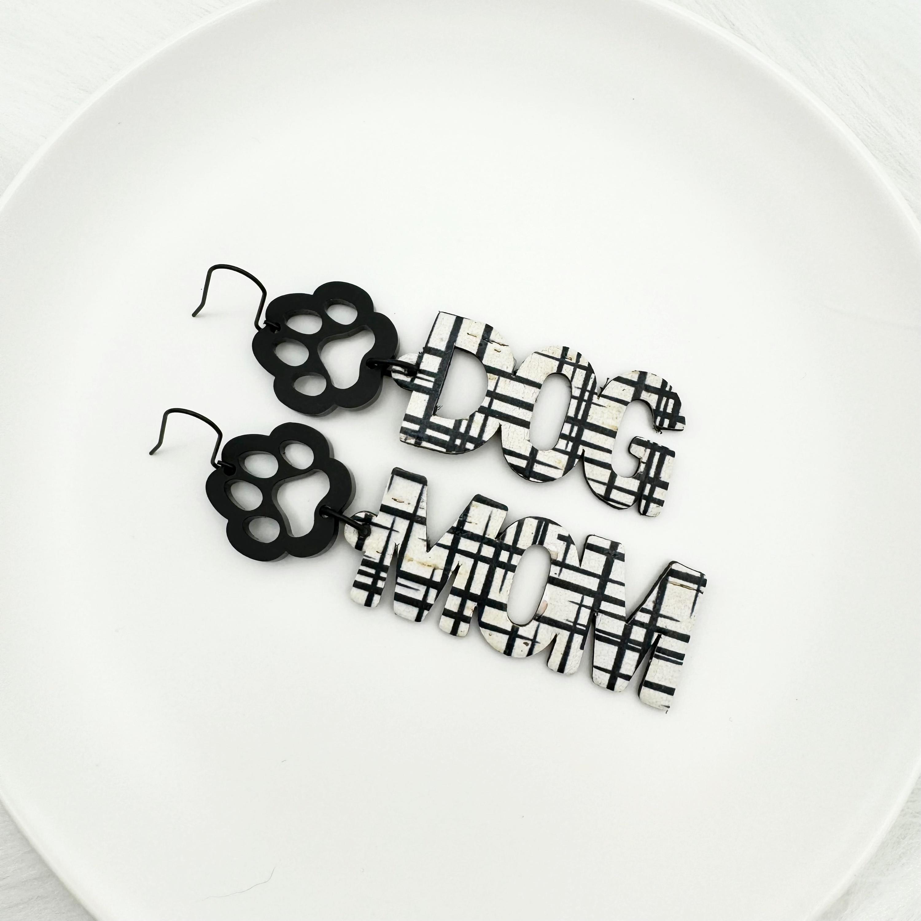 The DOG MOM words are made with a black and white, plaid, check slashes on leather backed cork. The words are attached with a matte black, acrylic paw cut out with stainless steel, black earring findings. The MOM word hangs about 3.5" and the DOG word is slightly shorter.