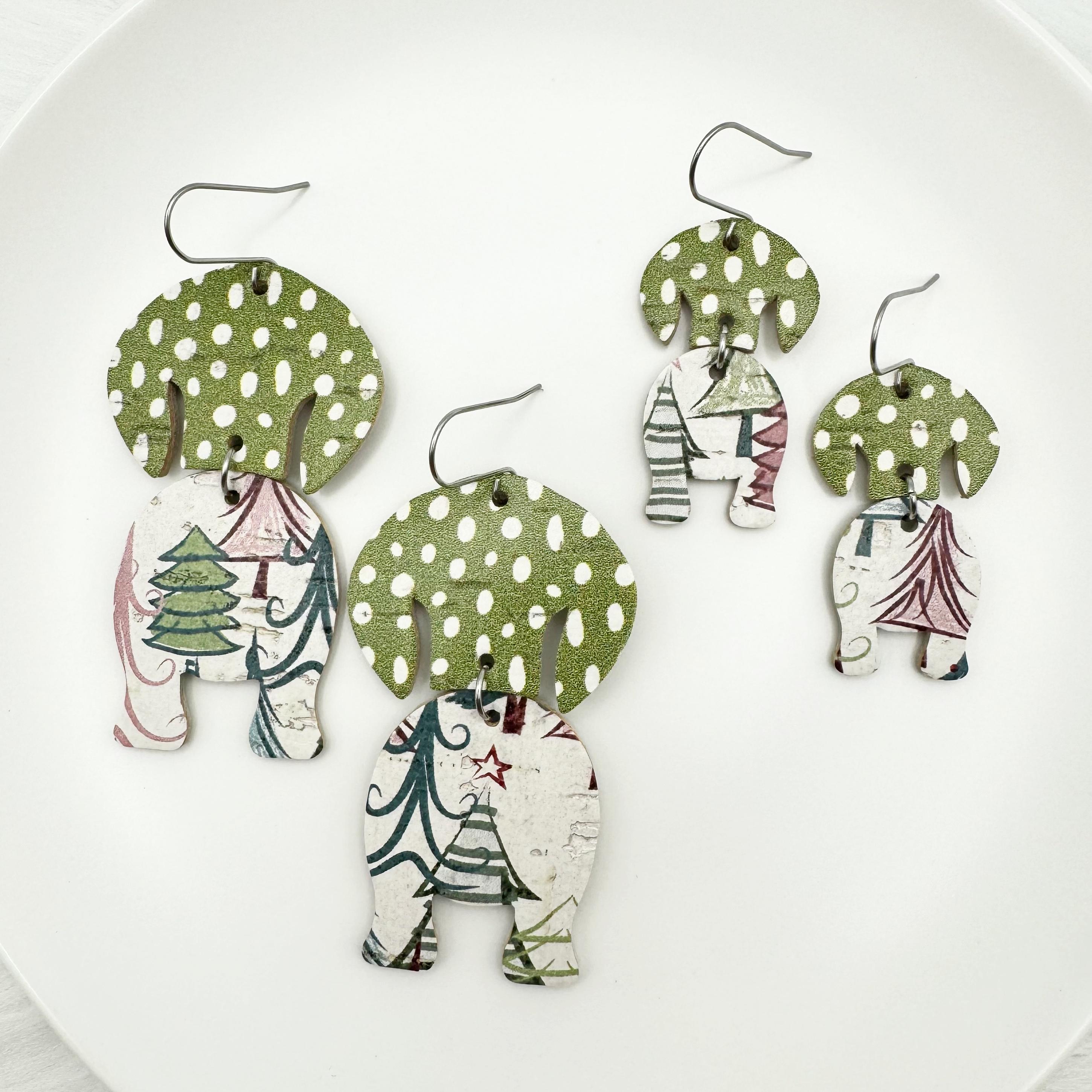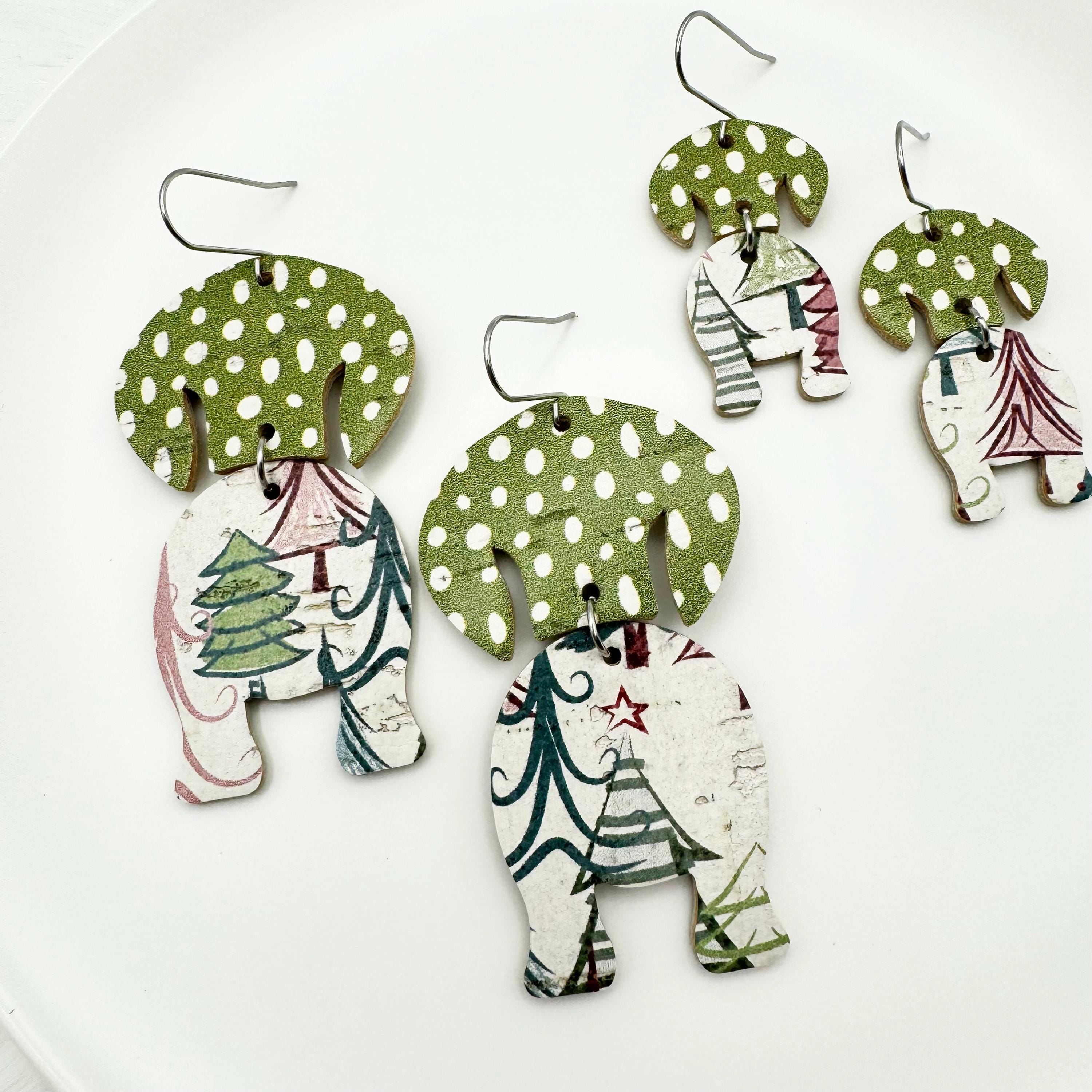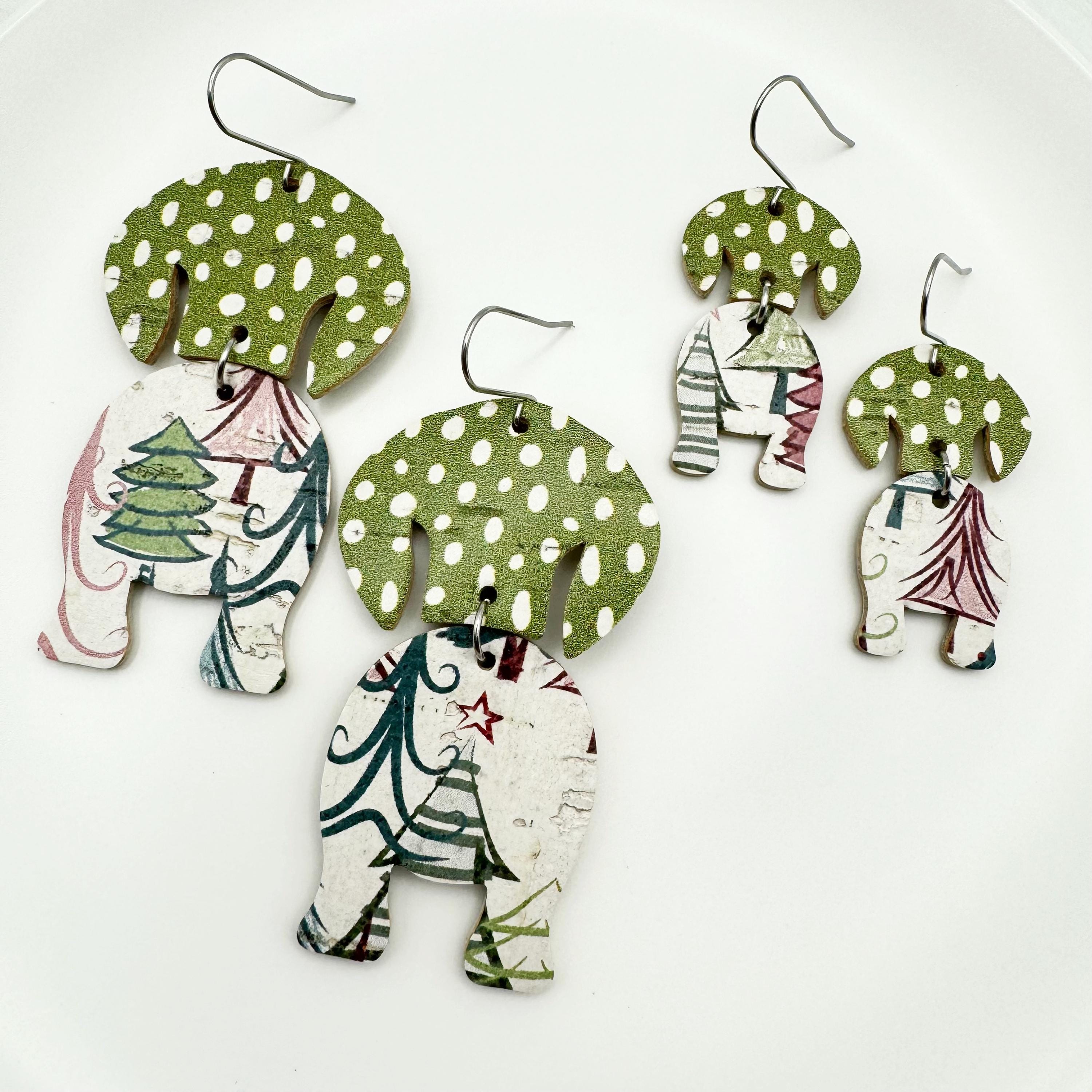 Oh, Christmas Tree! Oh, Christmas Tree! The earrings are made with a stainless silver hook and leather backed cork. The head is a fun, lime green polka dot leather backed cork and the puppy butt is cute, funky Christmas trees on leather backed cork! These are way too cute and Mama hangs about 3 inches and Wiggle Butt Pup hangs about 2.