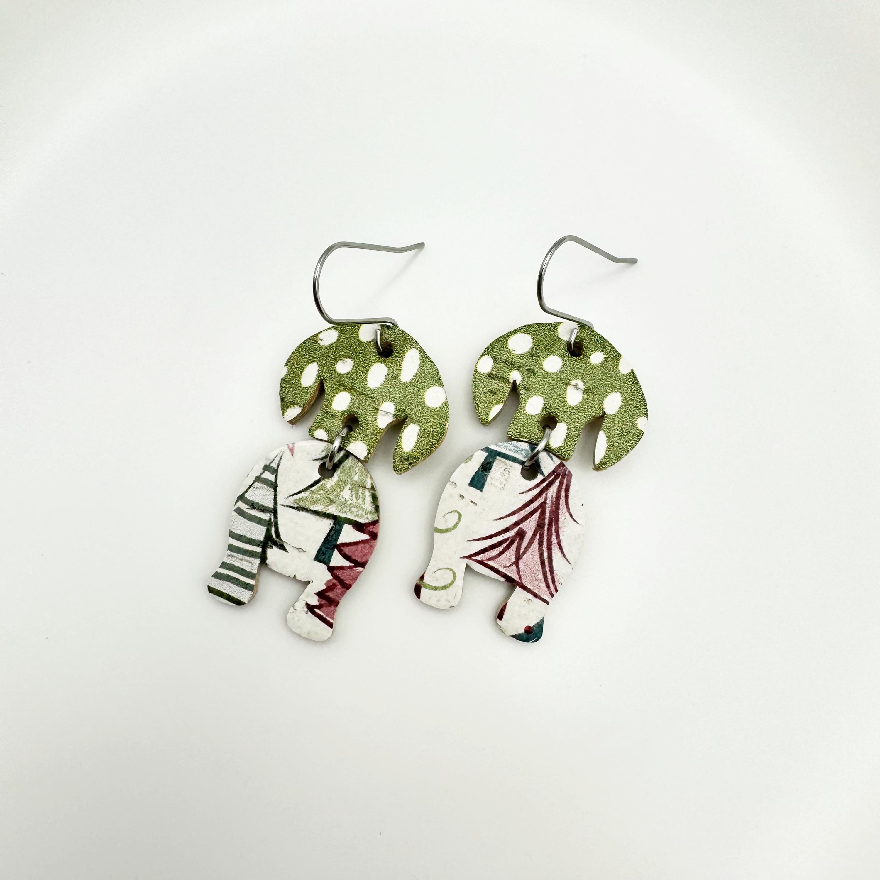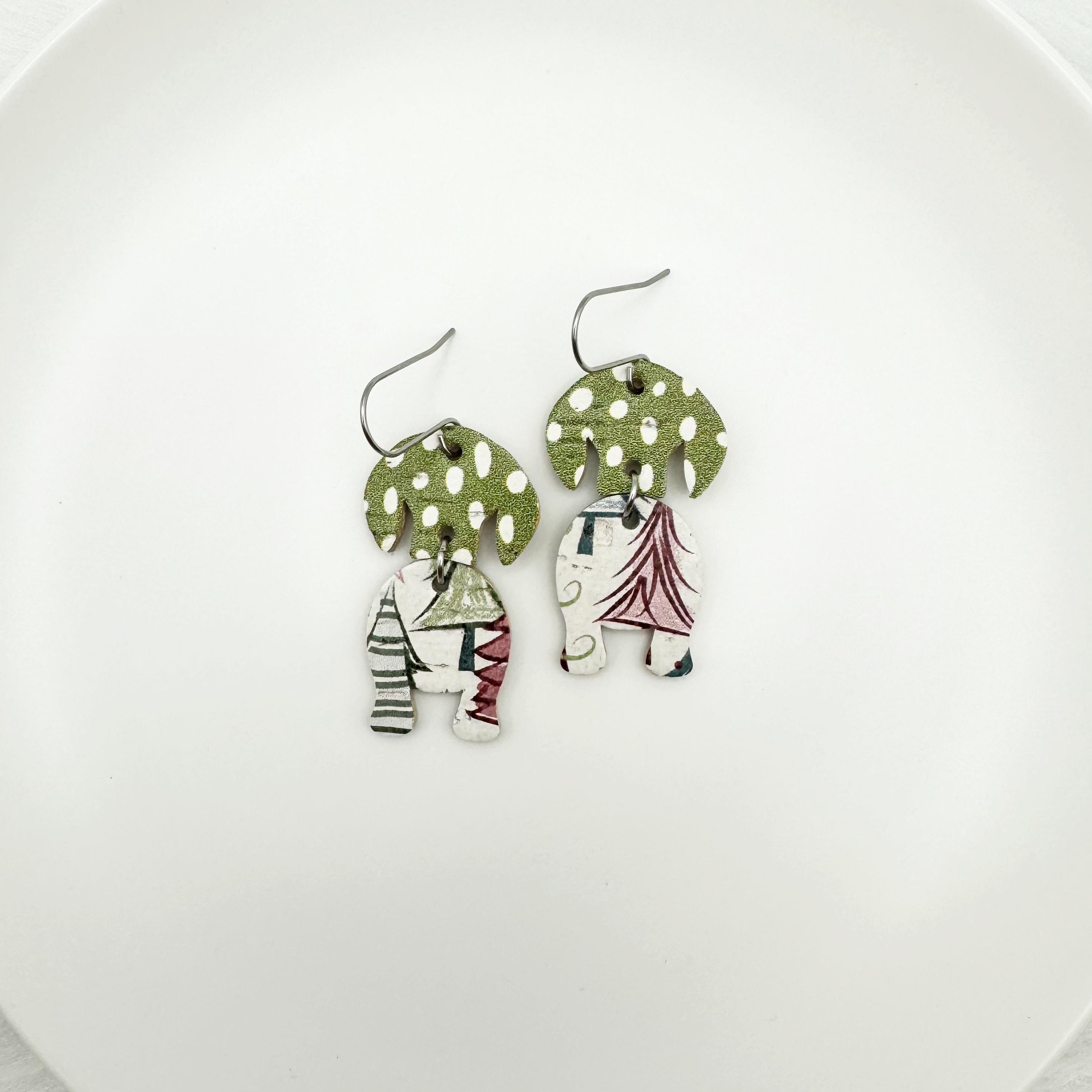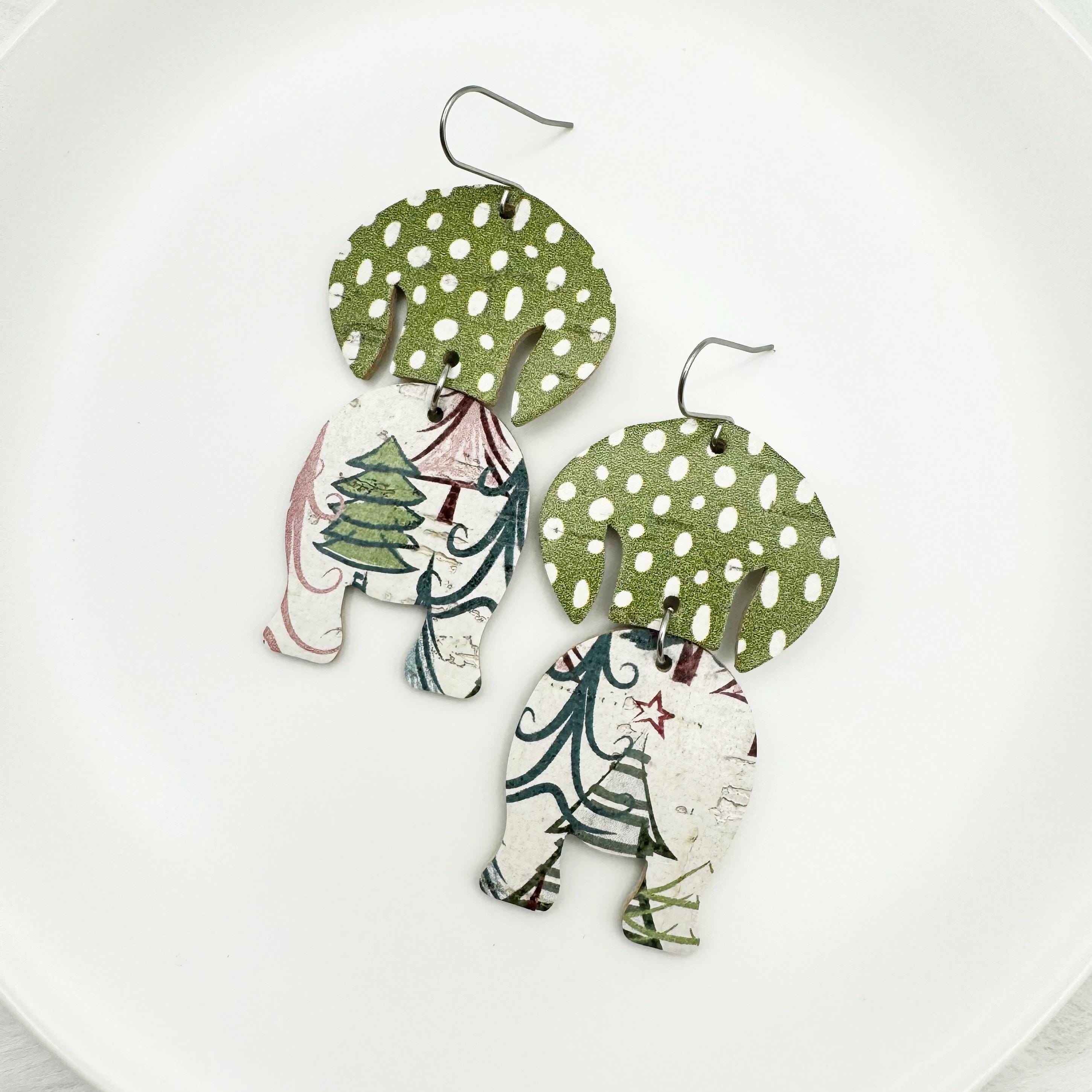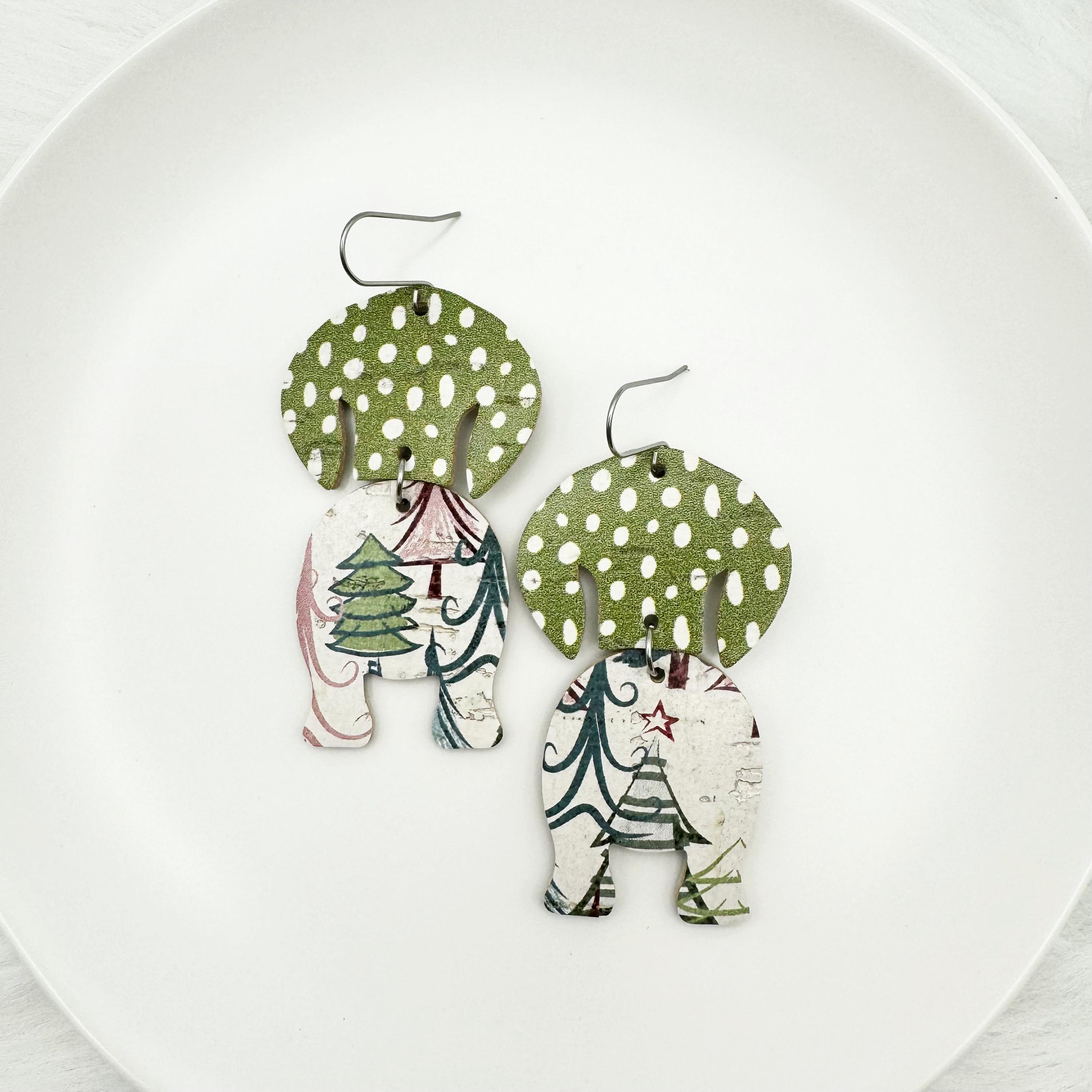 Oh, Christmas Tree! Oh, Christmas Tree! The earrings are made with a stainless silver hook and leather backed cork. The head is a fun, lime green polka dot leather backed cork and the puppy butt is cute, funky Christmas trees on leather backed cork! These are way too cute and Mama hangs about 3 inches and Wiggle Butt Pup hangs about 2.