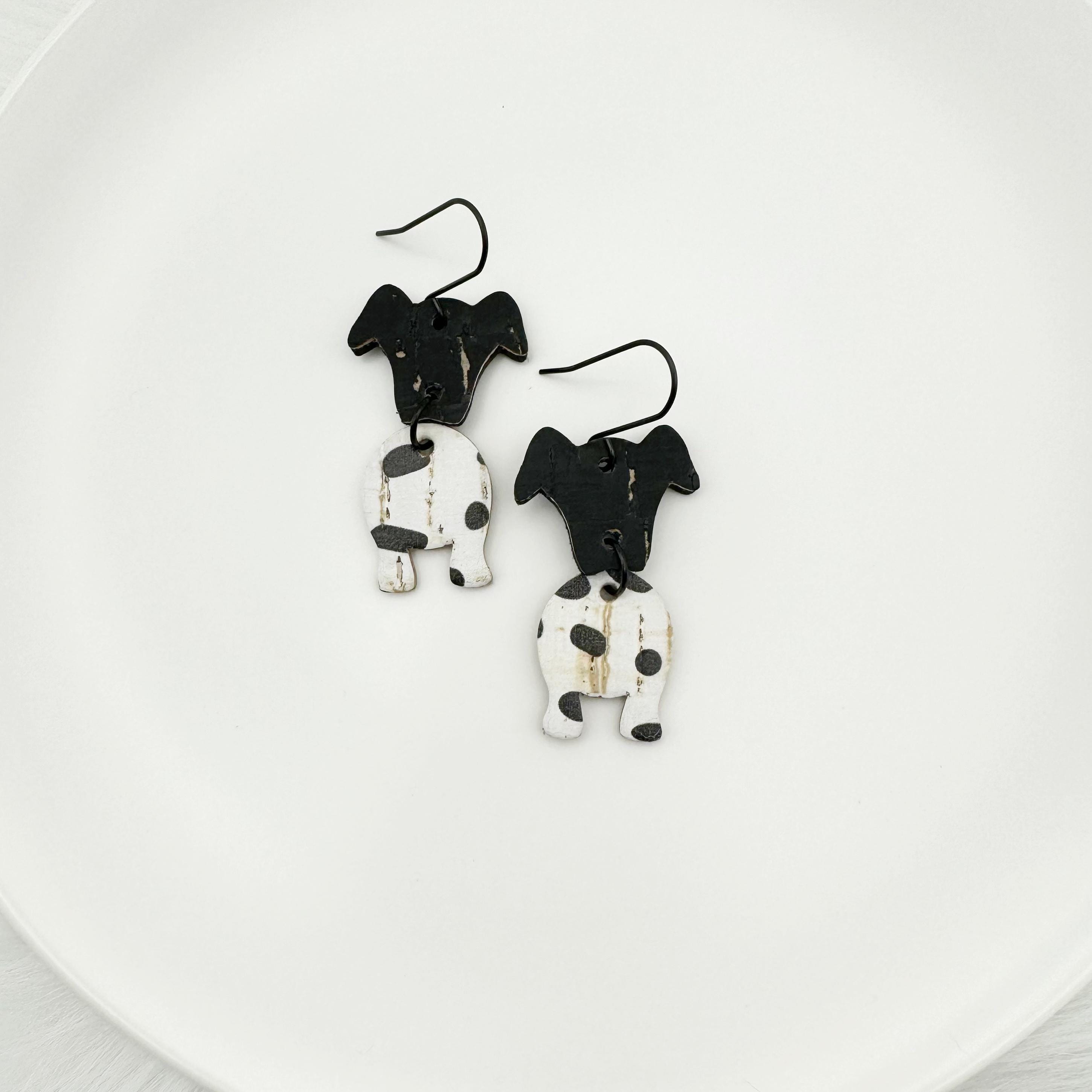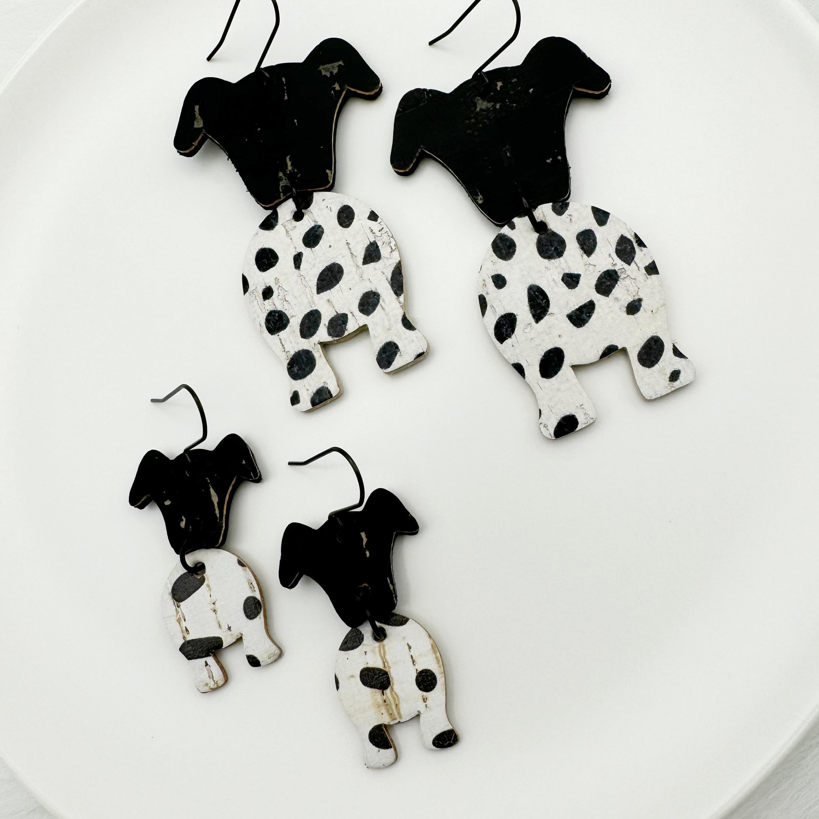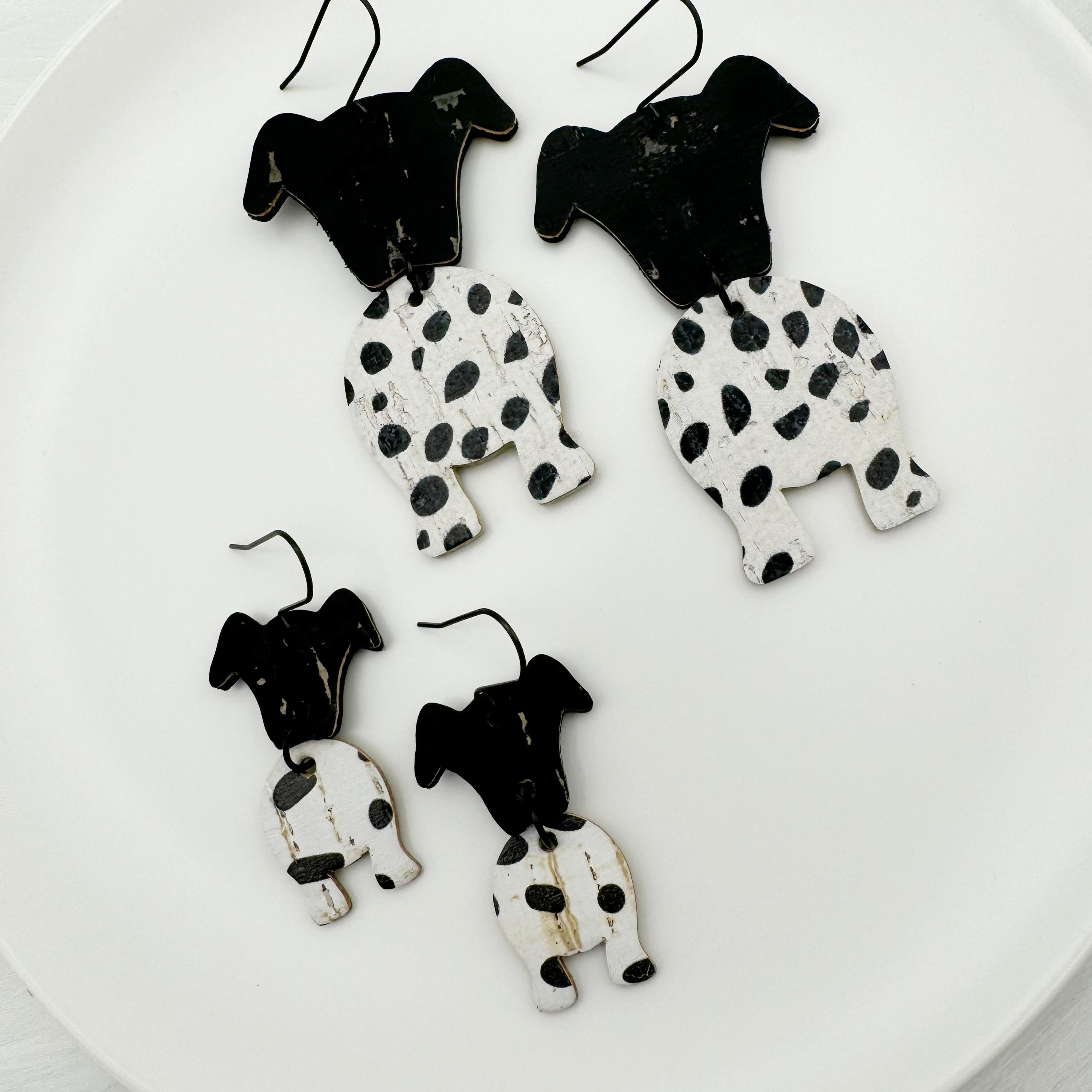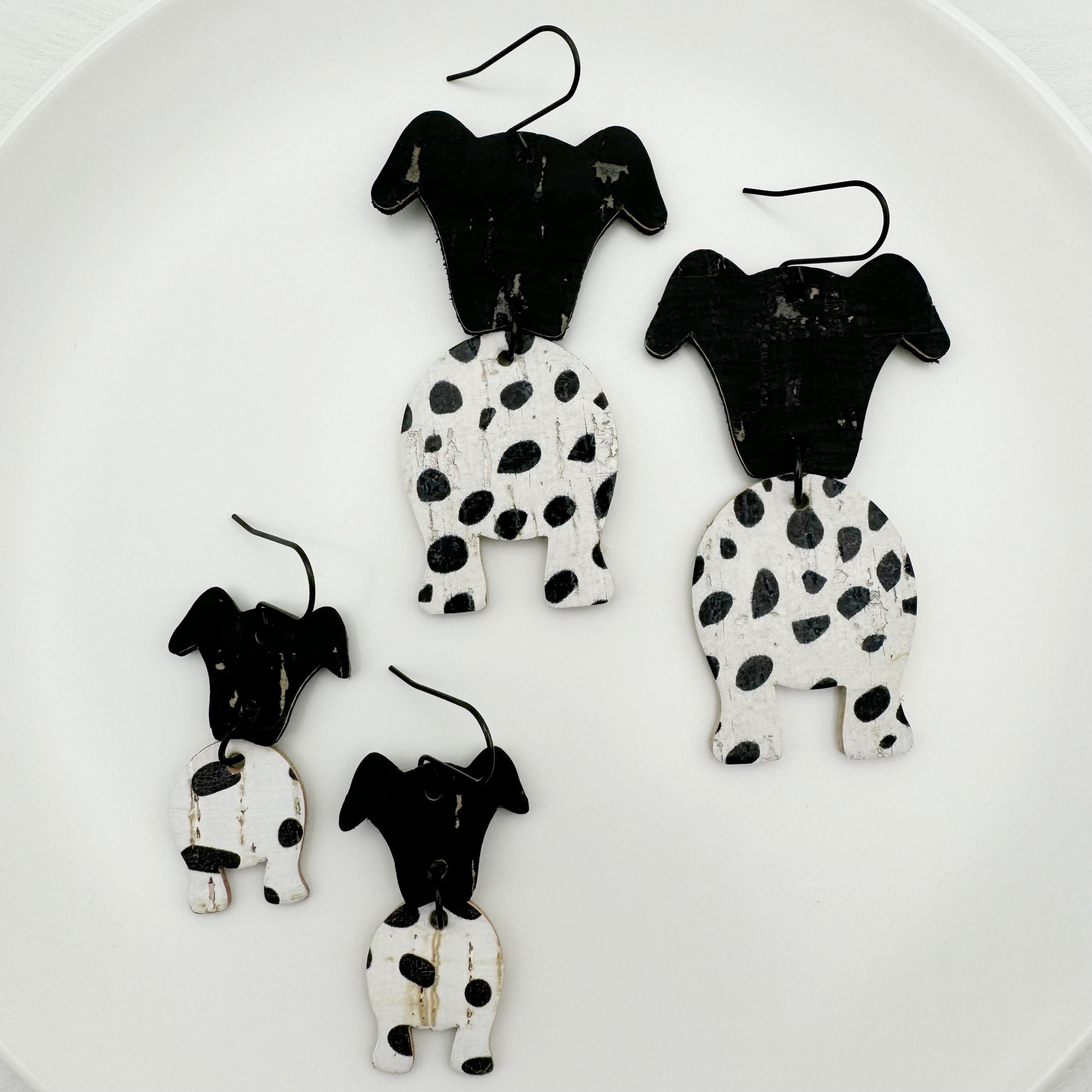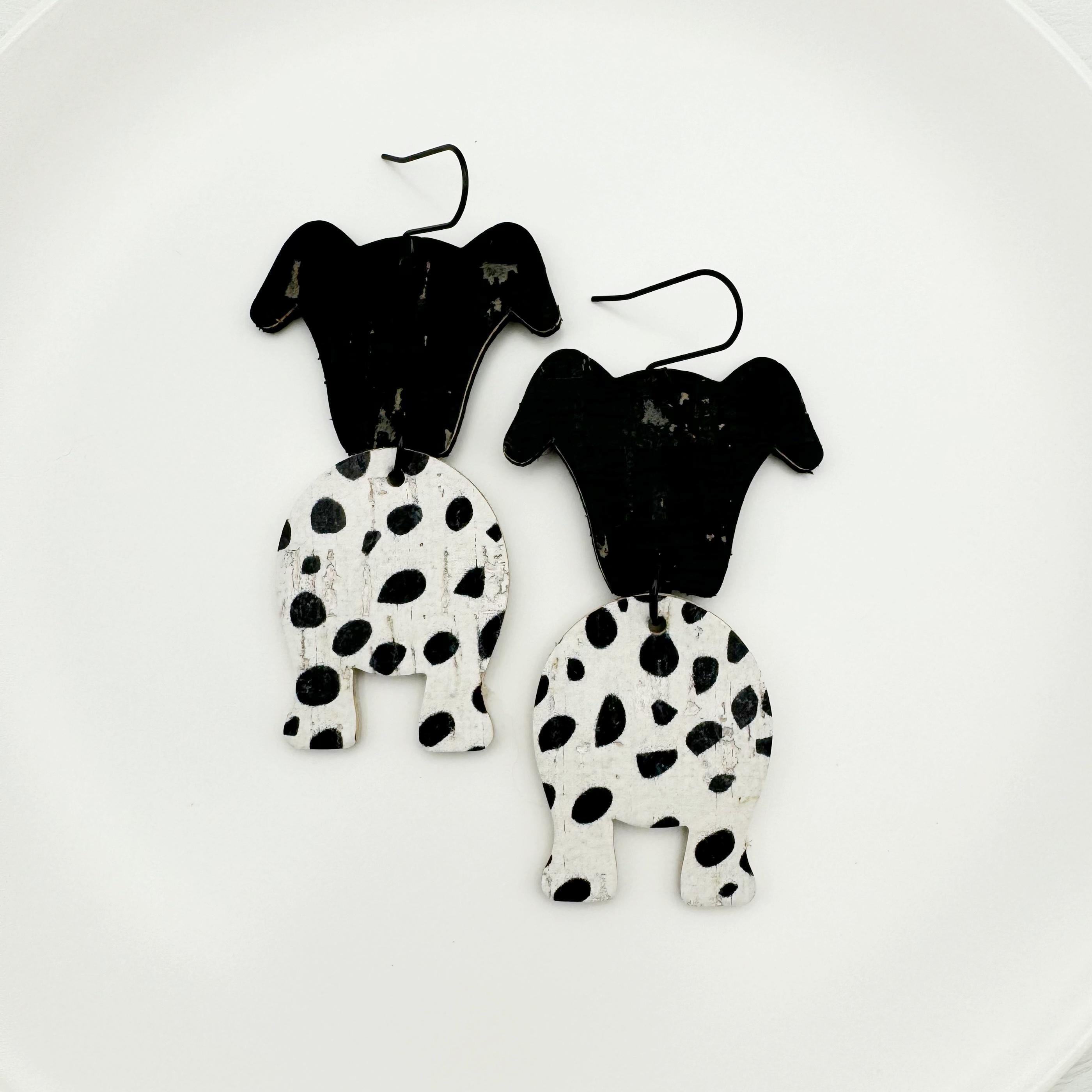 The earrings are made with a stainless black hook and leather backed cork. The floppy eared head is black leather backed cork and the puppy butt is a Dalmatian, polka dot print on leather backed cork! Mama hangs about 3 inches and Wiggle Butt Pup hangs about 2.